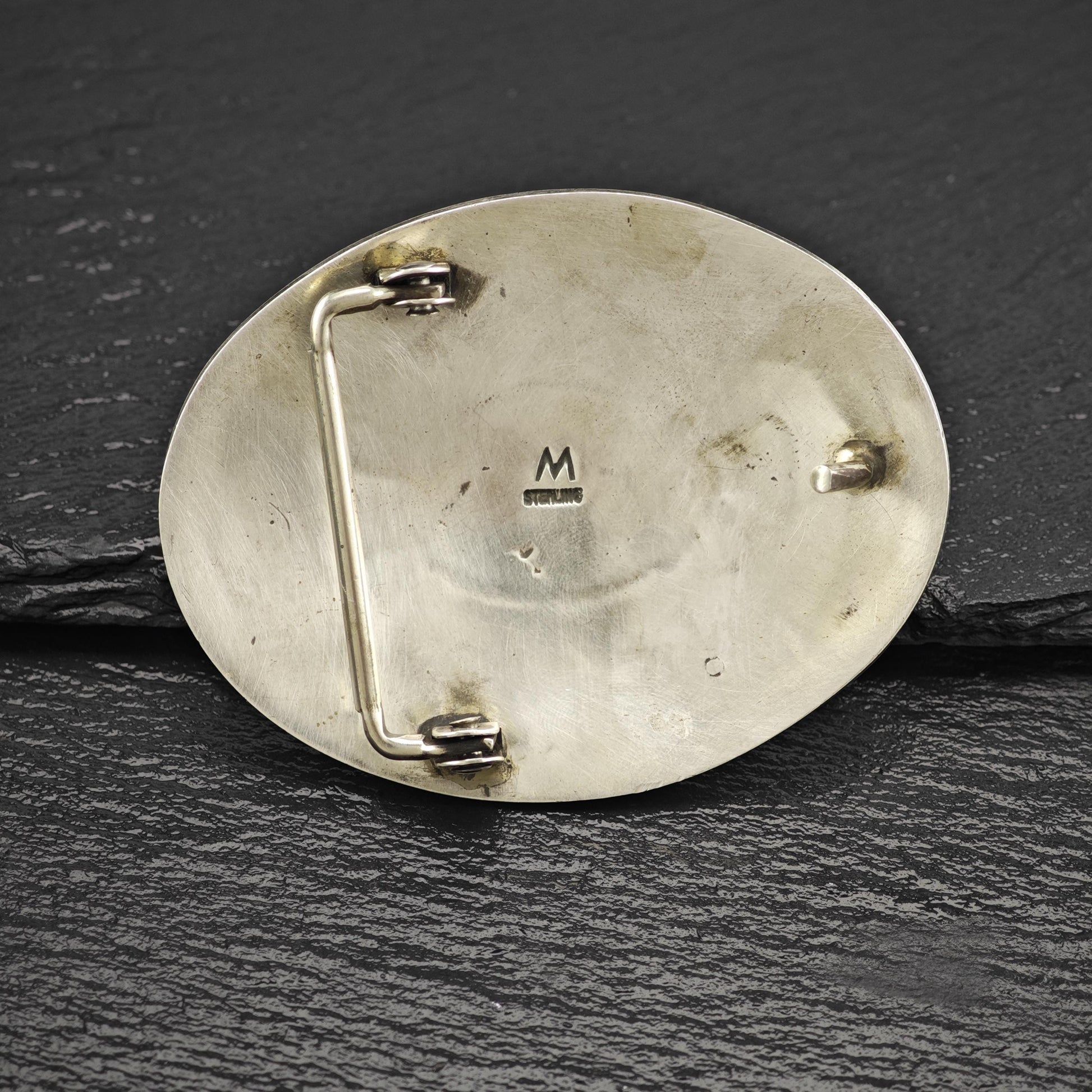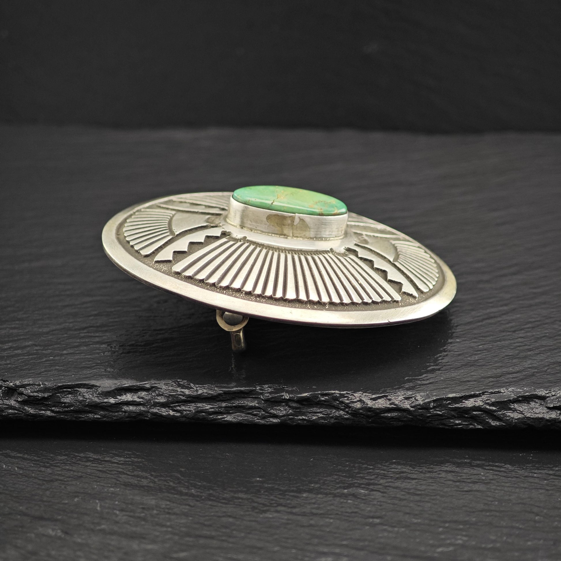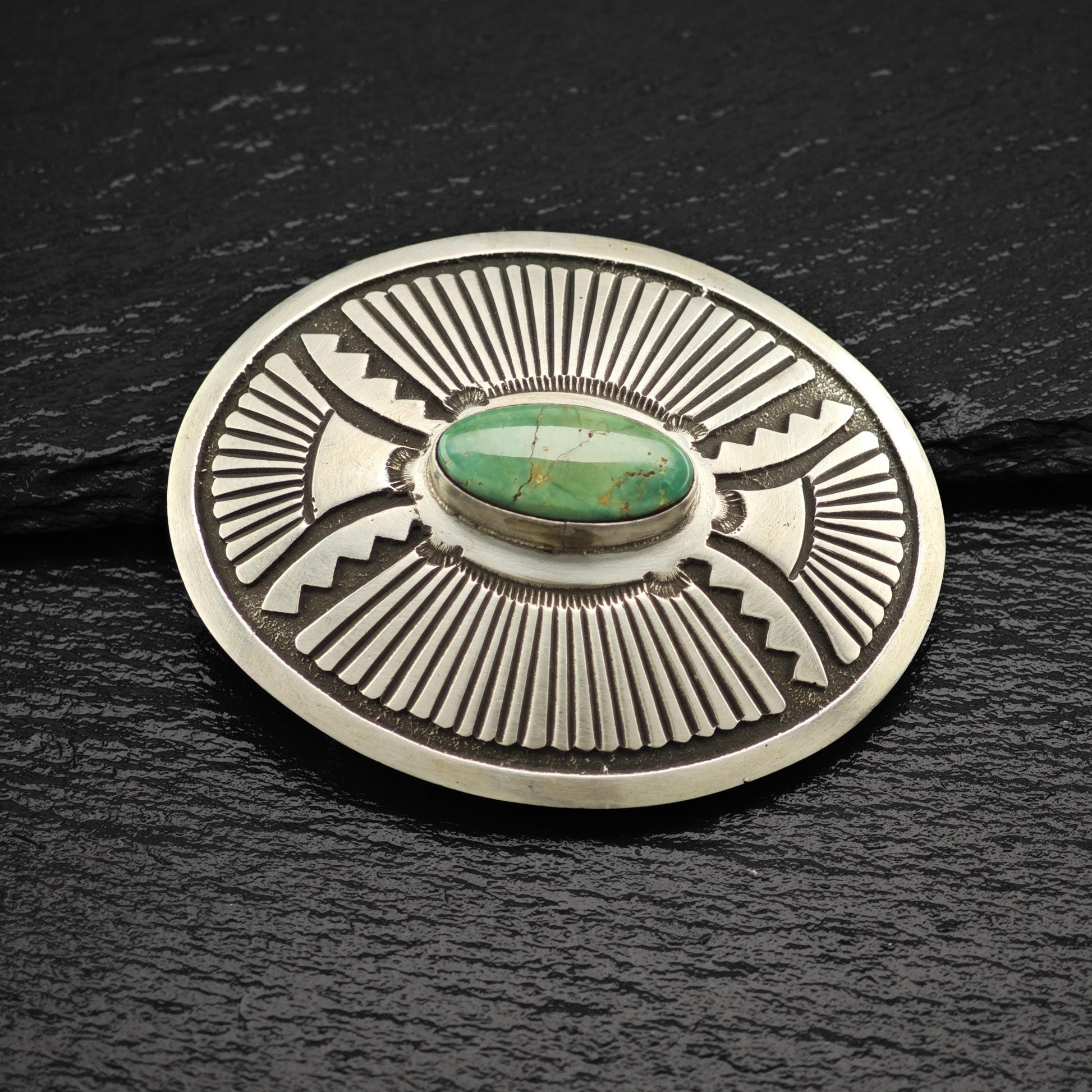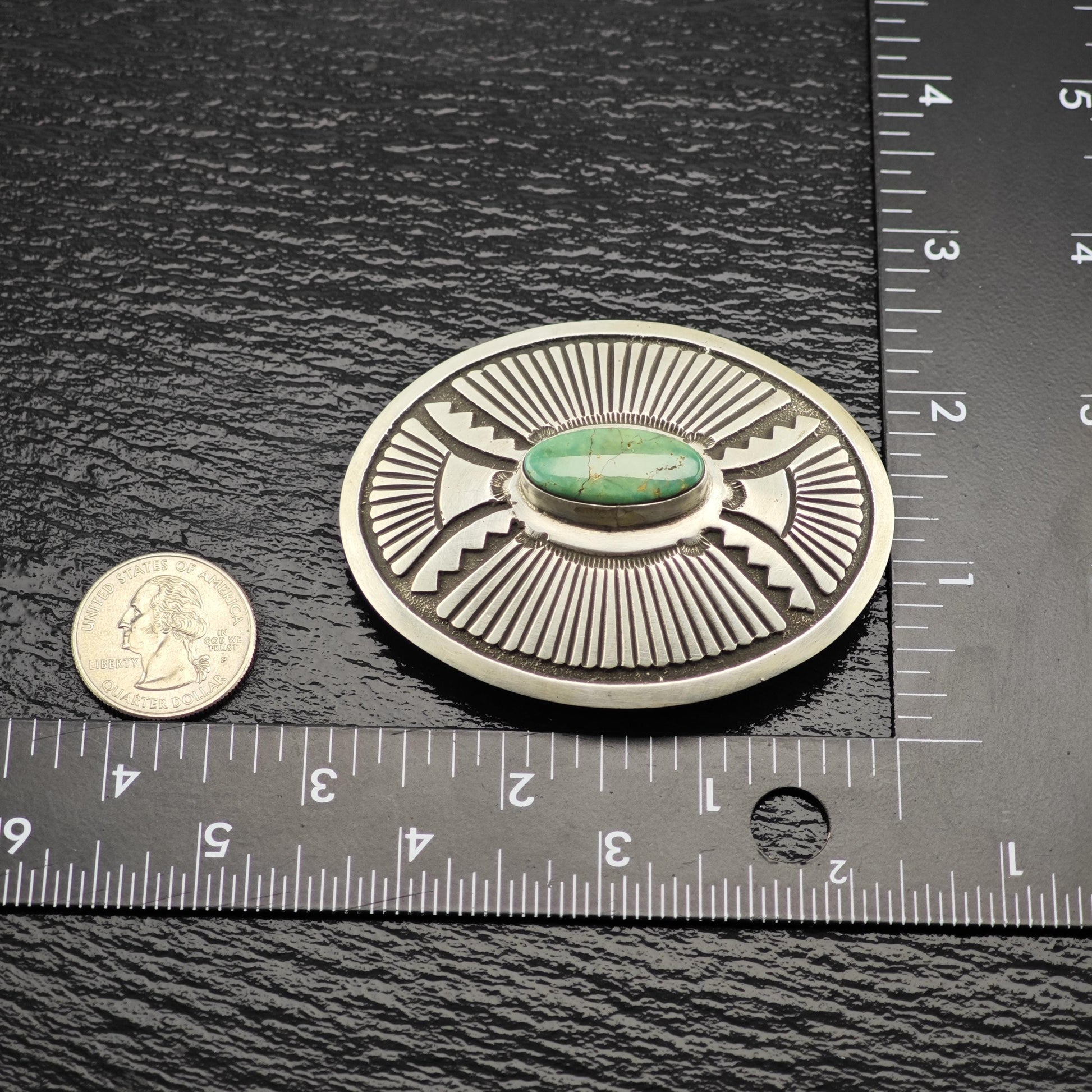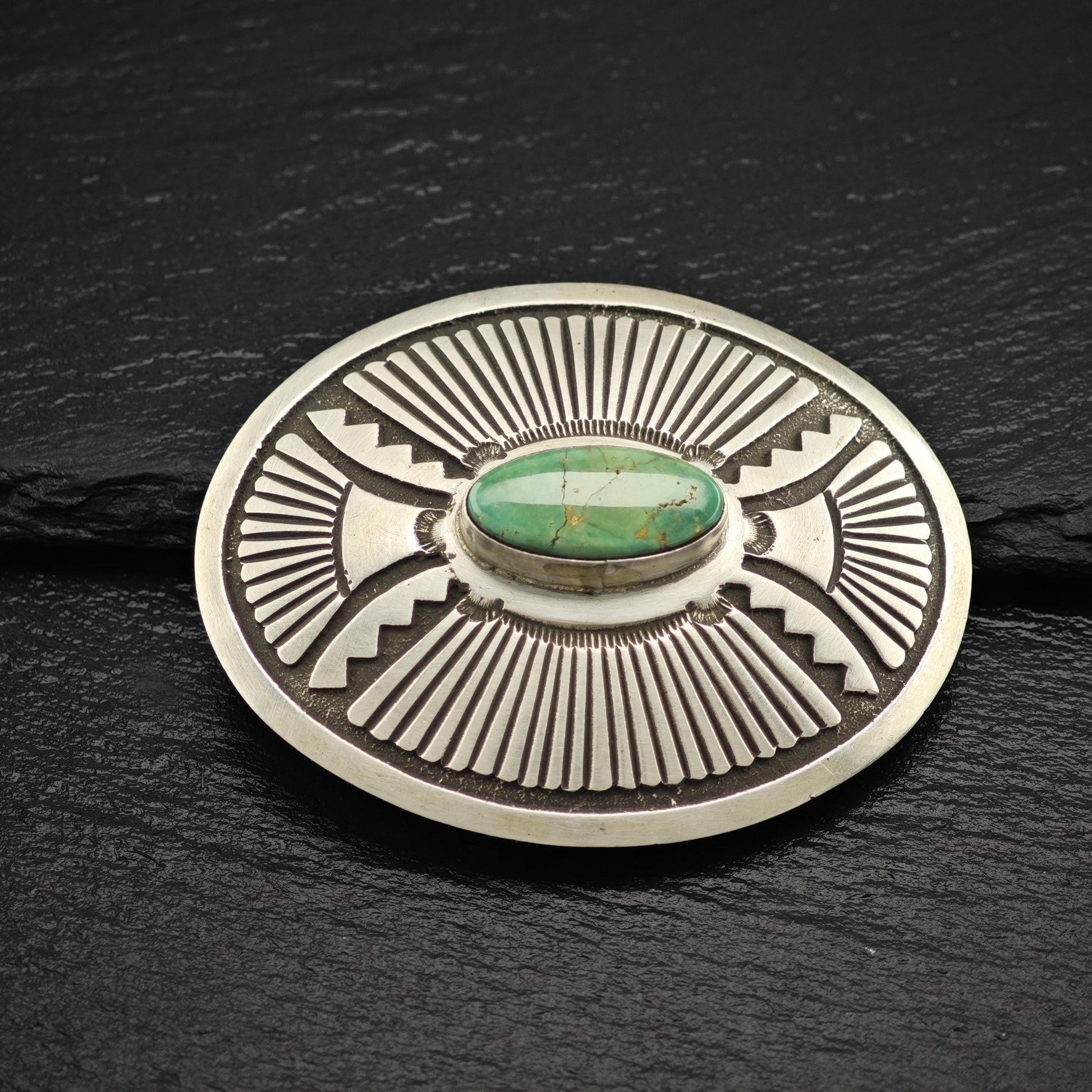 Discover the exquisite craftsmanship of this Green Turquoise Belt Buckle by renowned Native American artist Henry Morgan. Made from high-quality sterling silver, this unique piece weighs 50.3 grams and dates back to circa 1980.