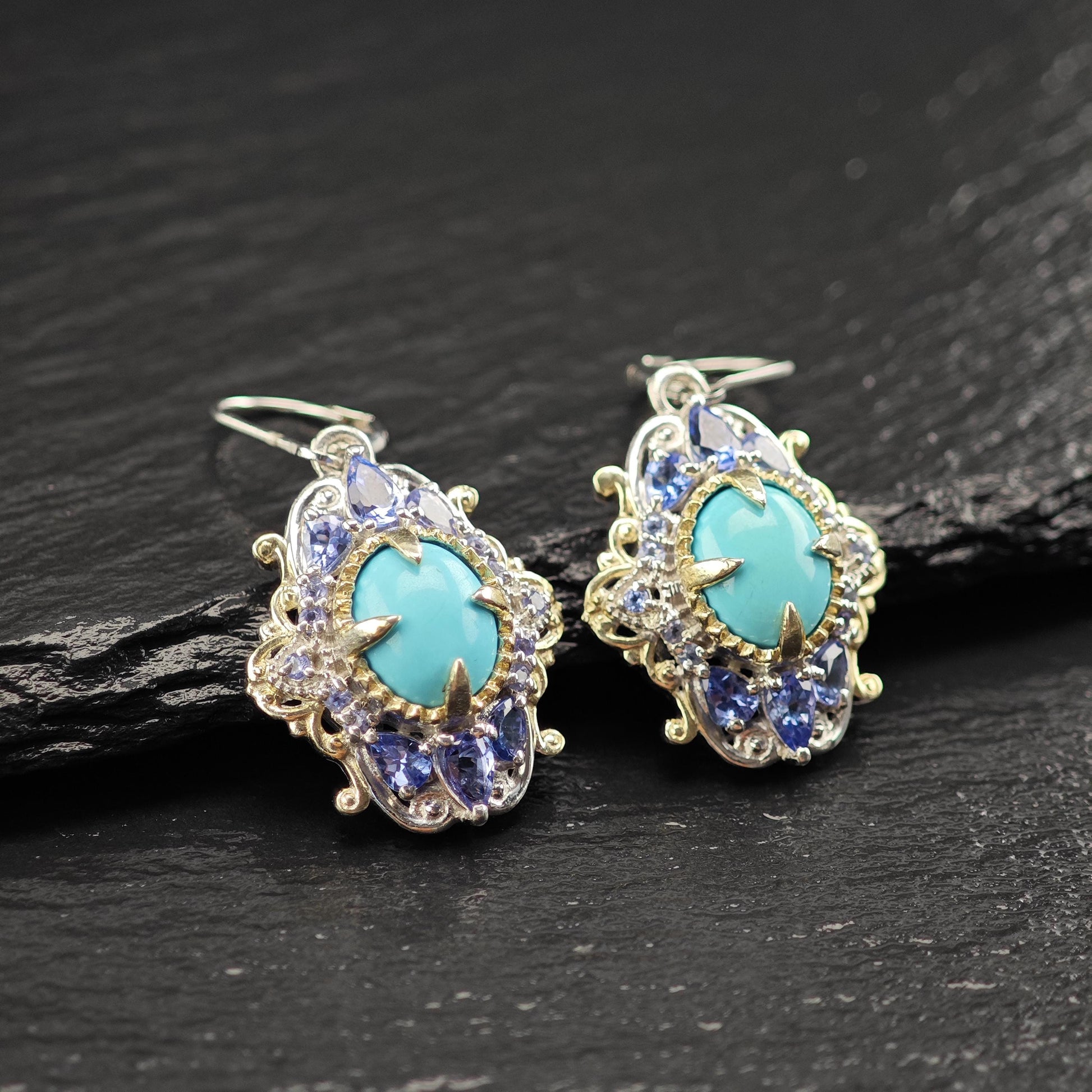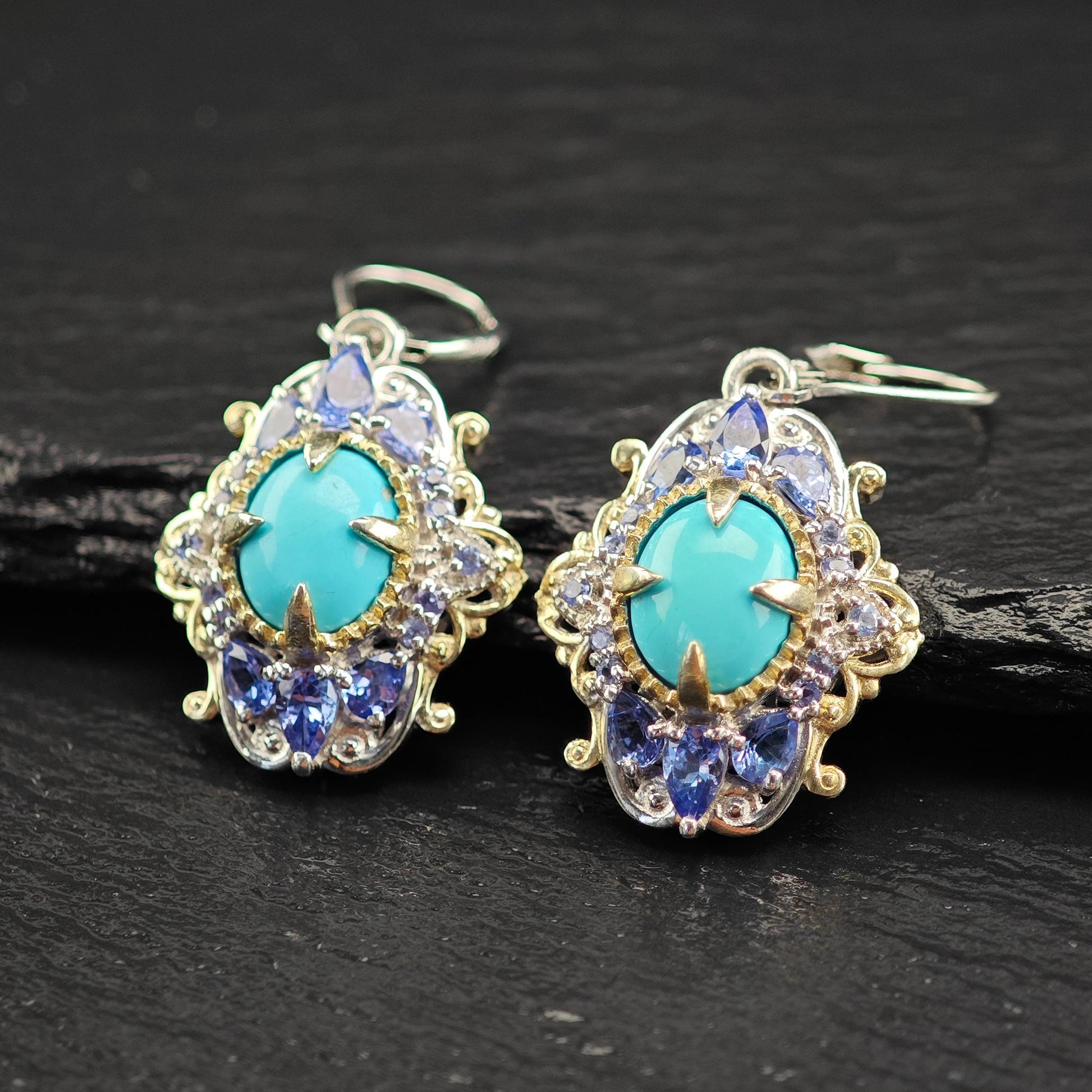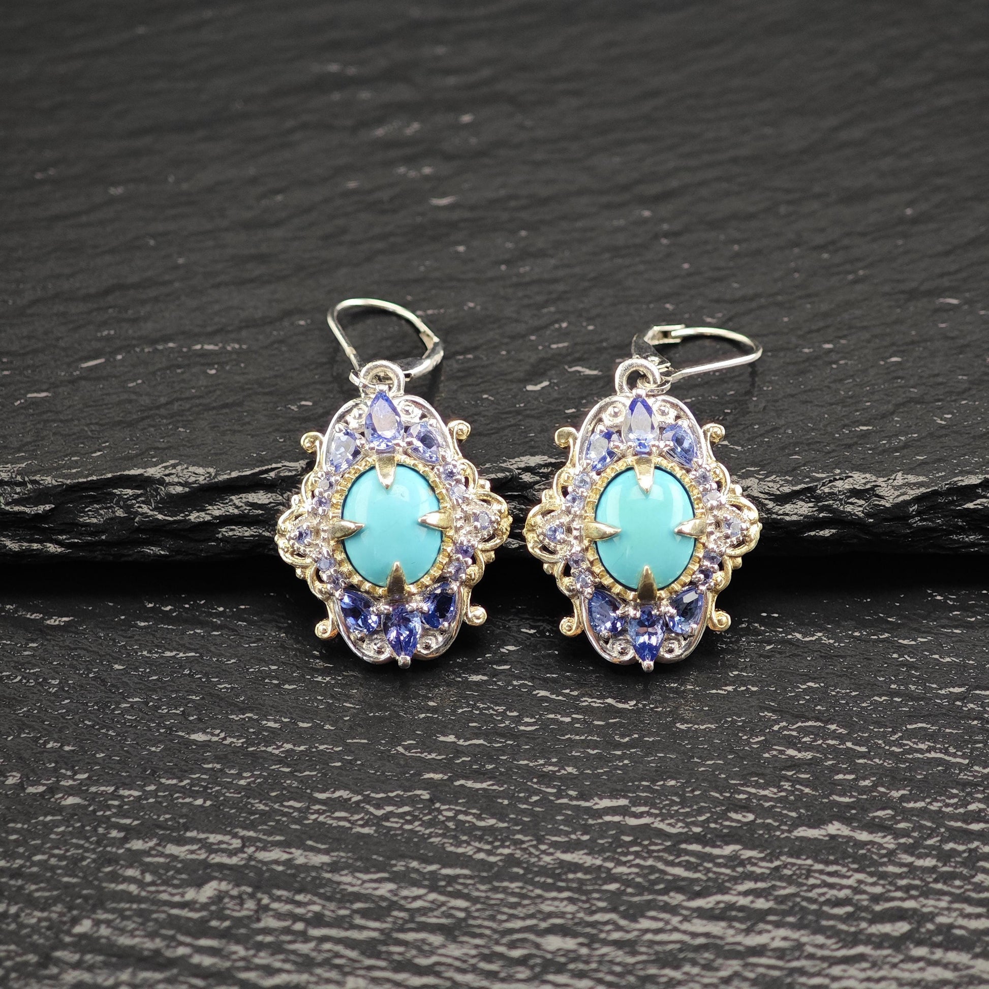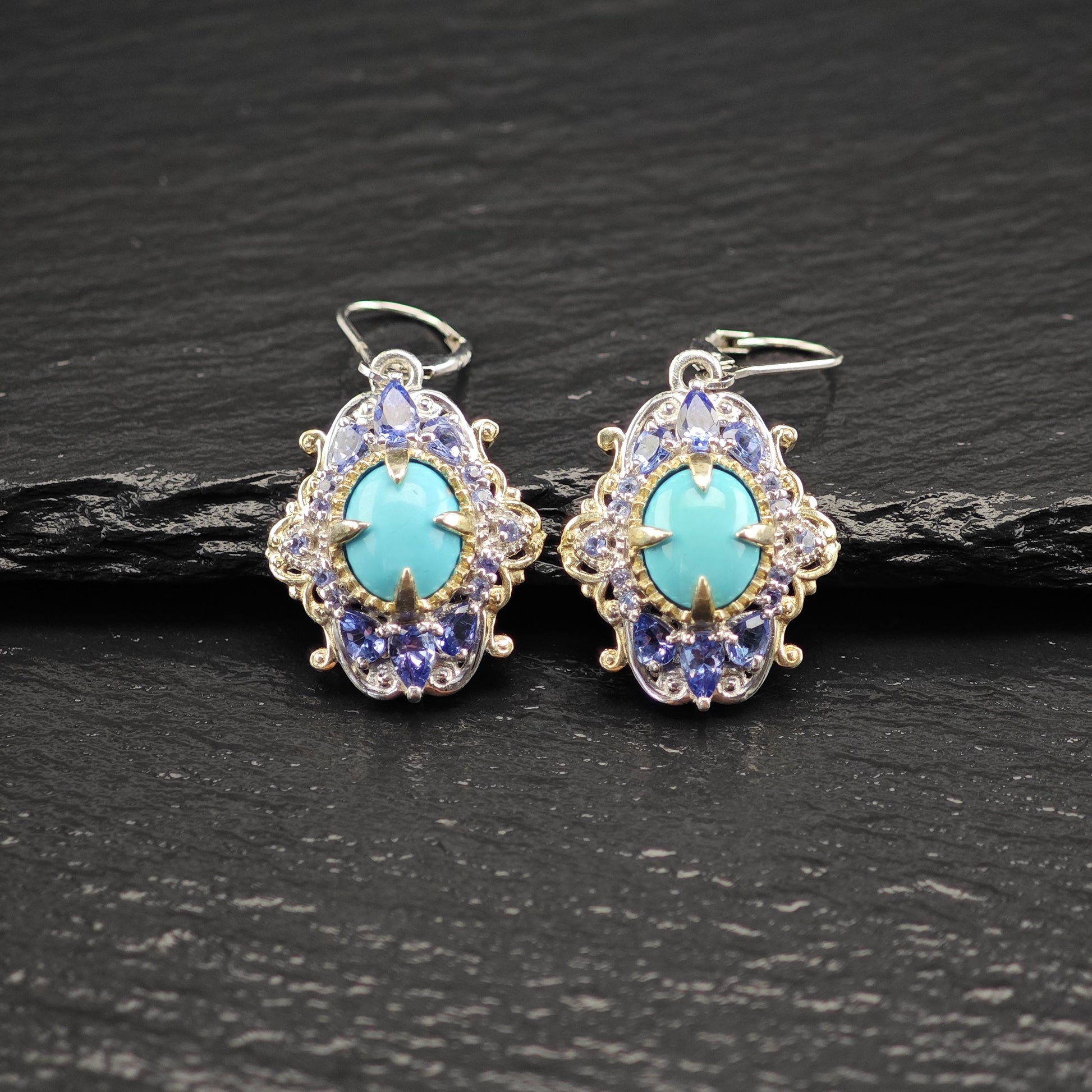 Discover the elegance of these vintage sterling silver earrings, measuring 1 inch in length and 3/4 inch in width. Weighing 10.6 grams, these earrings showcase a stunning multi-color design featuring natural turquoise and tanzanite stones. The stones are expertly cut, with measurements of 7.9 x 9.2 mm, and have received industry-standard treatments, if applicable.