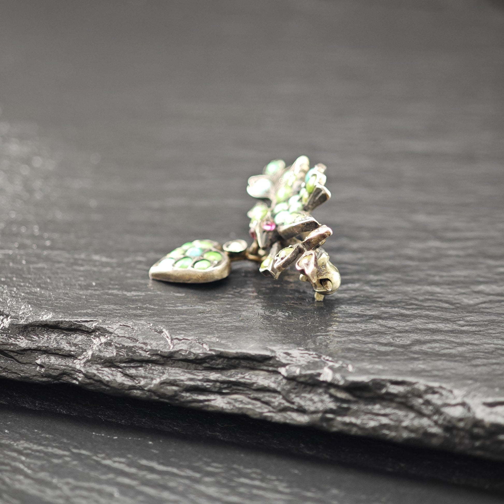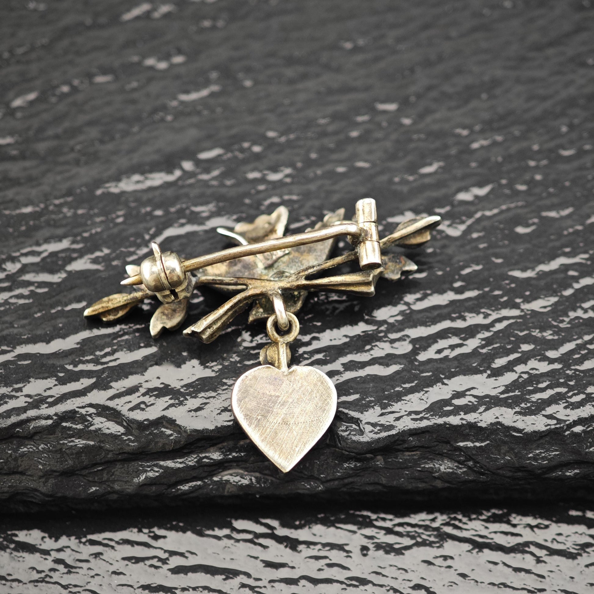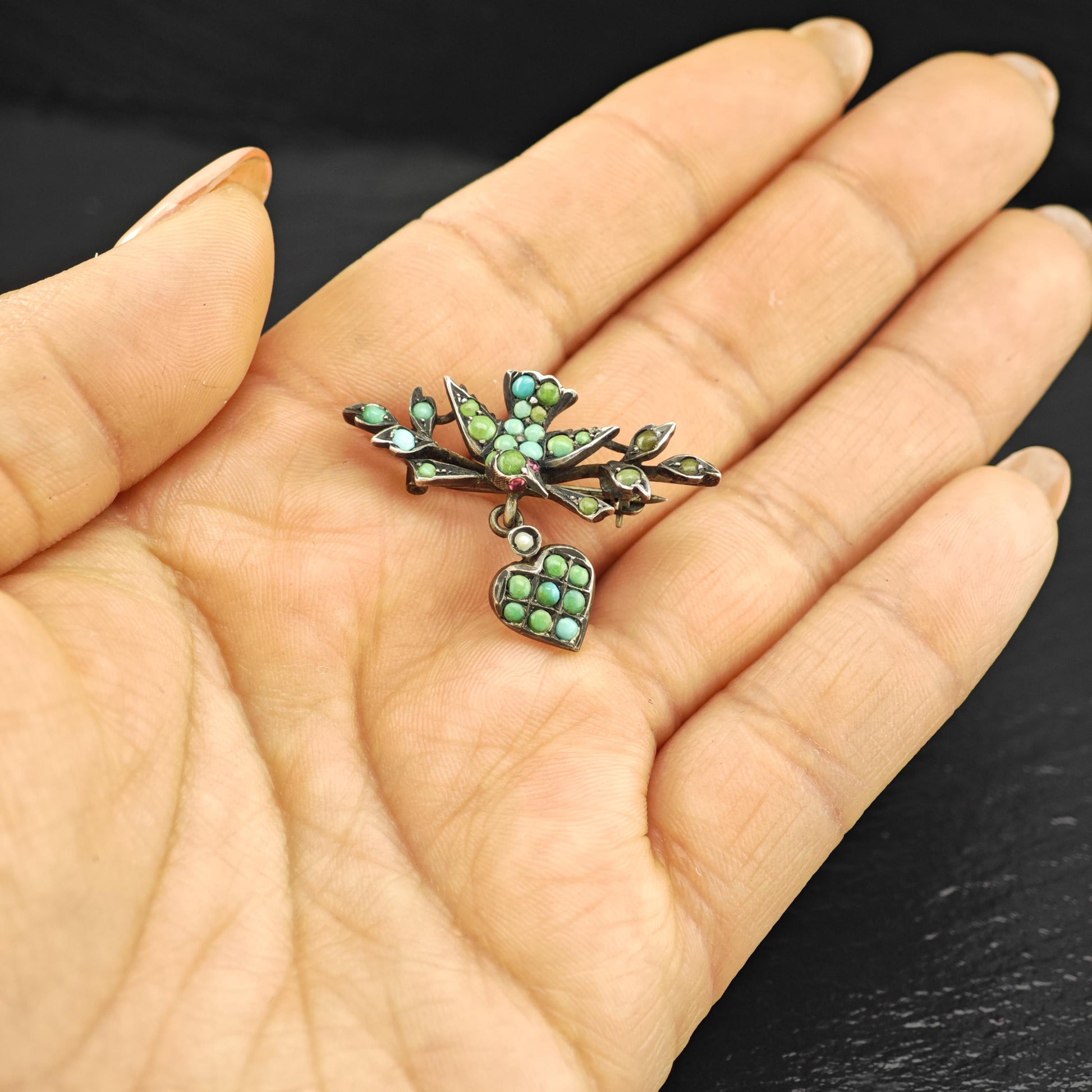 Victorian, Antique Bird, Heart Blue, Green Turquoise, Pink Ruby Brooch Sterling Silver