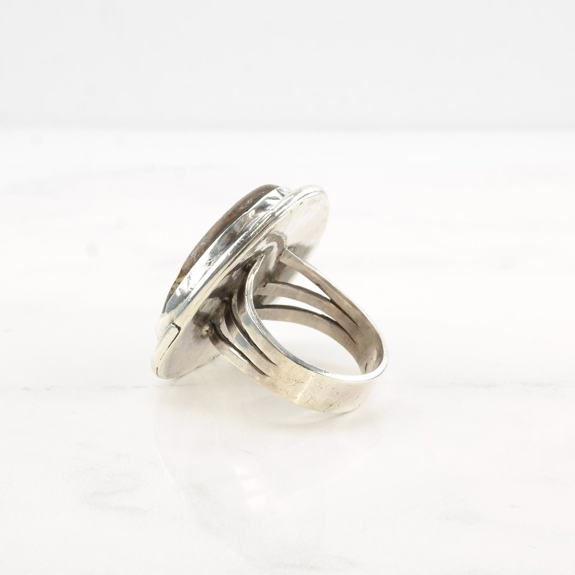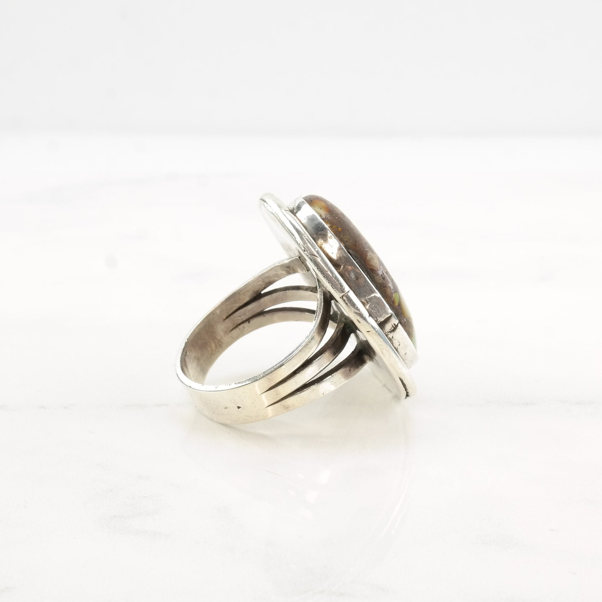 The condition of this ring is Estate, Good, moderate patina, chipped stone