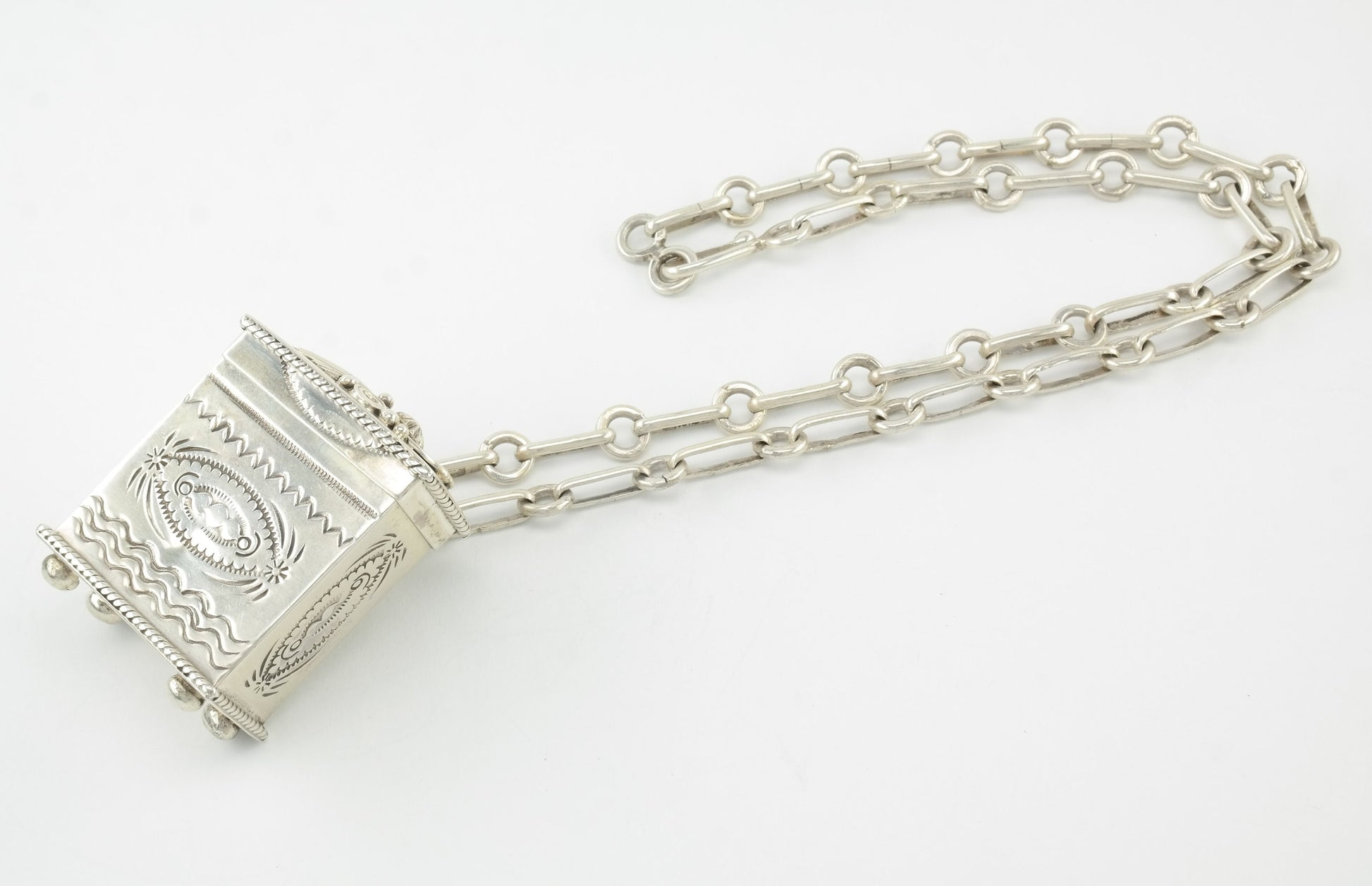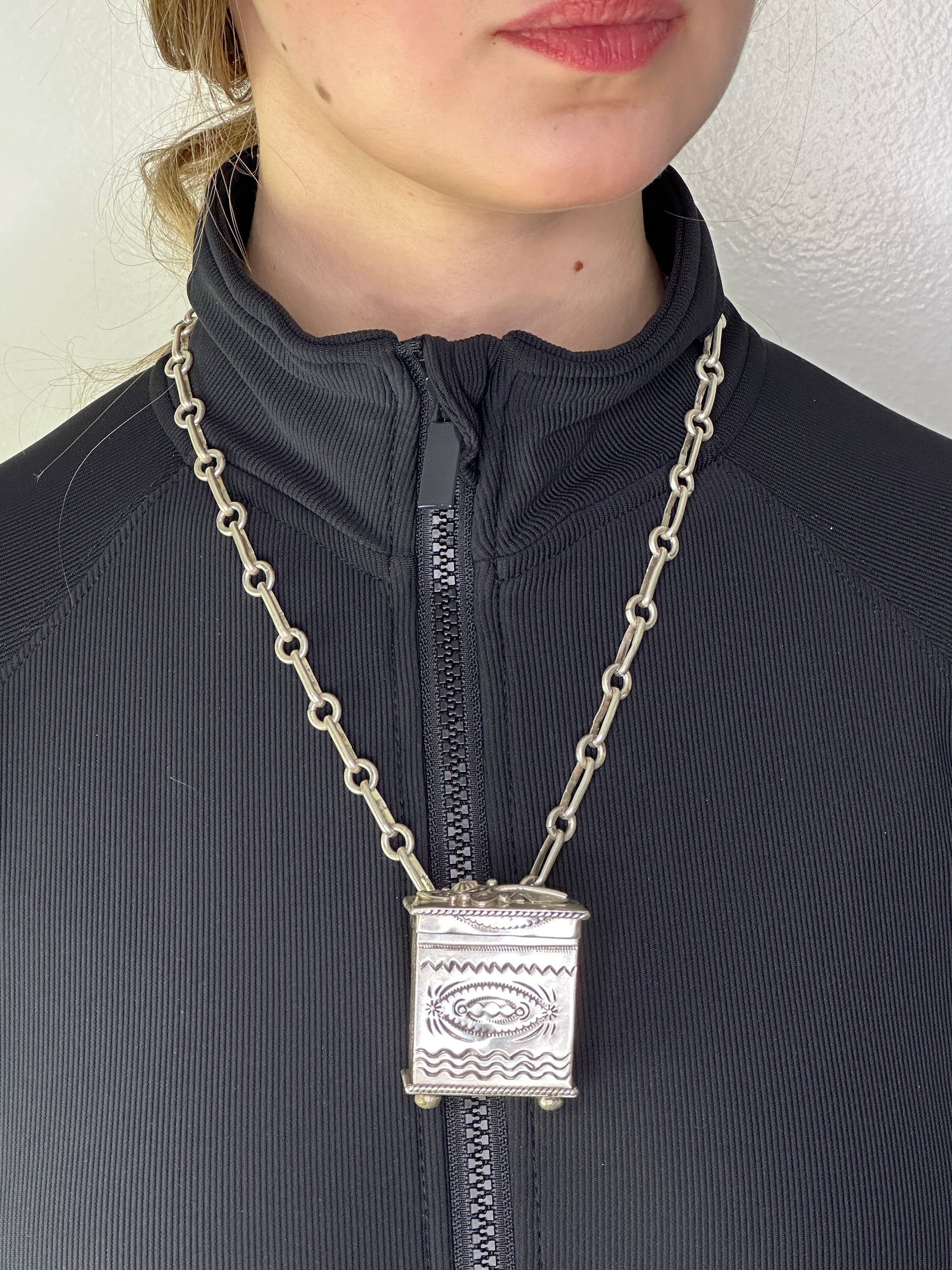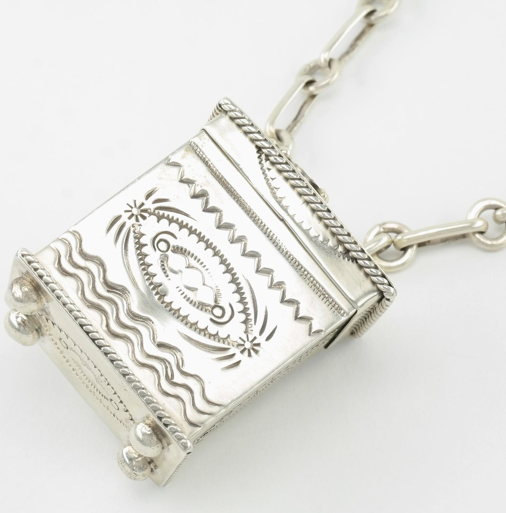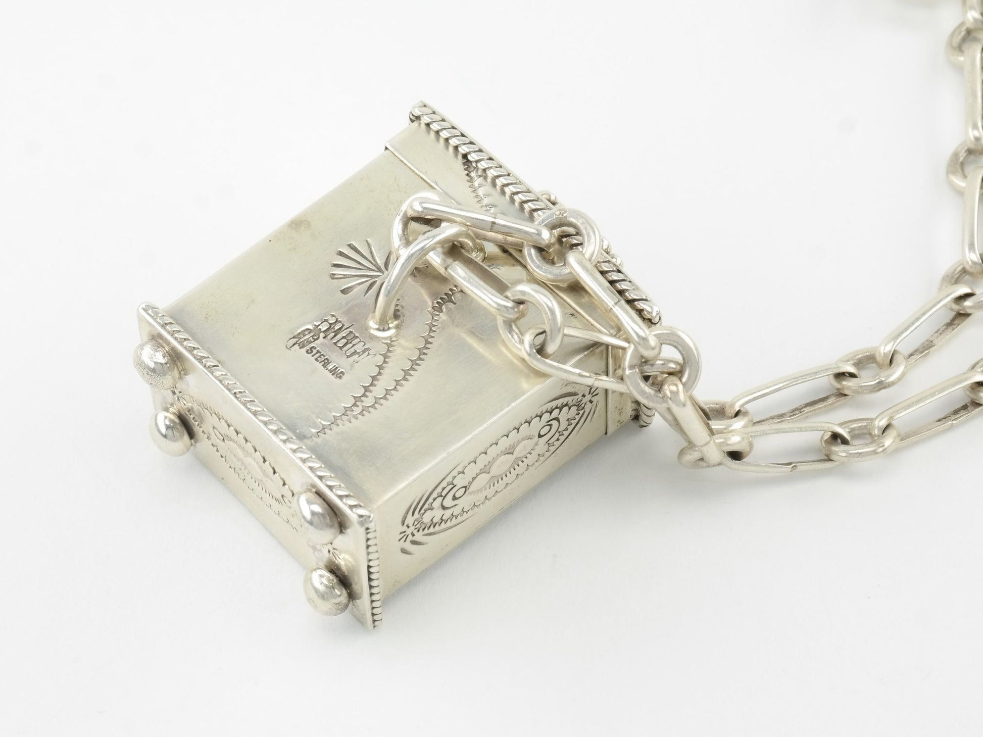 This piece has a trinket box pendant made of stamped sterling silver, with a feather motif. The pendant can be opened and things can be stored inside!