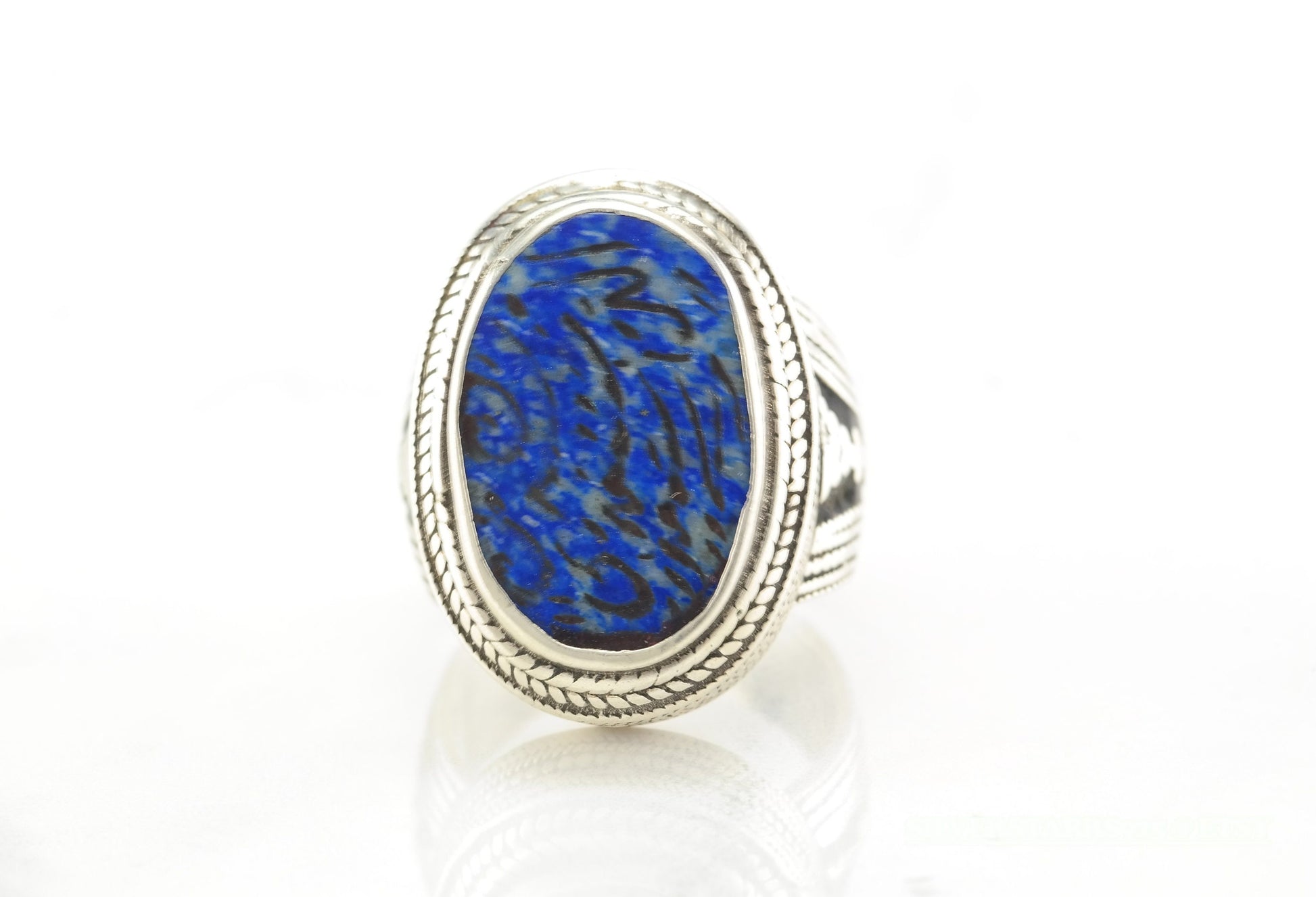 Vintage Blue Carved Lapis Silver Ring Size 10.5 Vintage Ethnographic Sterling