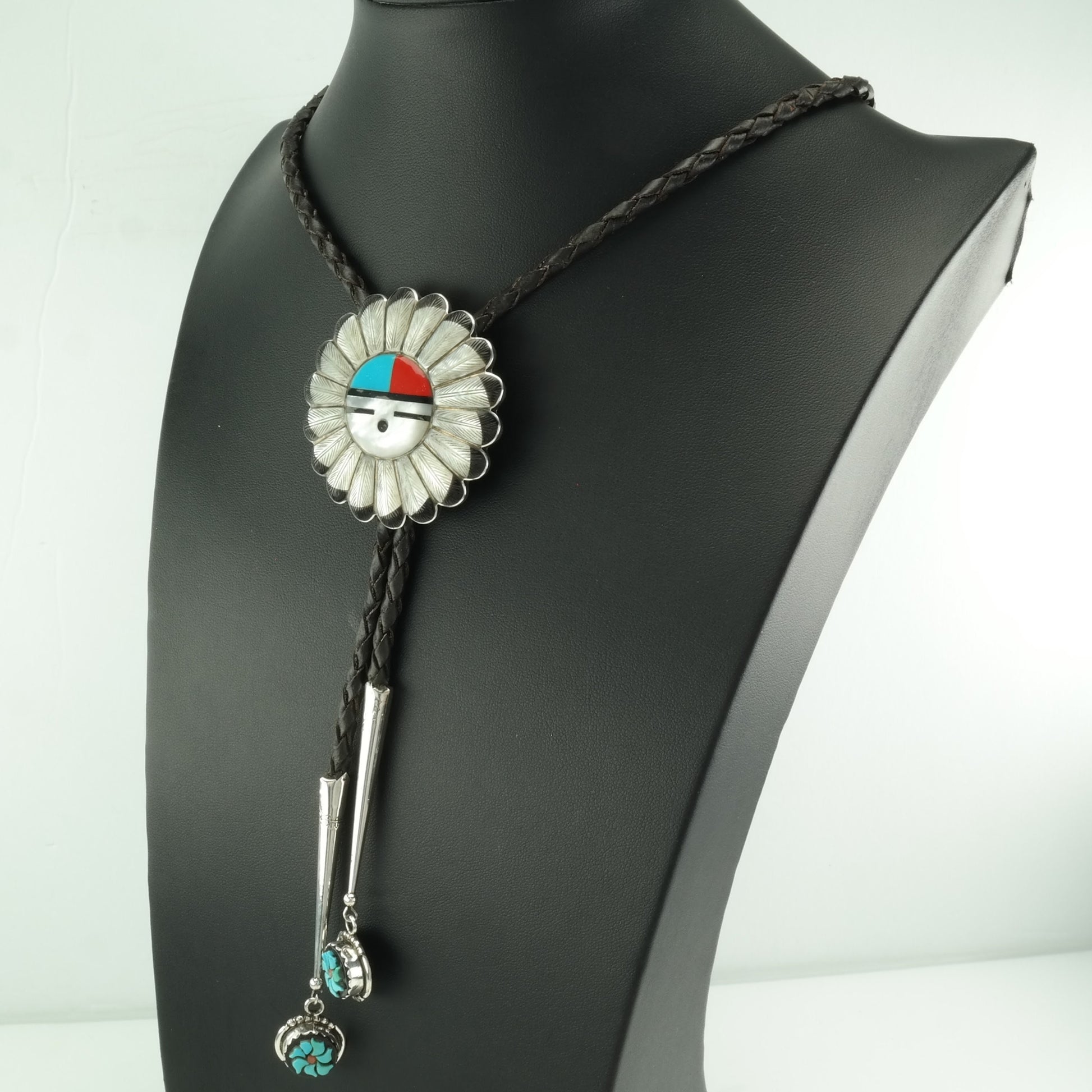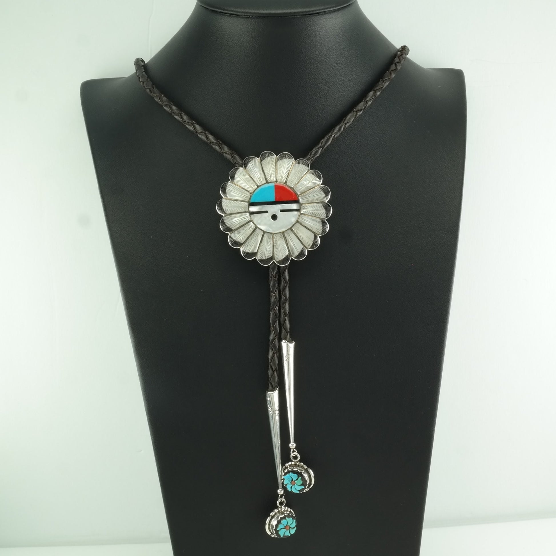 Vintage Native American Sterling Silver MOP, Coral, Onyx, Turquoise Feather, Sun Inlay Bolo Tie Necklace