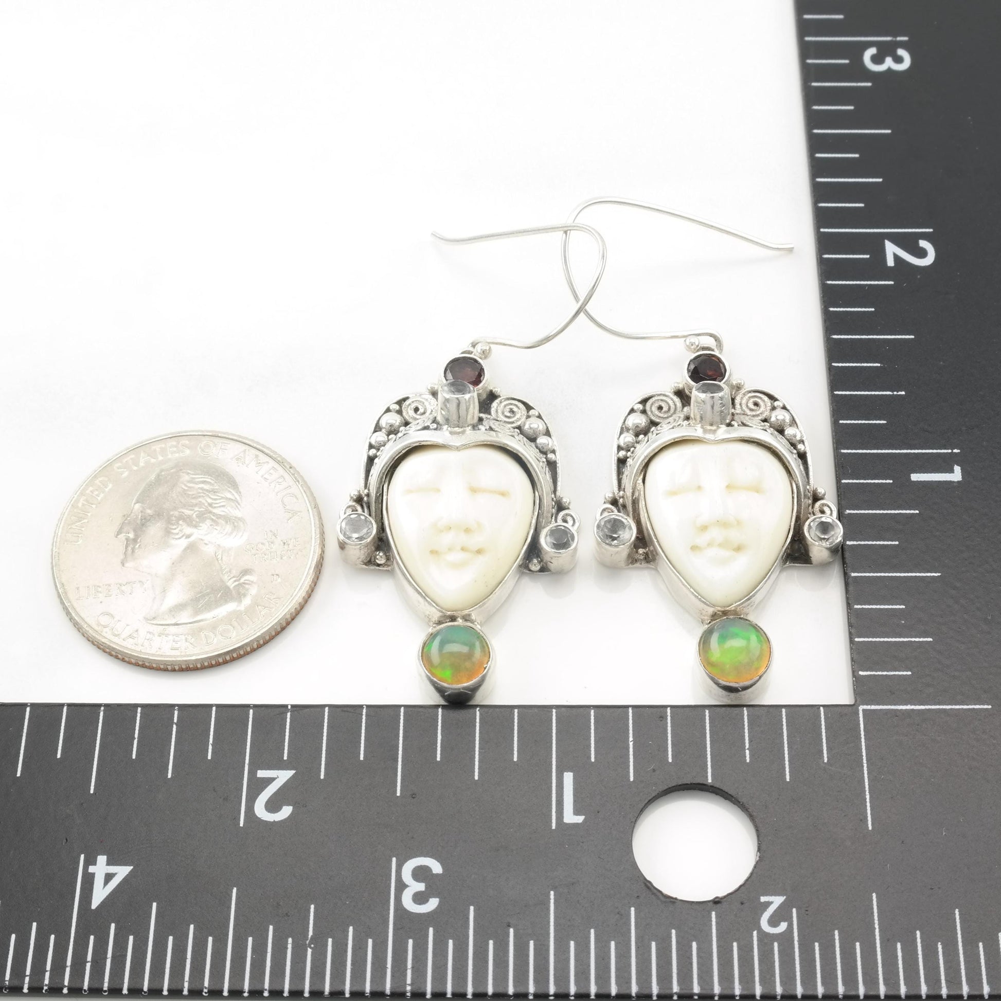 Vintage Carved Face Sterling Silver Fish Hook Earrings Opal