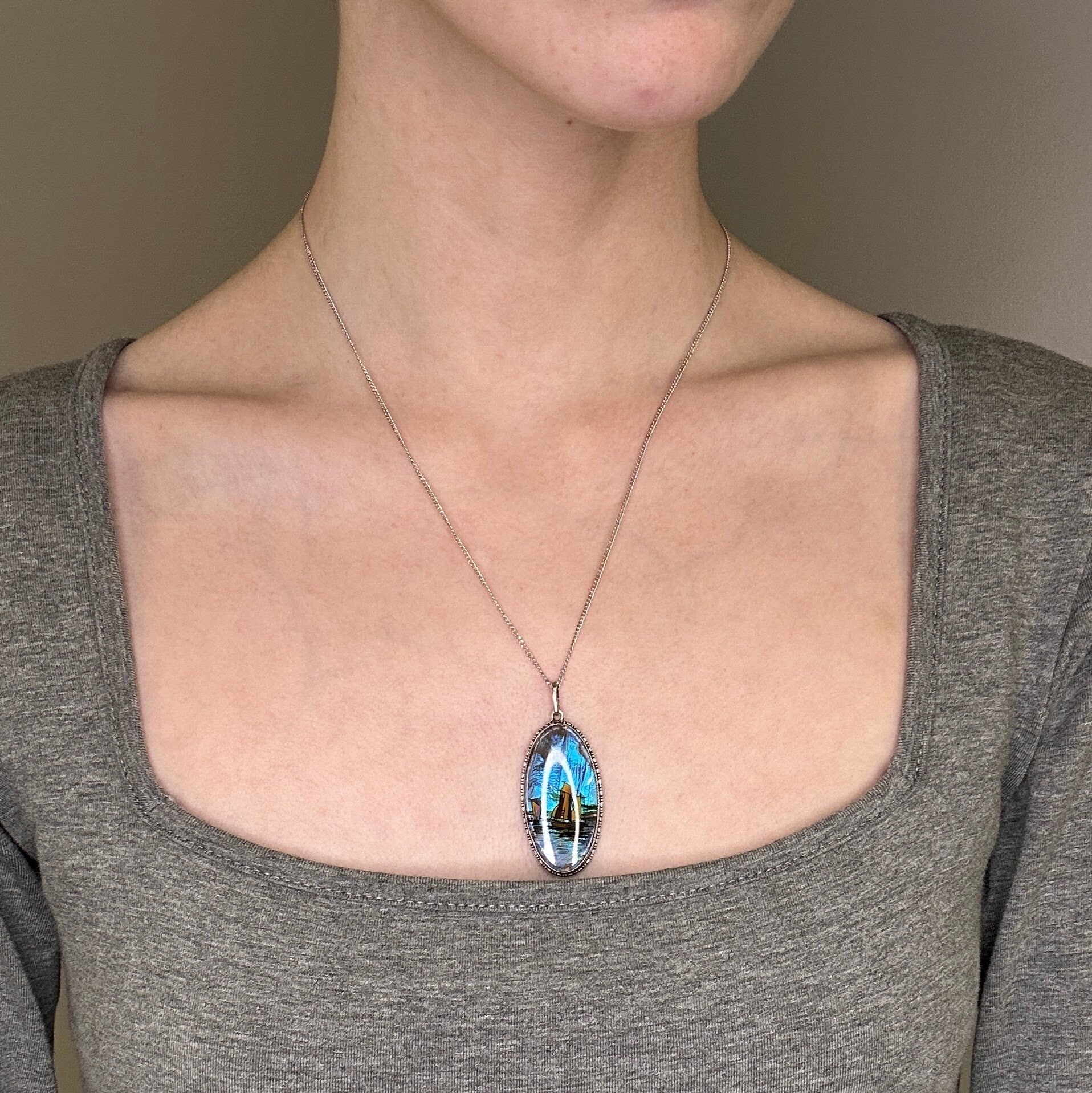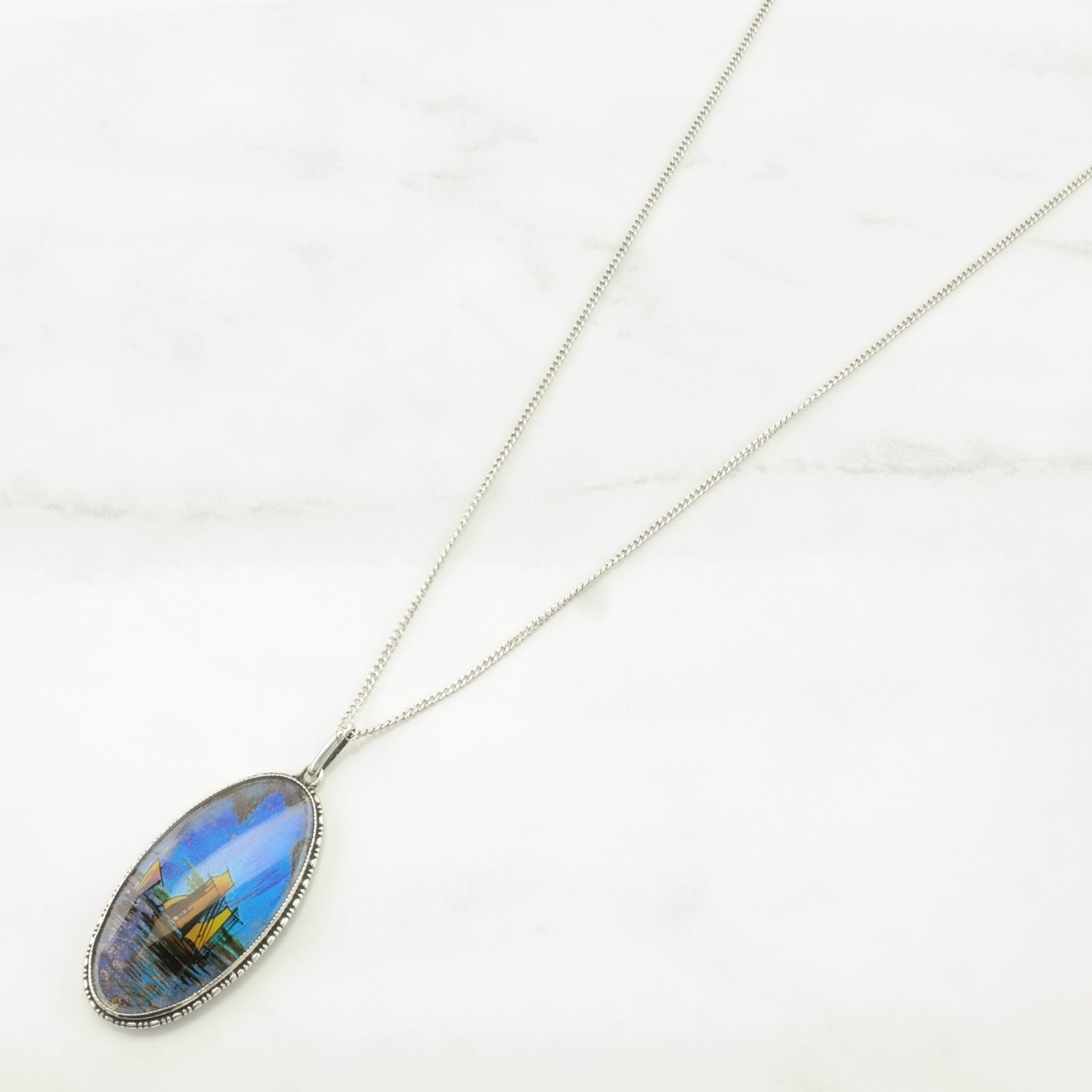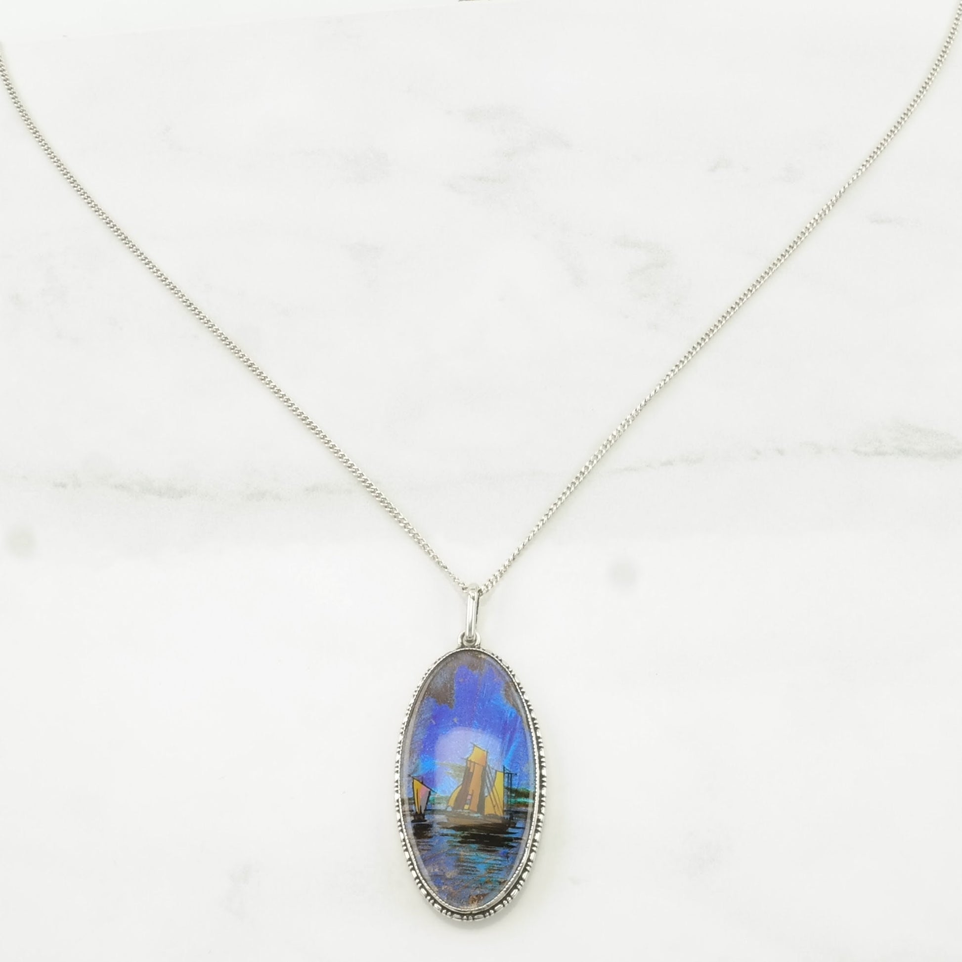 Vintage English Sterling Silver Blue, Iridescent Butterfly Wing Painted Boats Necklace