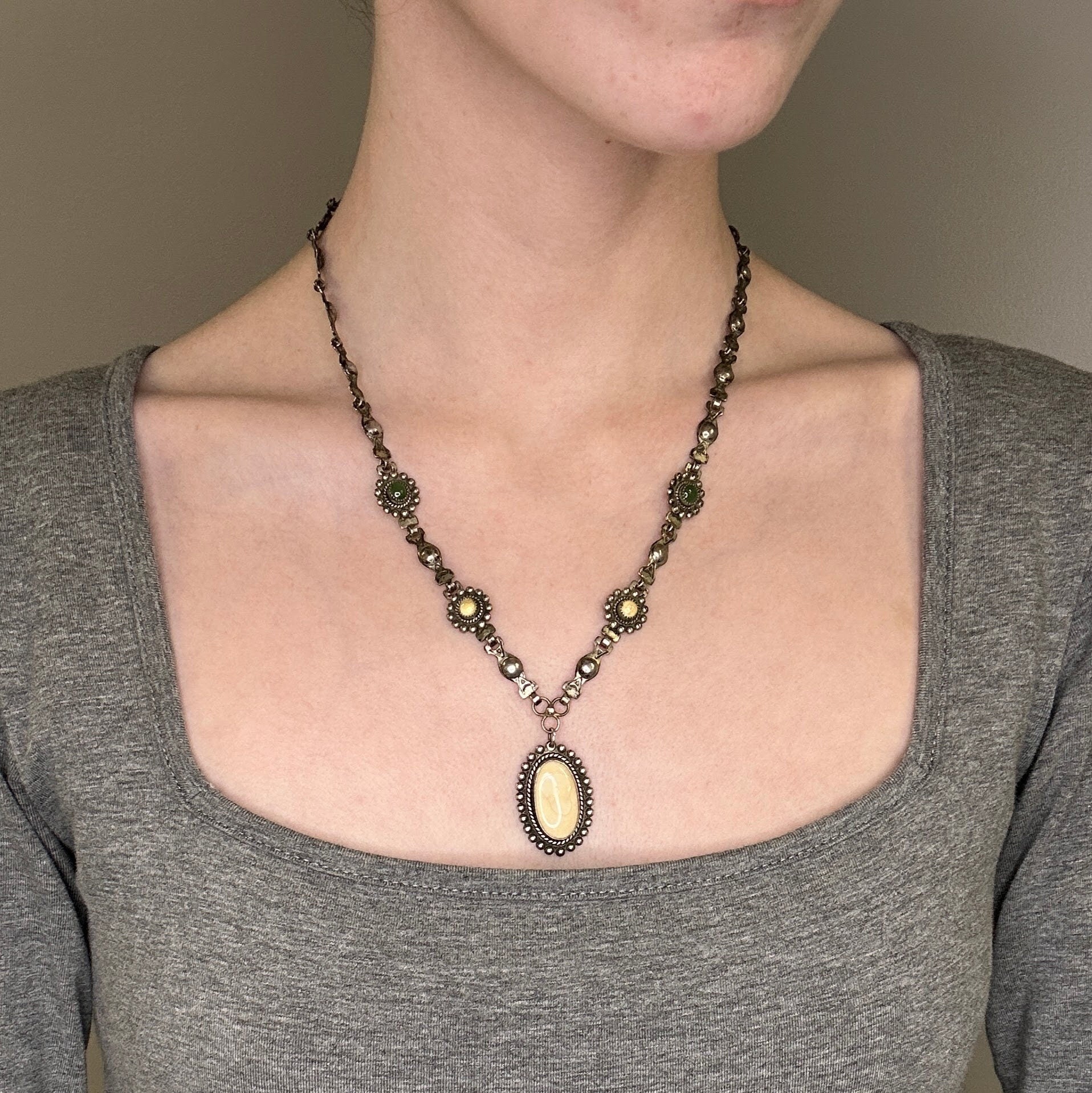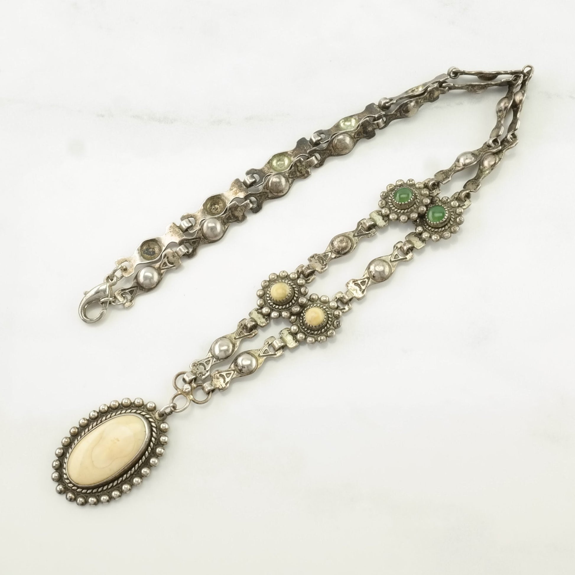 Vintage Fred Harvey Era Sterling Silver Green, Tan Nephrite Jade, Stone Floral Necklace