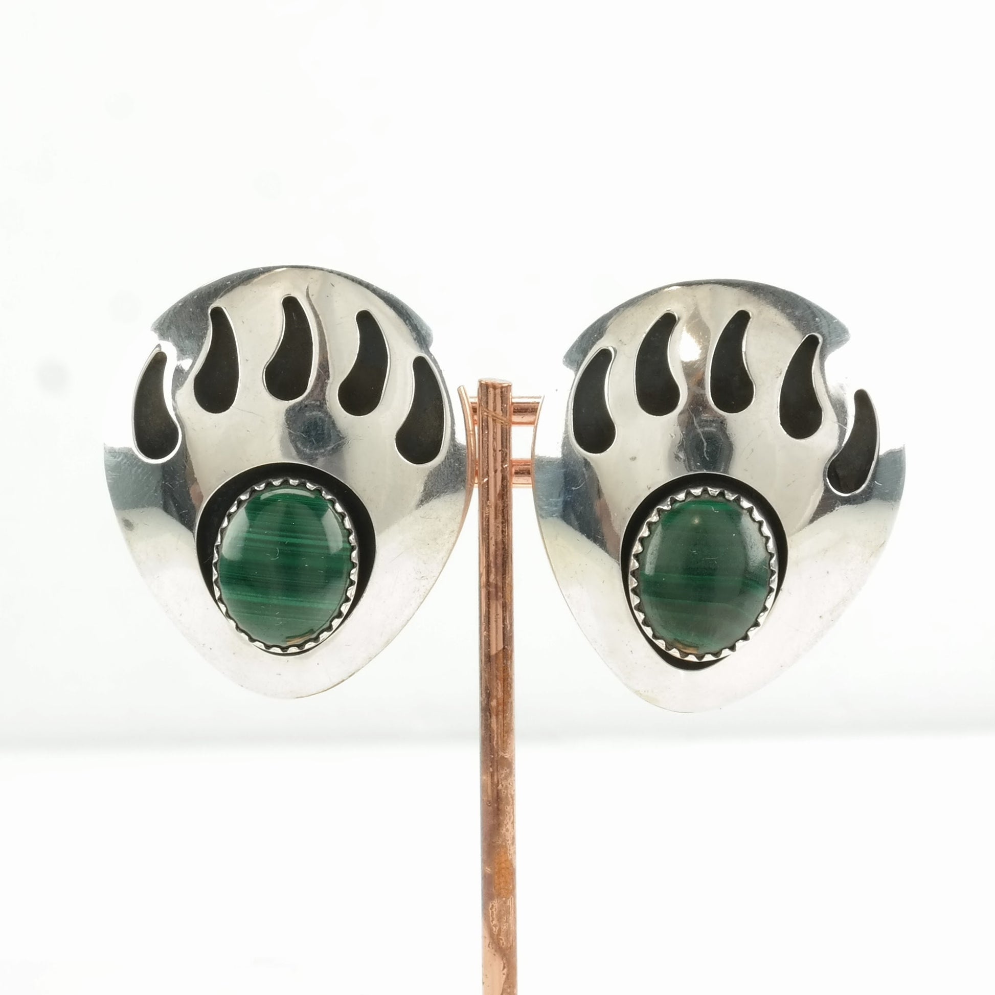 Vintage Green Malachite Bear Paw Sterling Silver Clip On Earrings