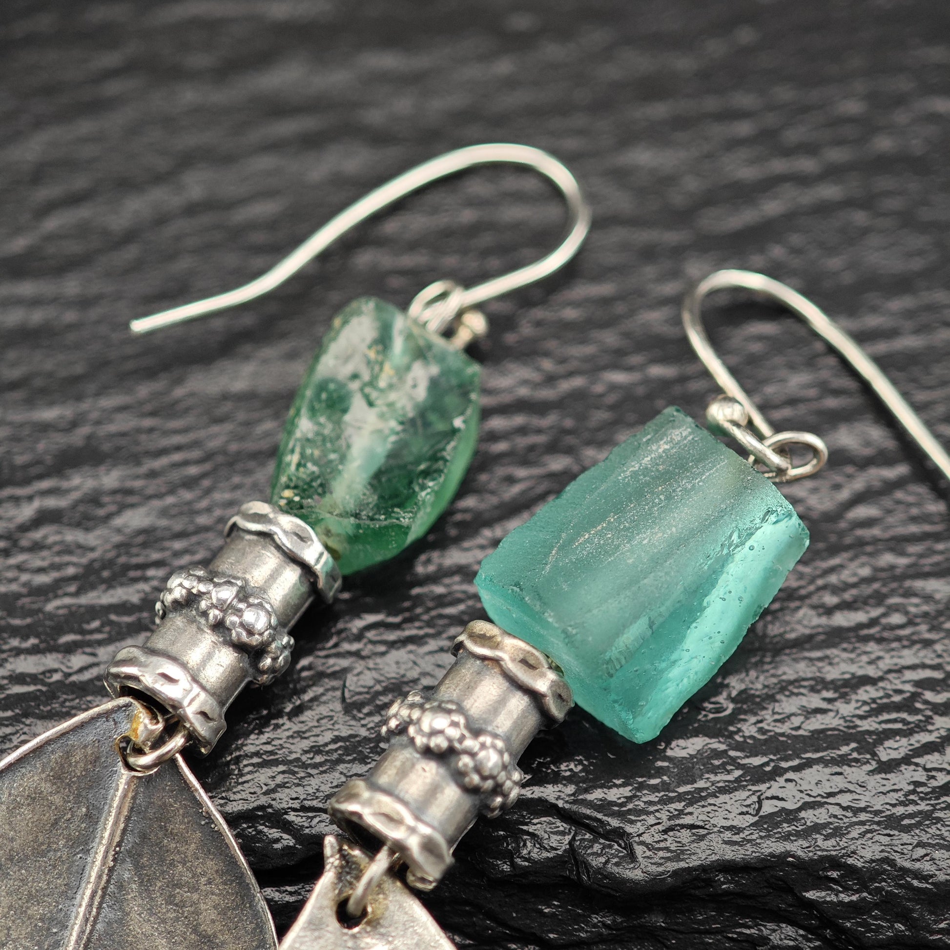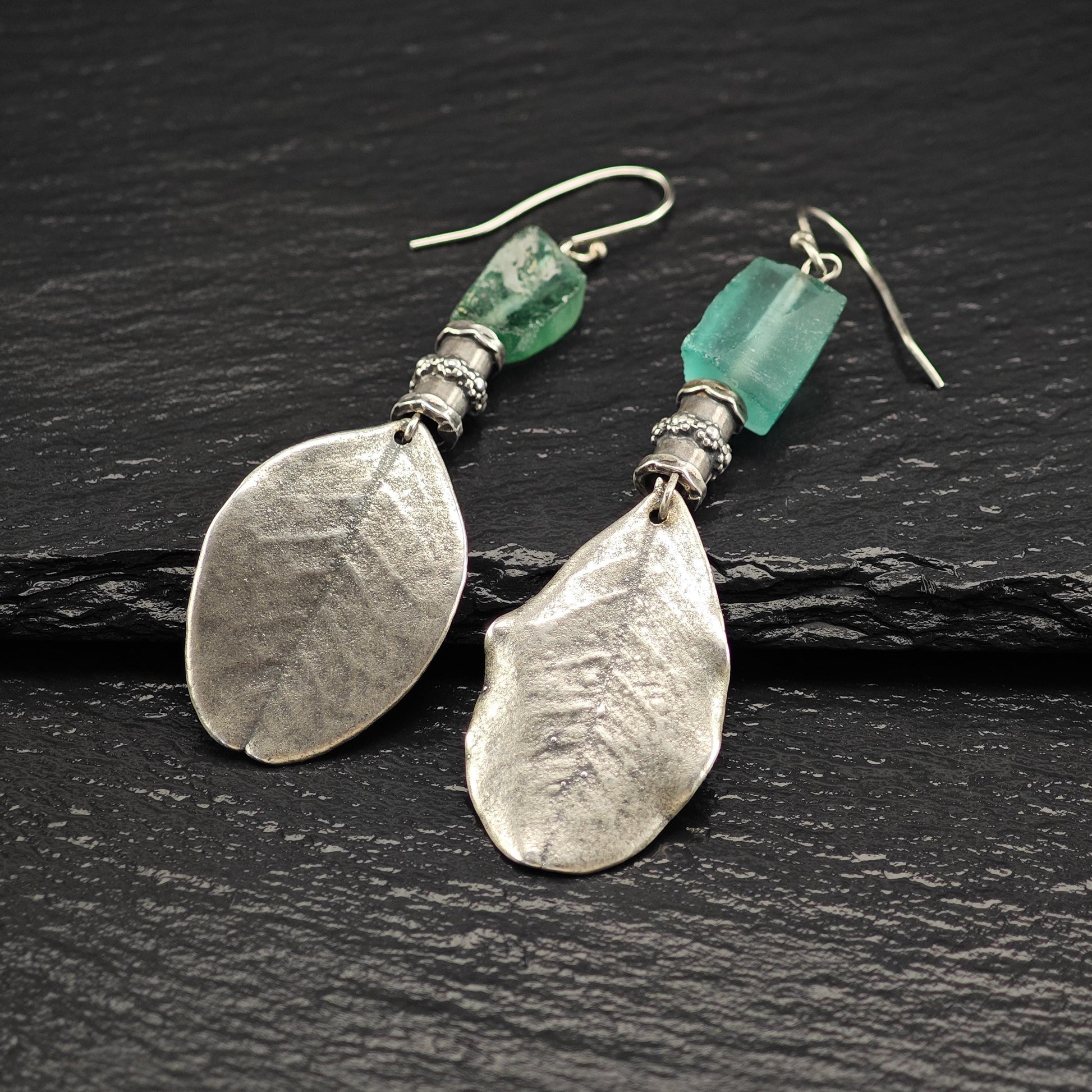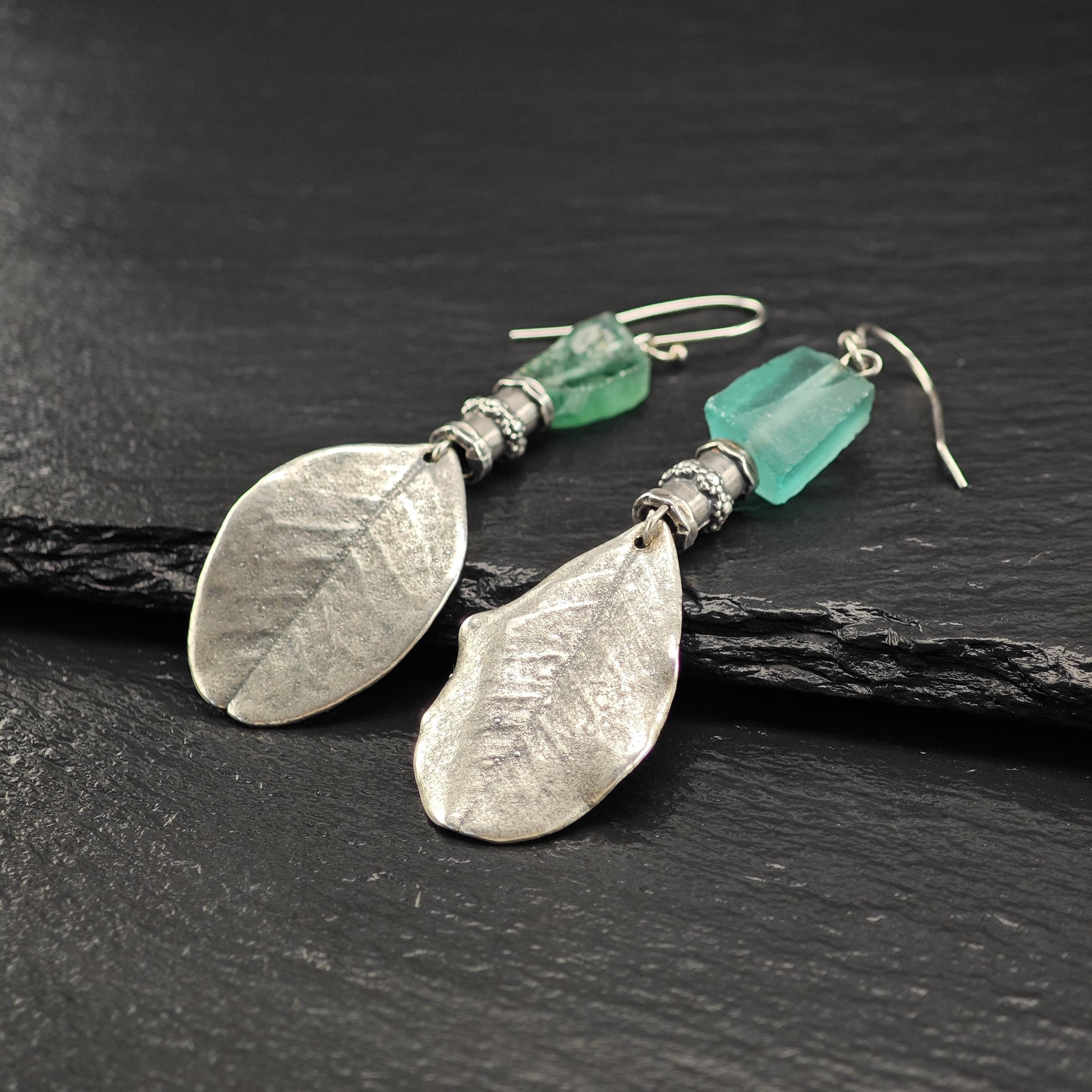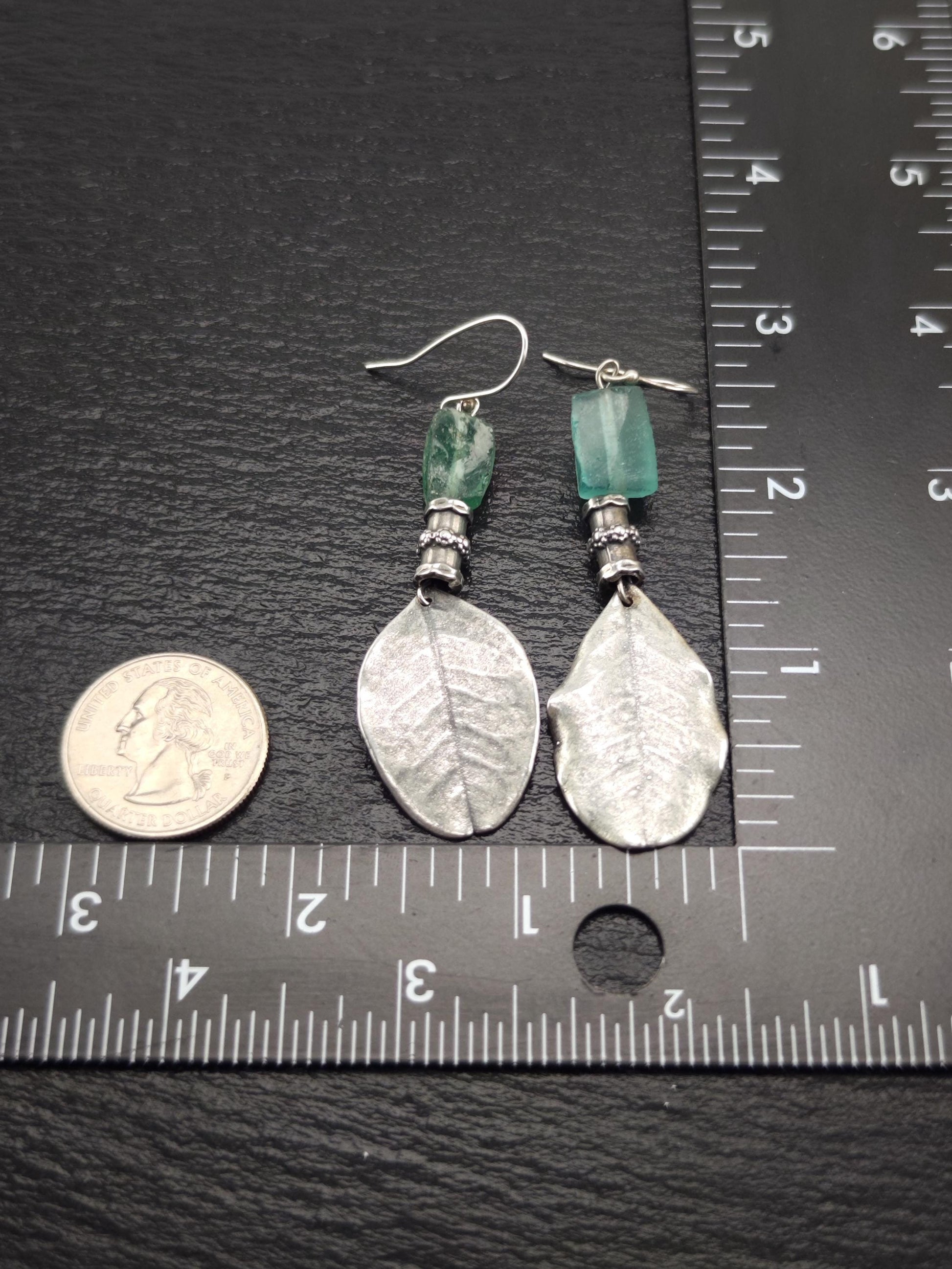 Vintage Green Sea Glass, Leaf Fish Hook Earrings Sterling Silver