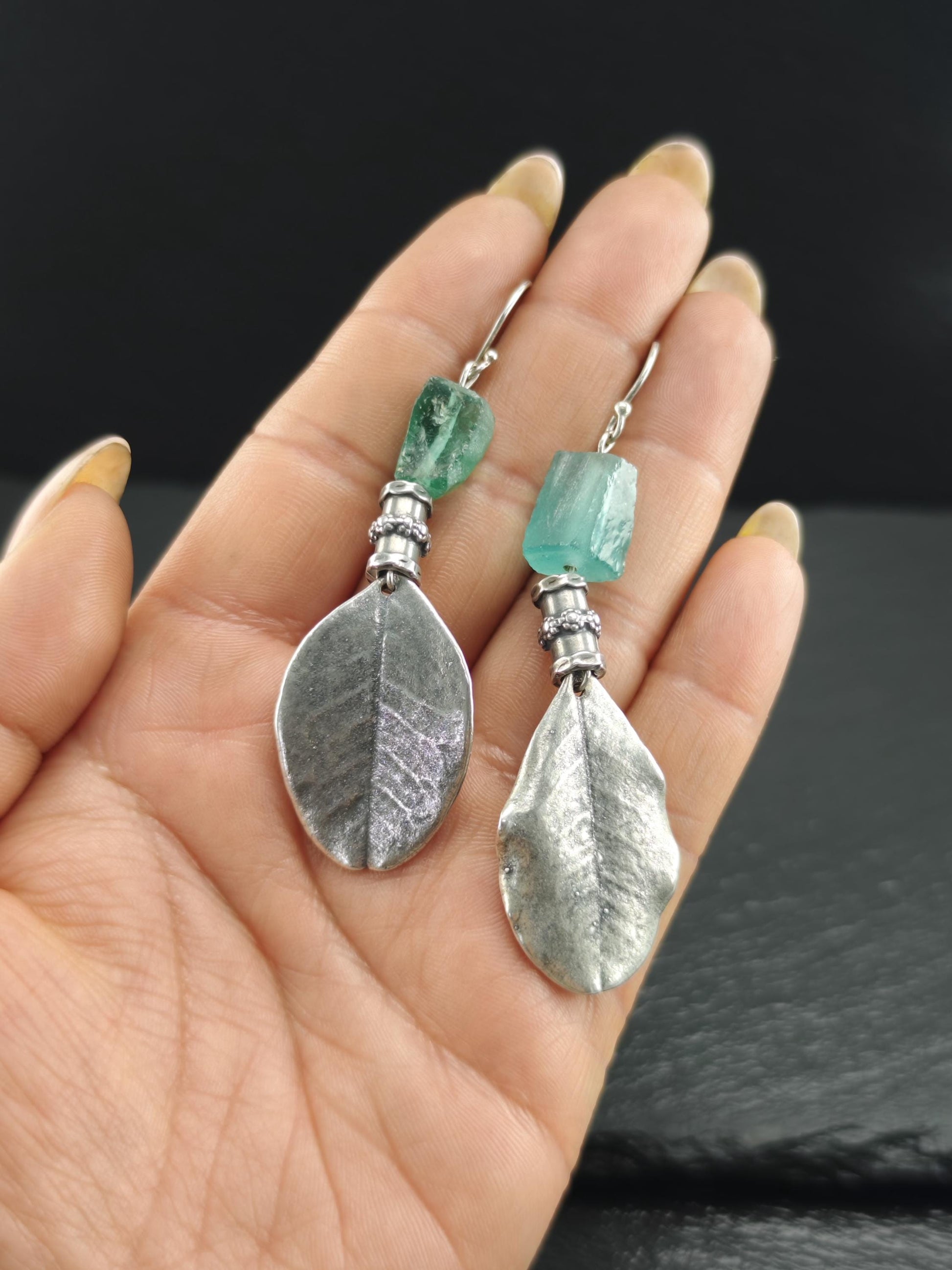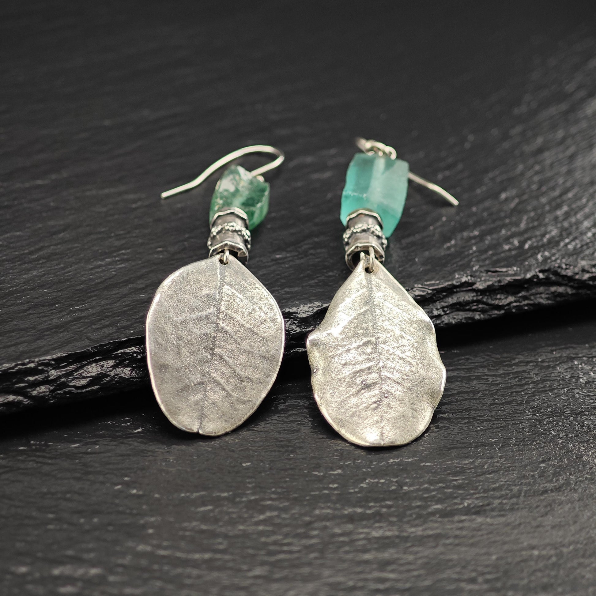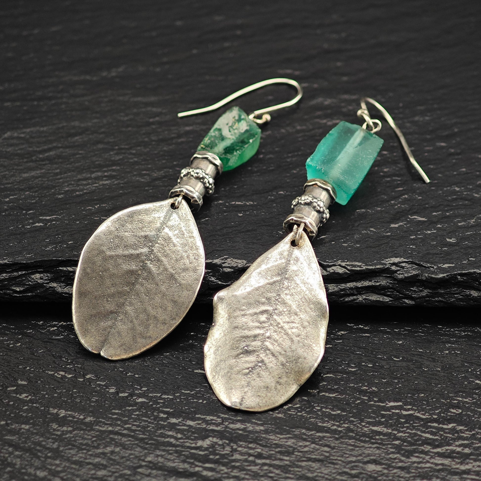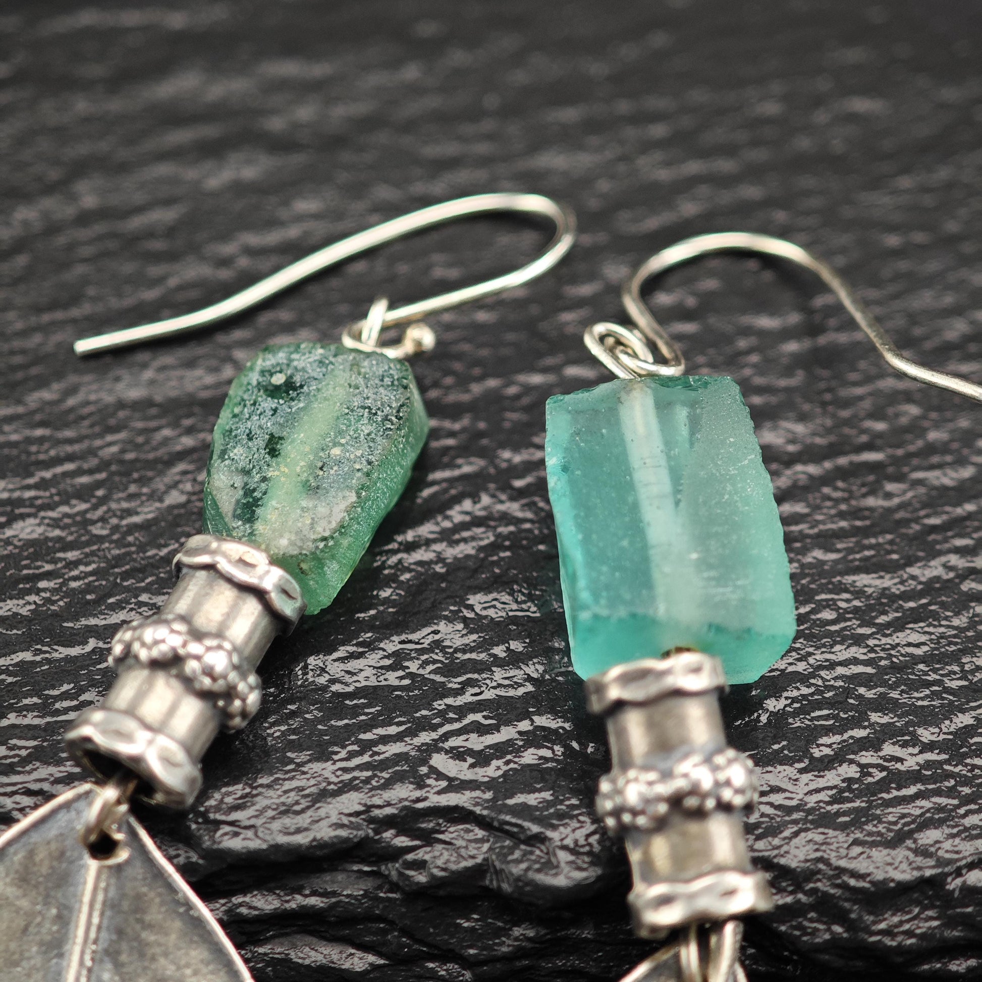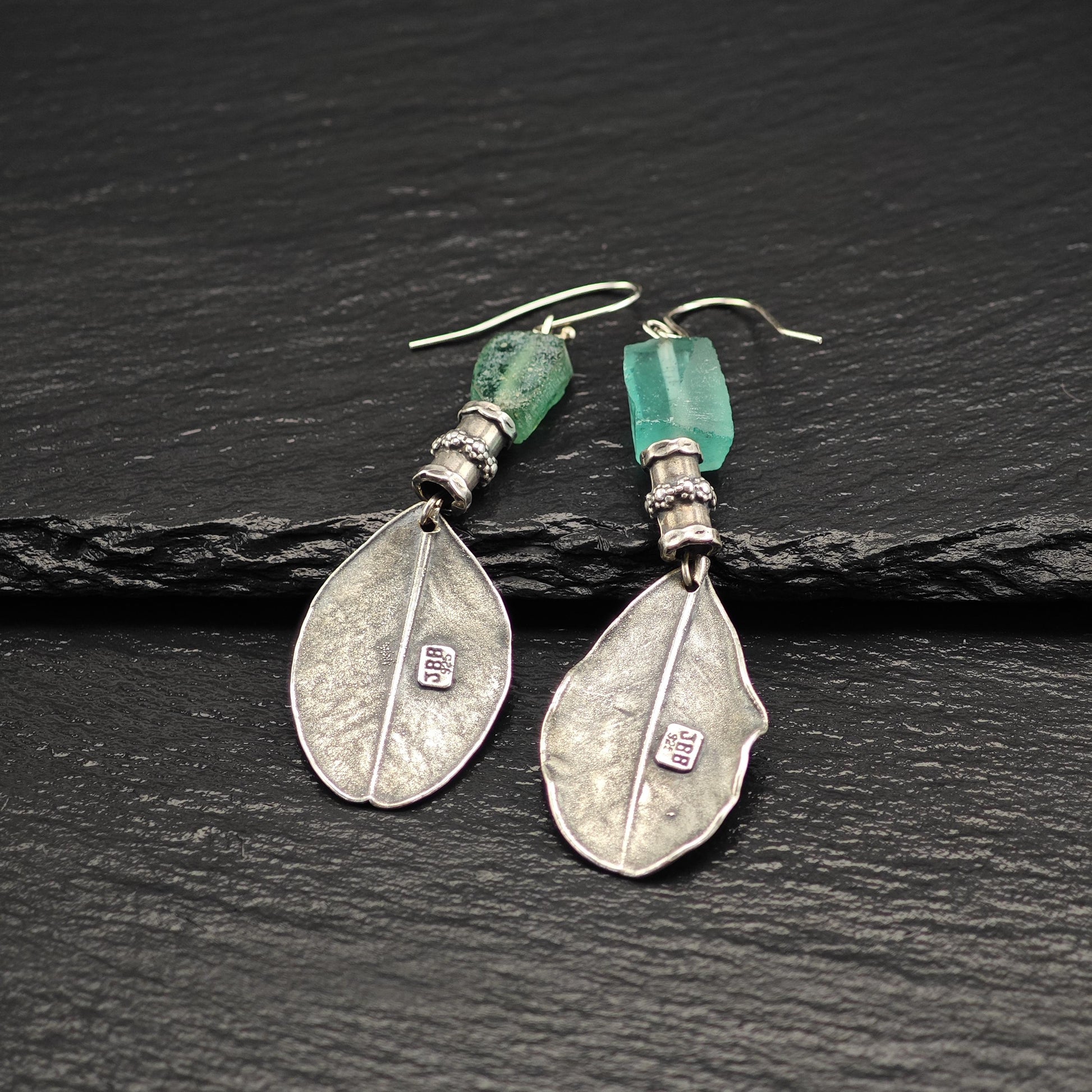 Vintage Green Sea Glass, Leaf Fish Hook Earrings Sterling Silver