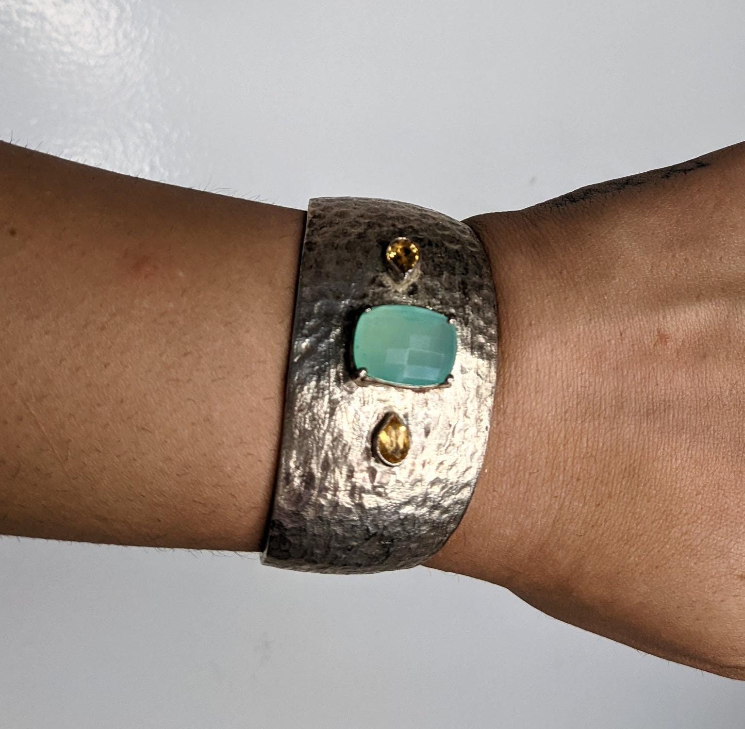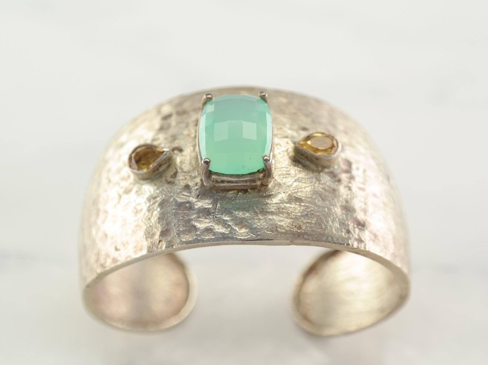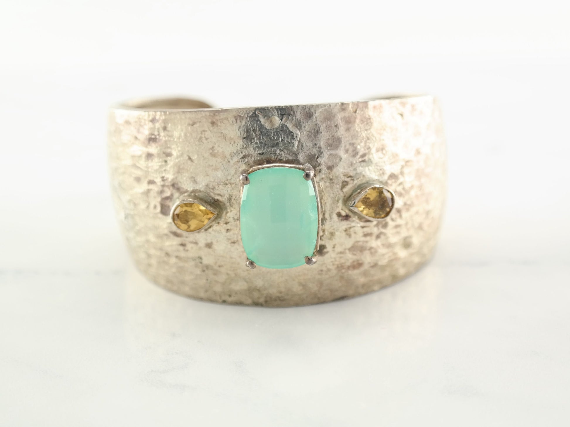 Vintage Hammered Sterling Silver Cuff with Citrine and Chalcedony