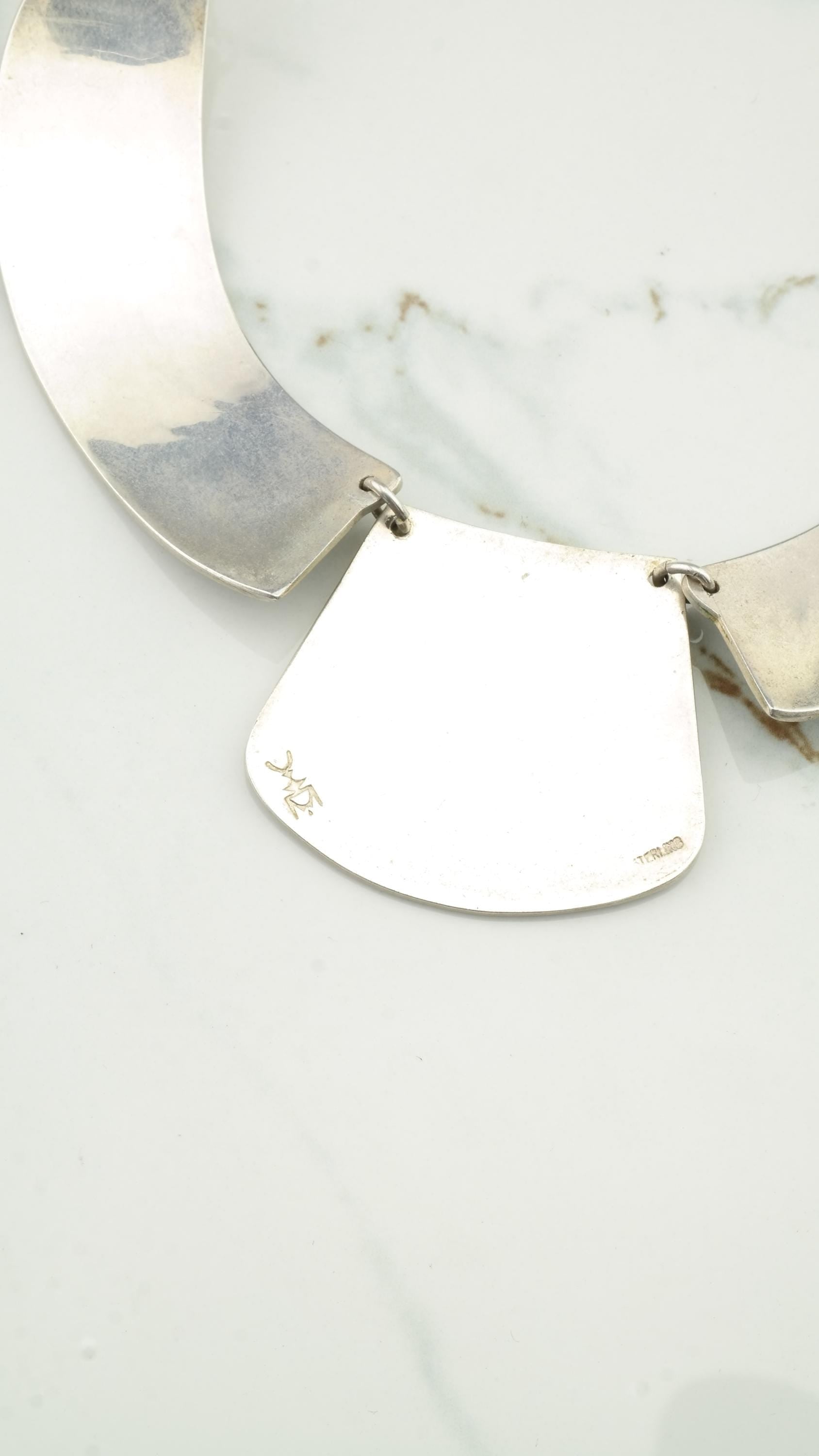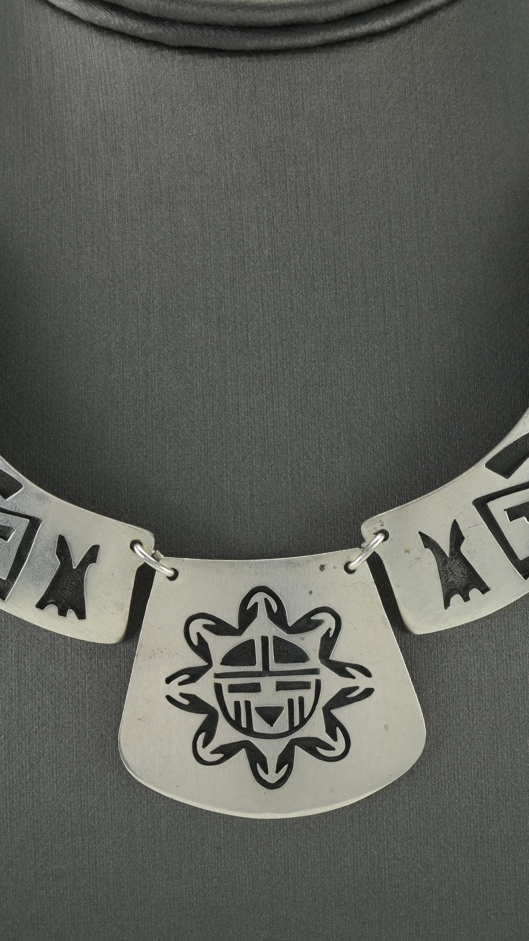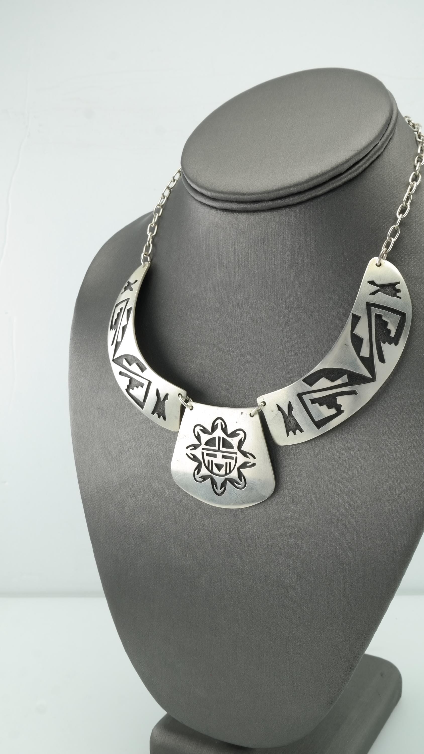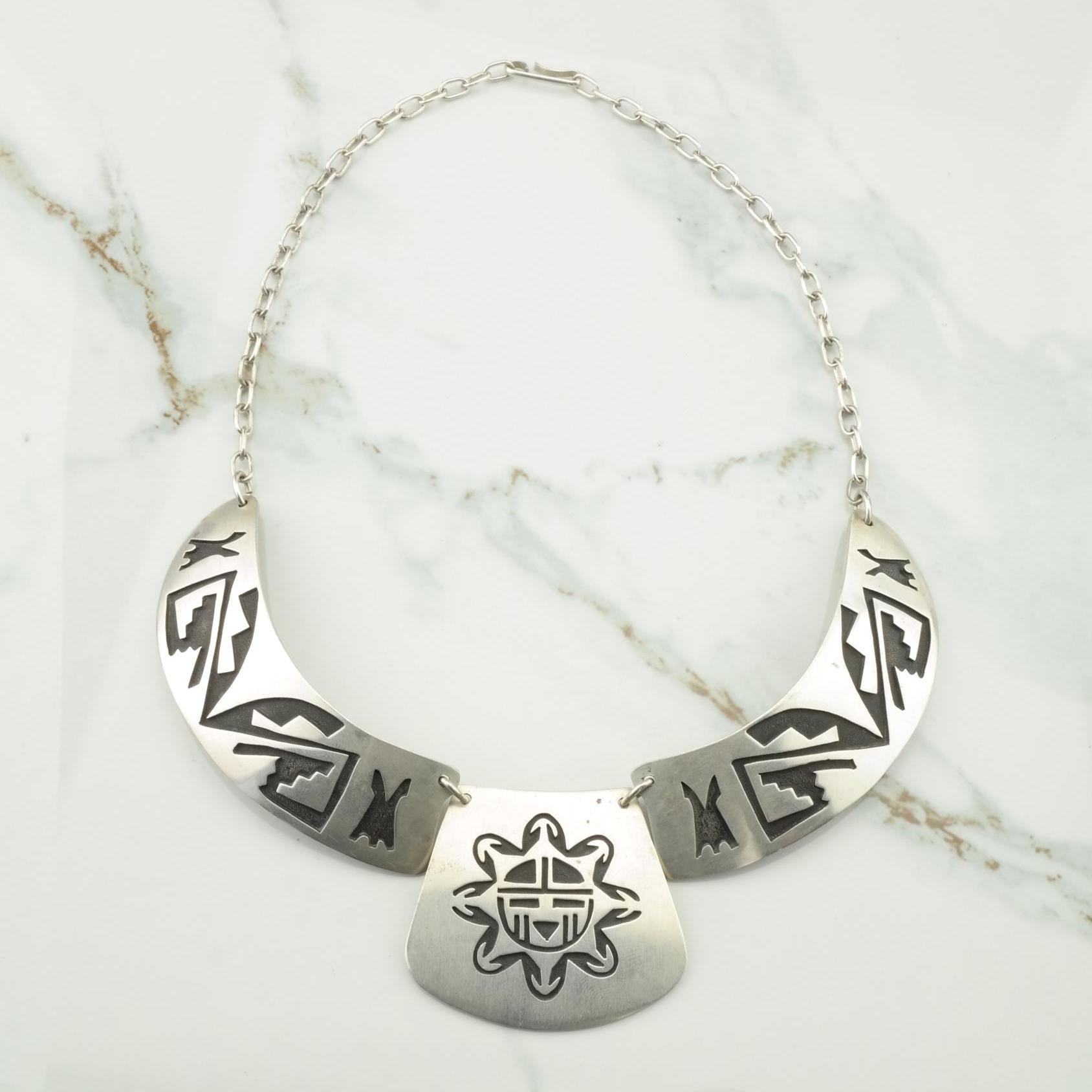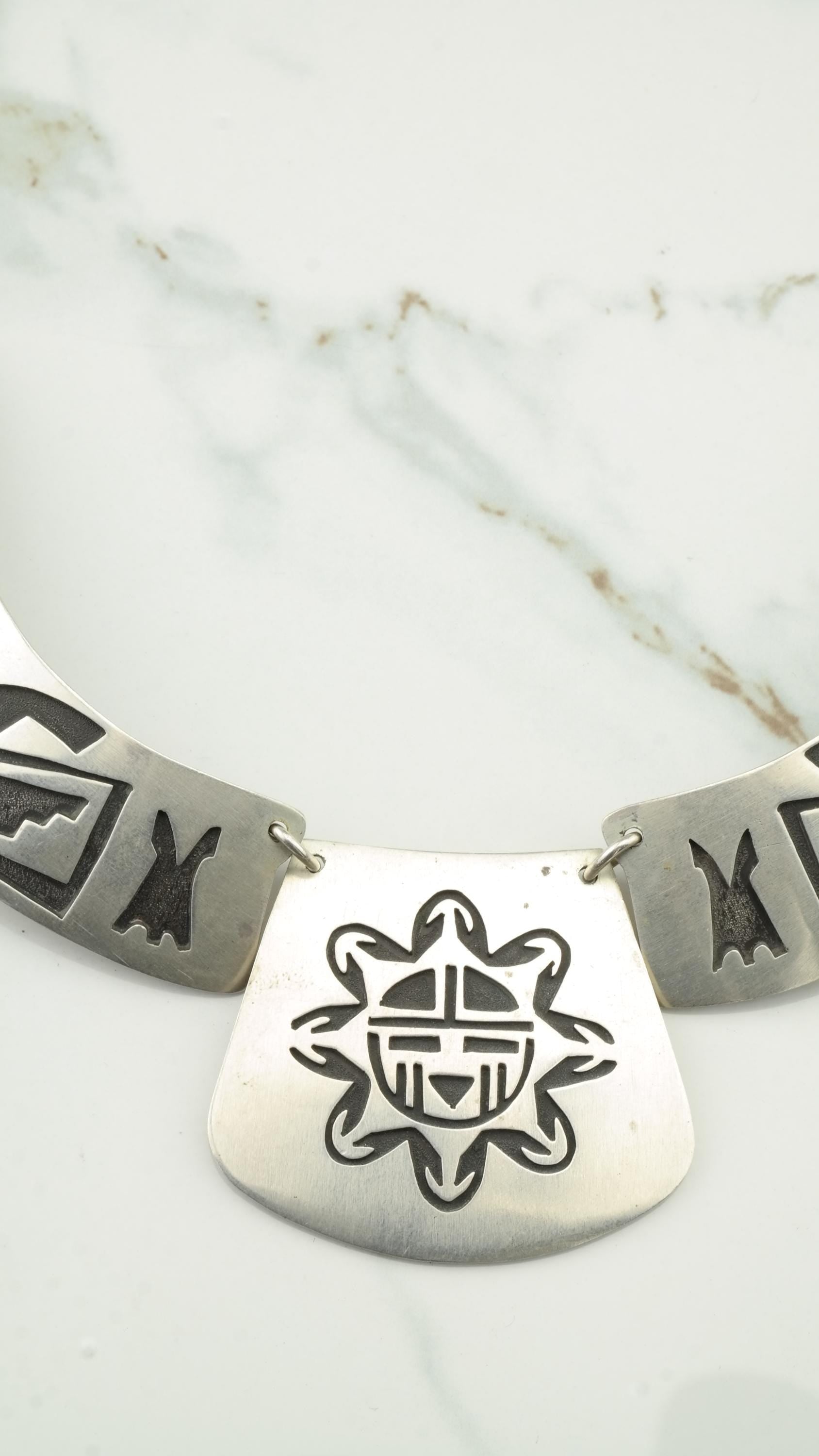 This vintage Hopi sterling silver necklace features a striking sunface design, a powerful symbol of life and energy in Hopi culture. Crafted with the intricate overlay technique, this piece showcases the exceptional artistry and heritage of Native American jewelry.