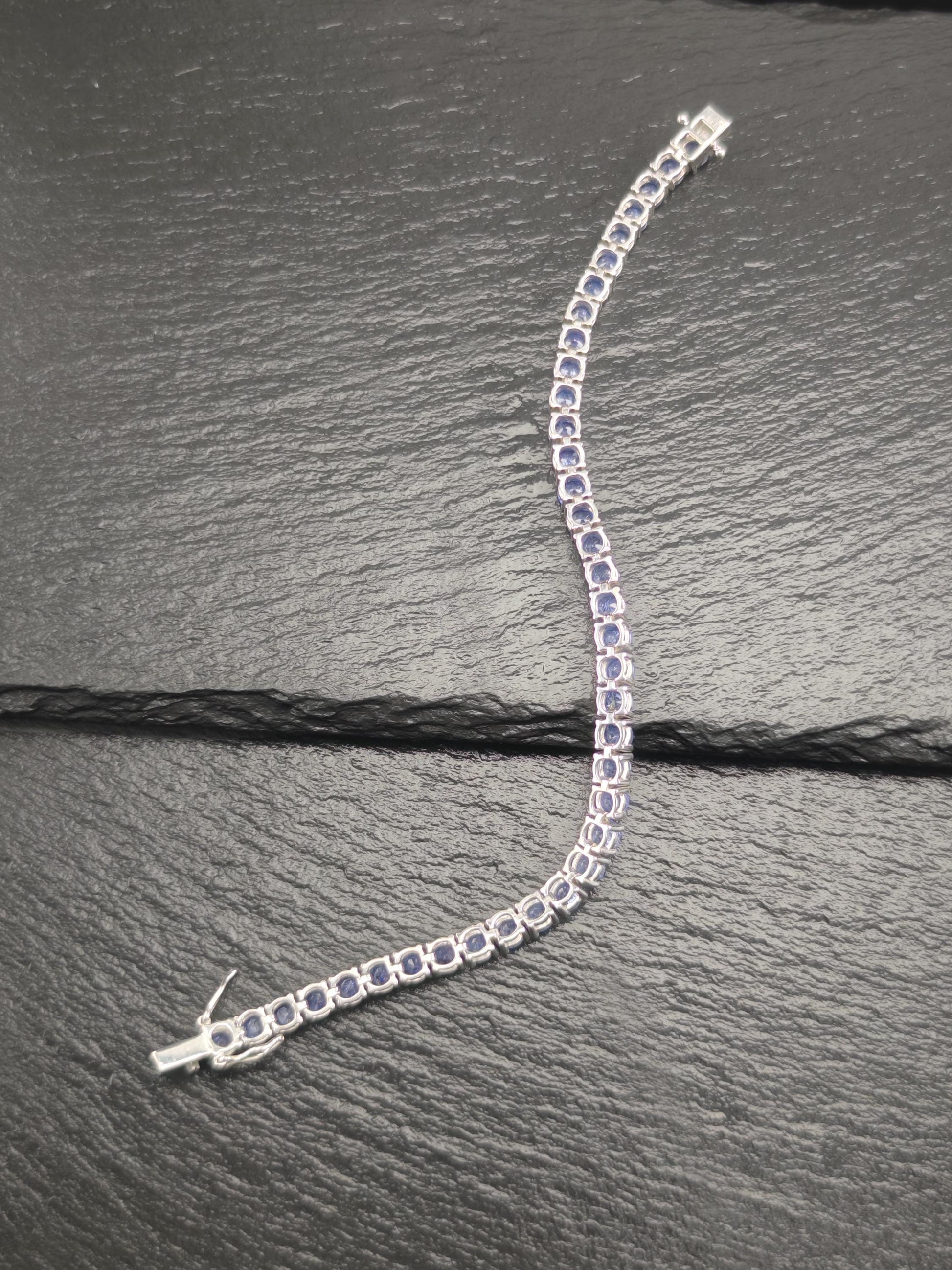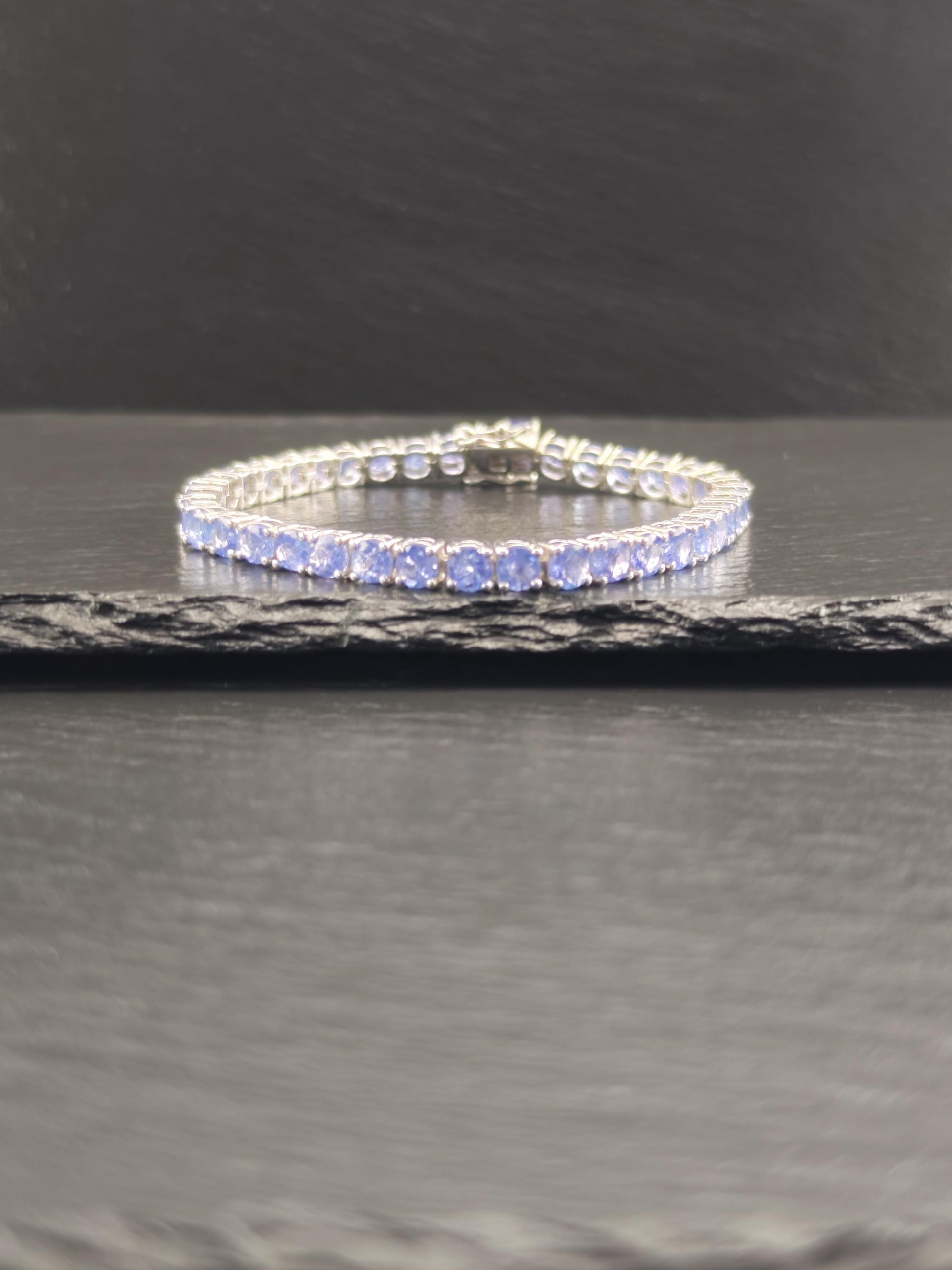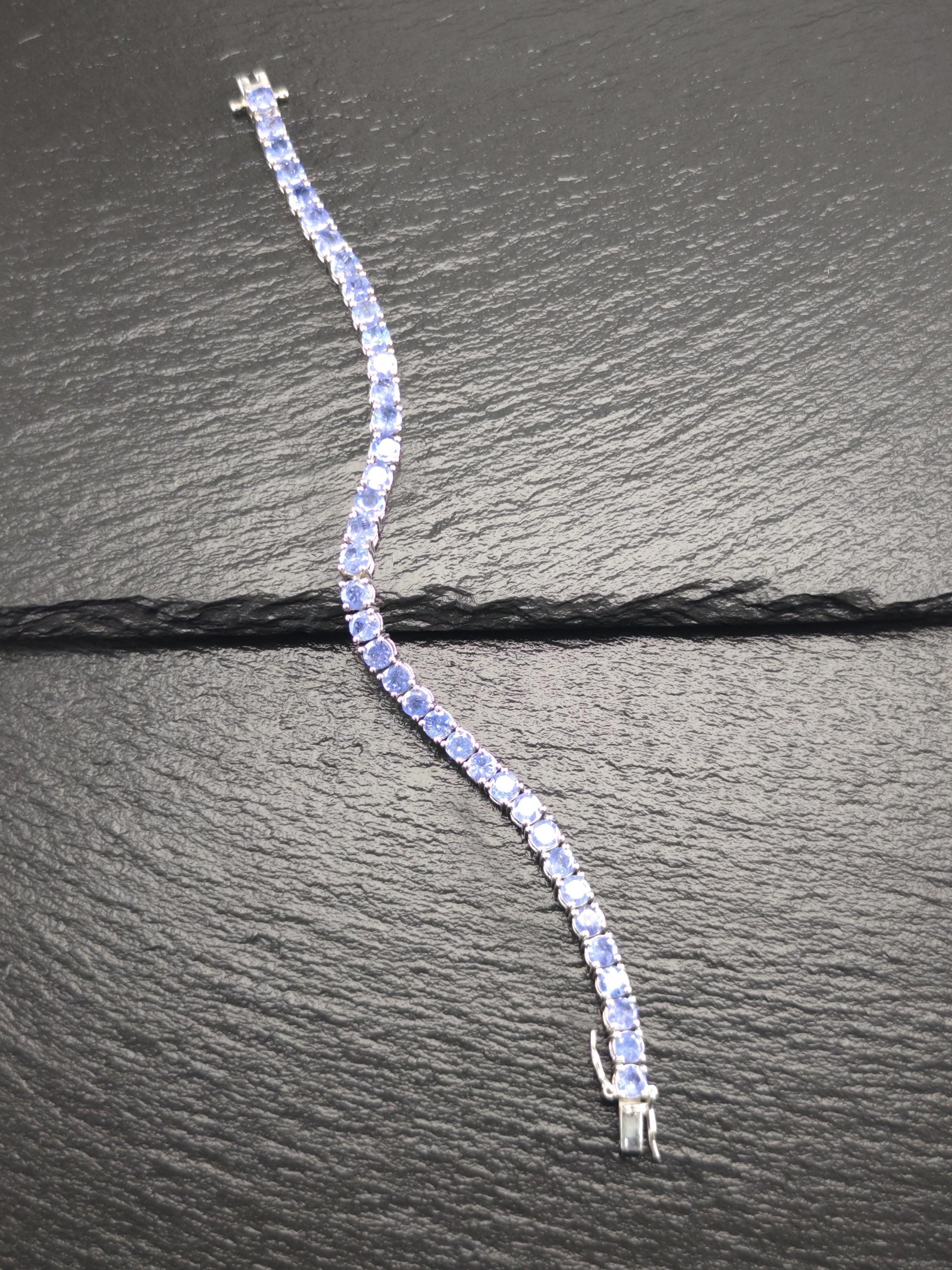 Discover this stunning vintage line bracelet featuring 14 carats total weight of exquisite Tanzanite gemstones set in elegant sterling silver. Each Tanzanite measures between 4.8mm and 5mm, with a total of 38 stones included in the design. The tanzanites are heavily included, adding to their unique character and charm.
