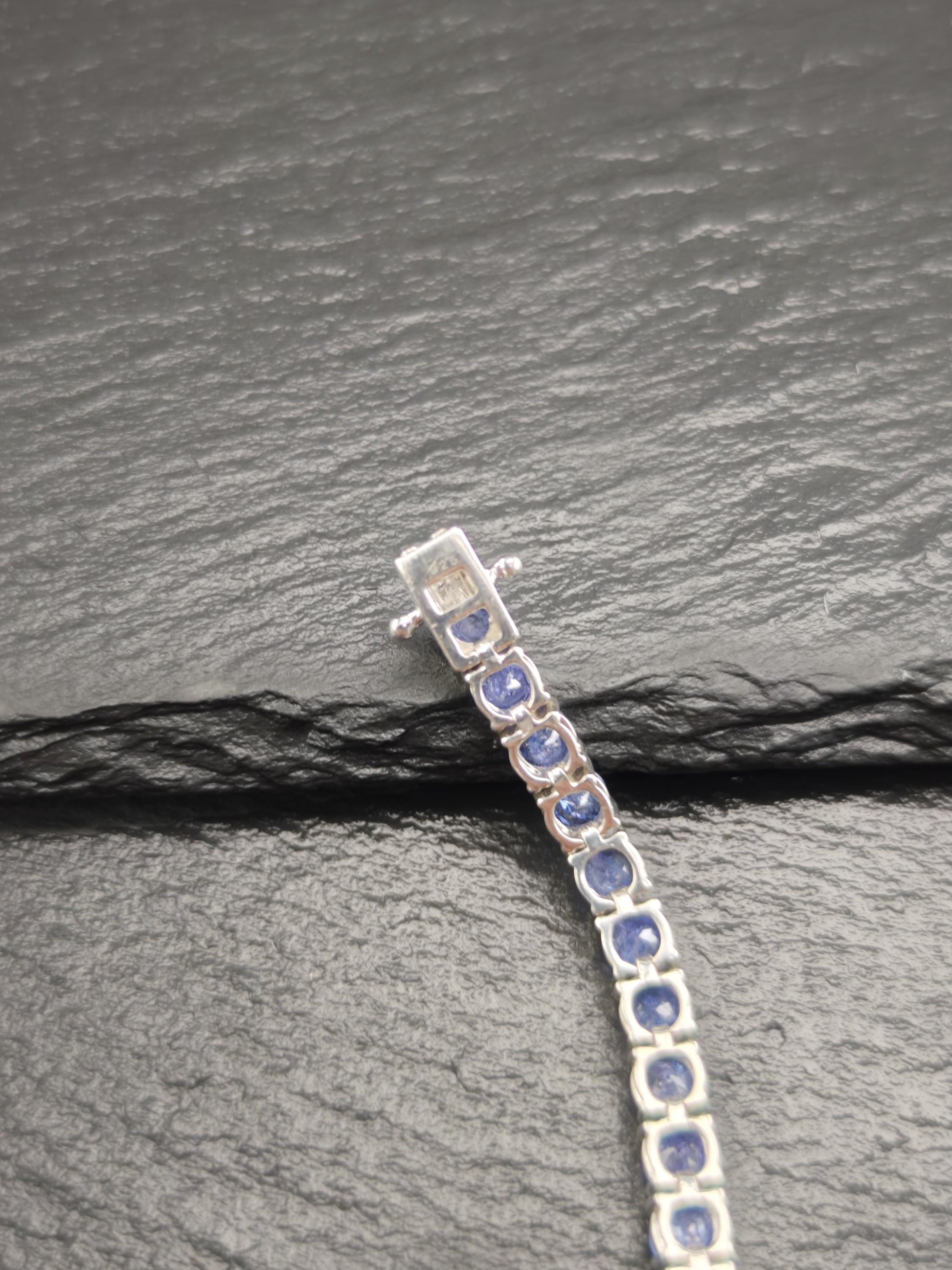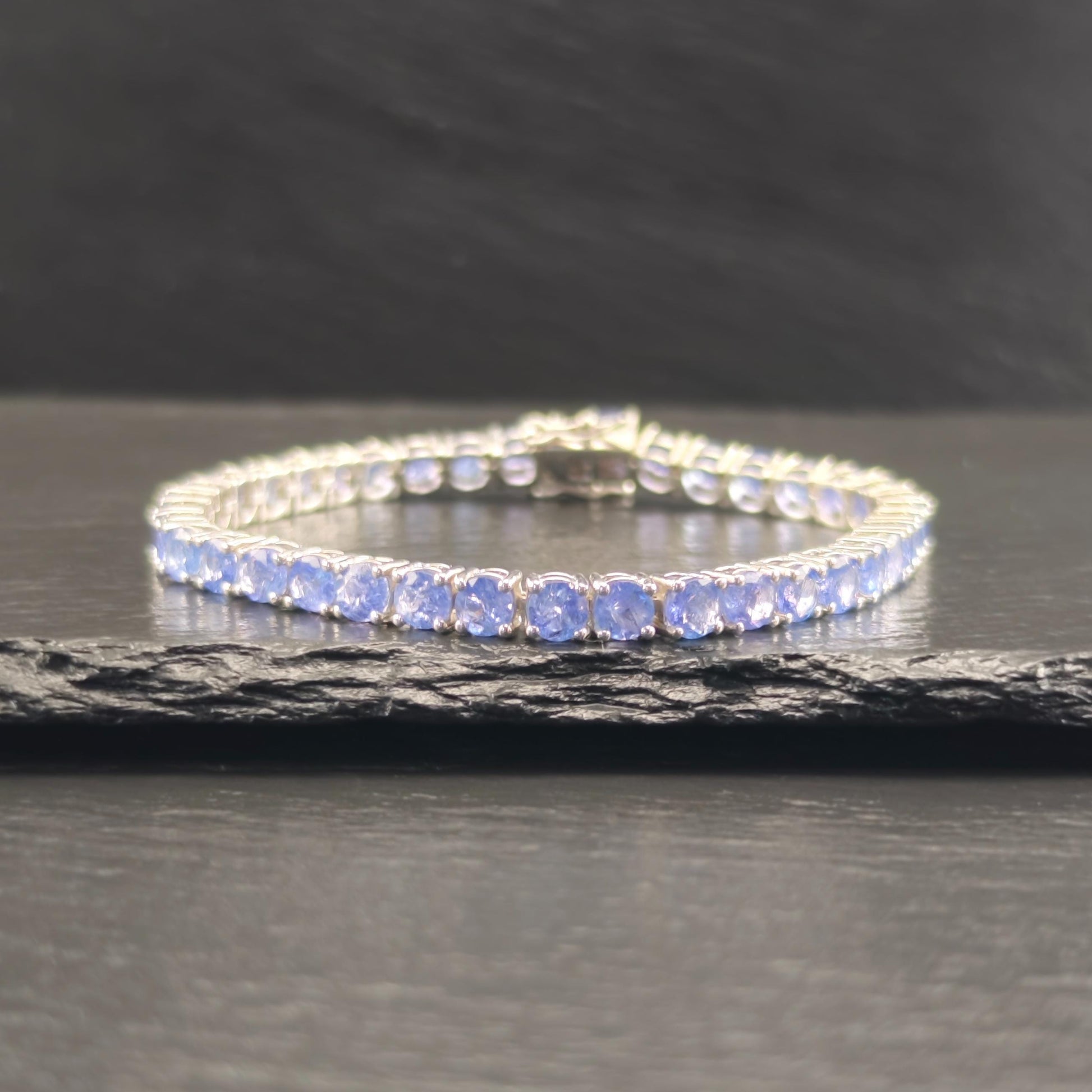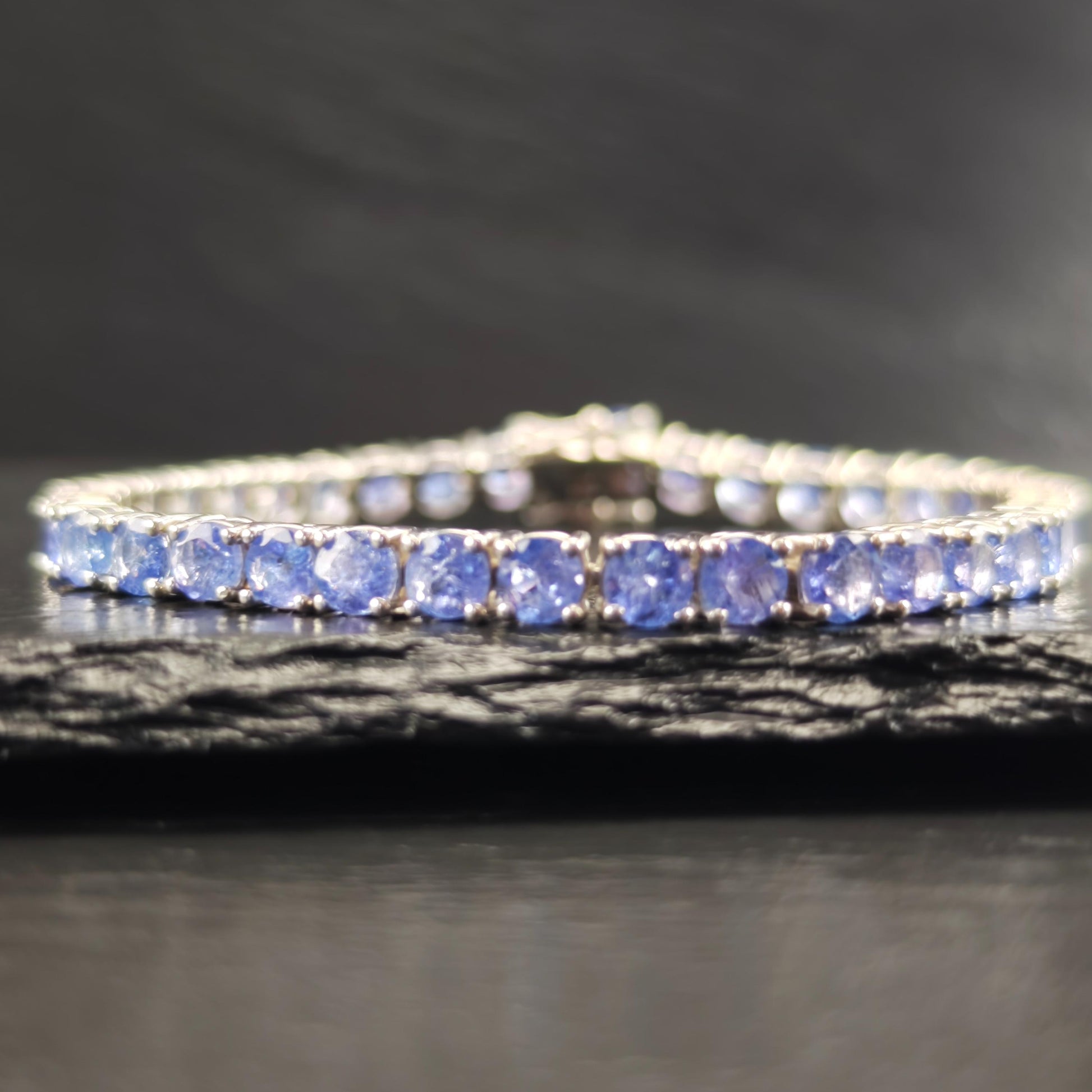 Discover this stunning vintage line bracelet featuring 14 carats total weight of exquisite Tanzanite gemstones set in elegant sterling silver. Each Tanzanite measures between 4.8mm and 5mm, with a total of 38 stones included in the design. The tanzanites are heavily included, adding to their unique character and charm.