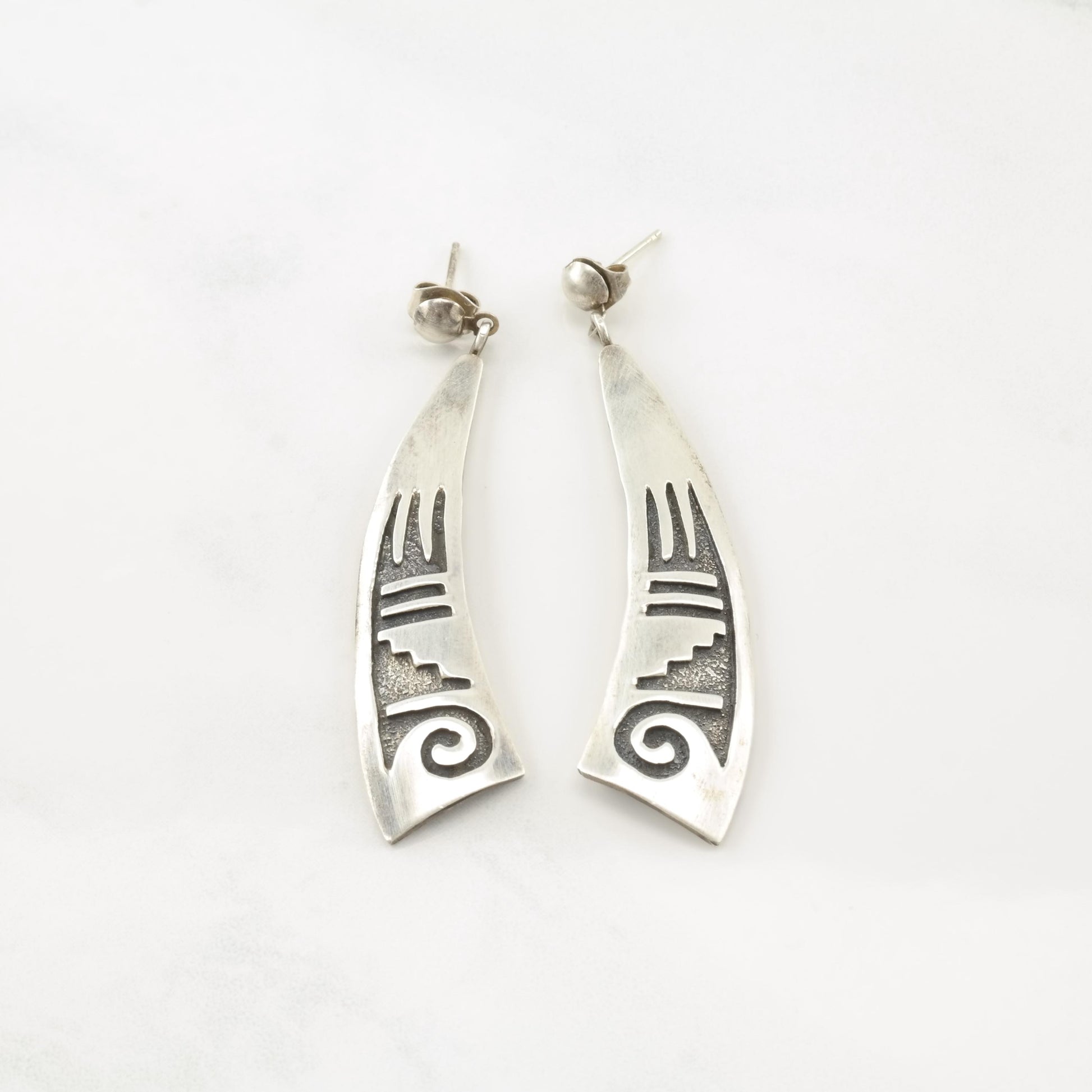 Vintage Native American Long, Overlay Sterling Silver Pierced Dangle Earrings