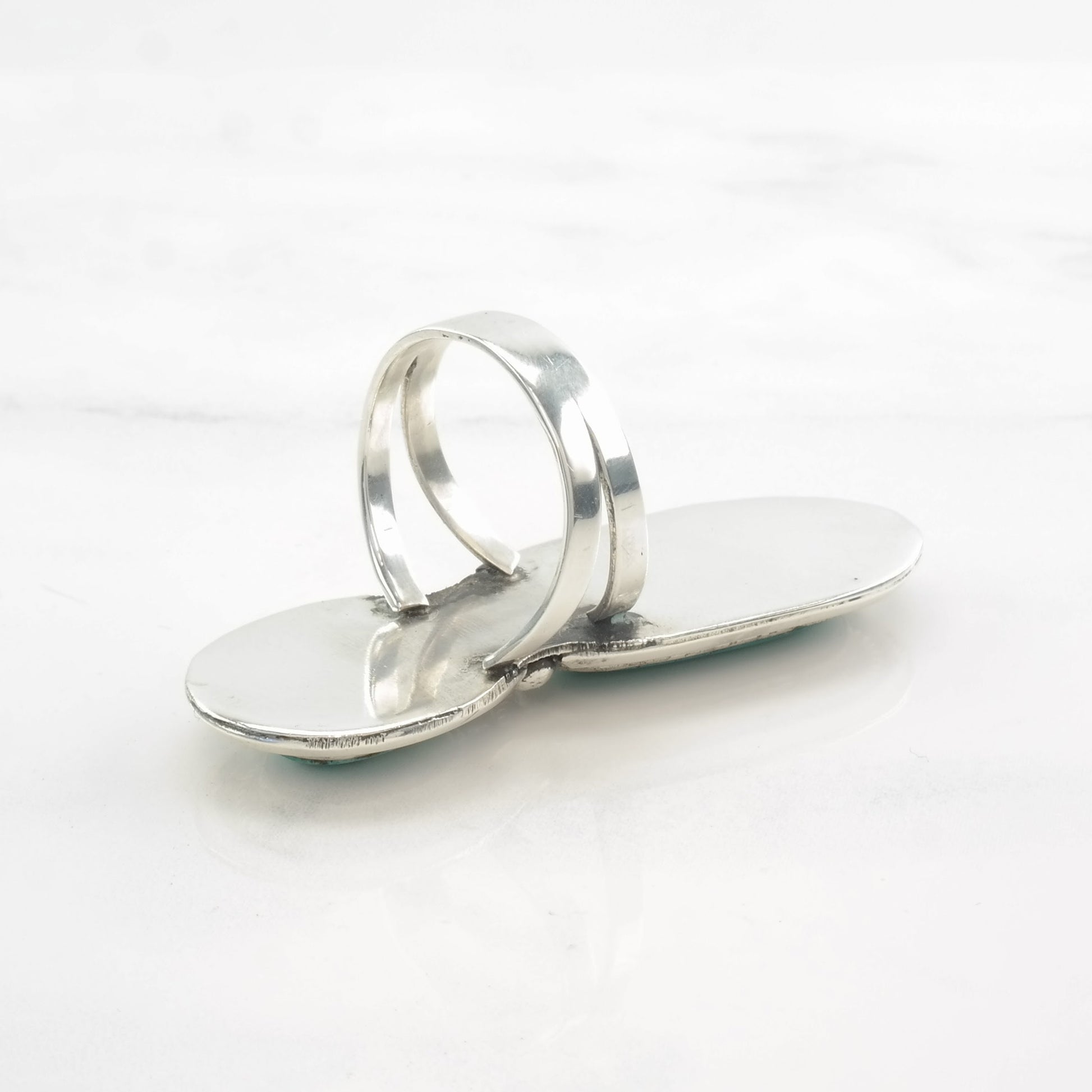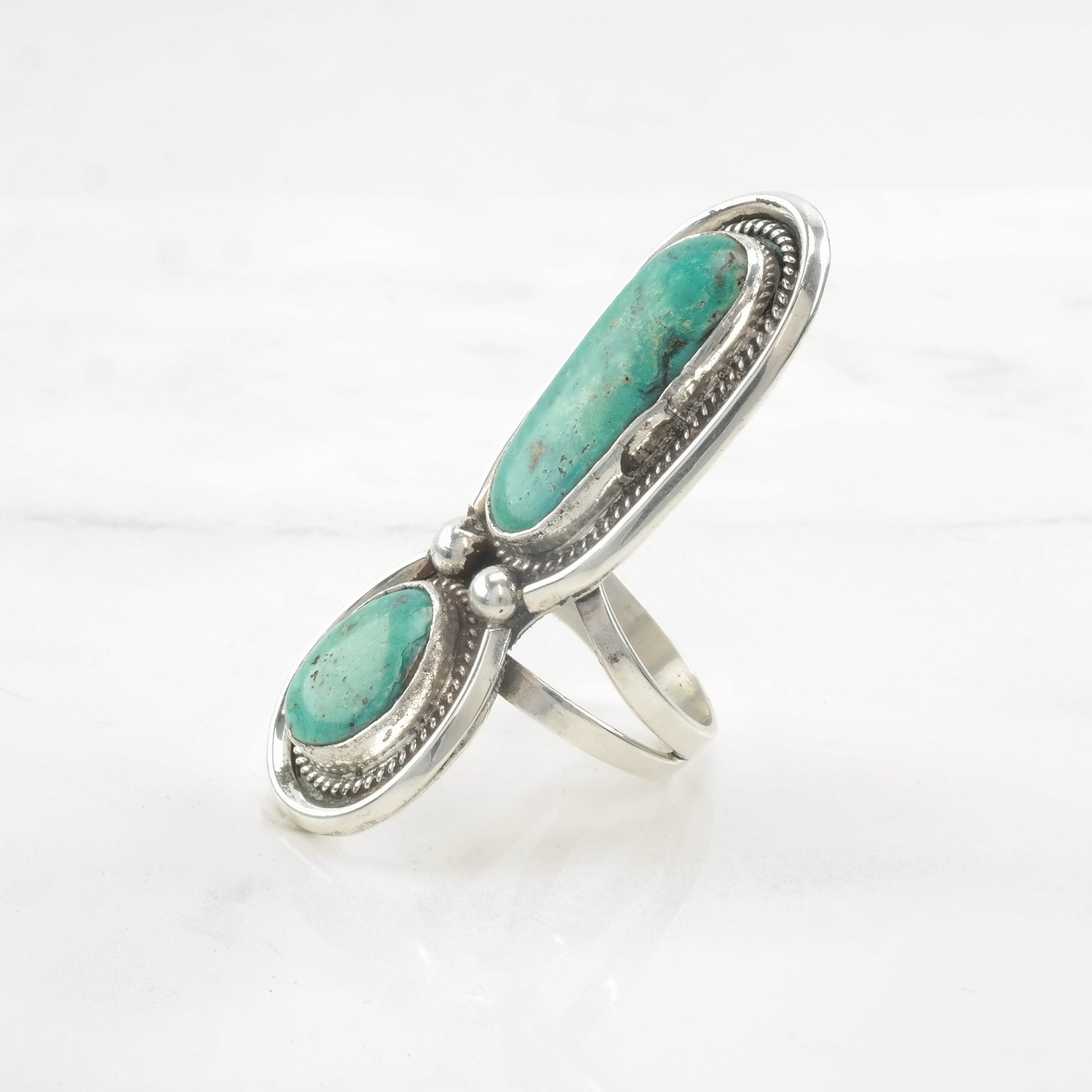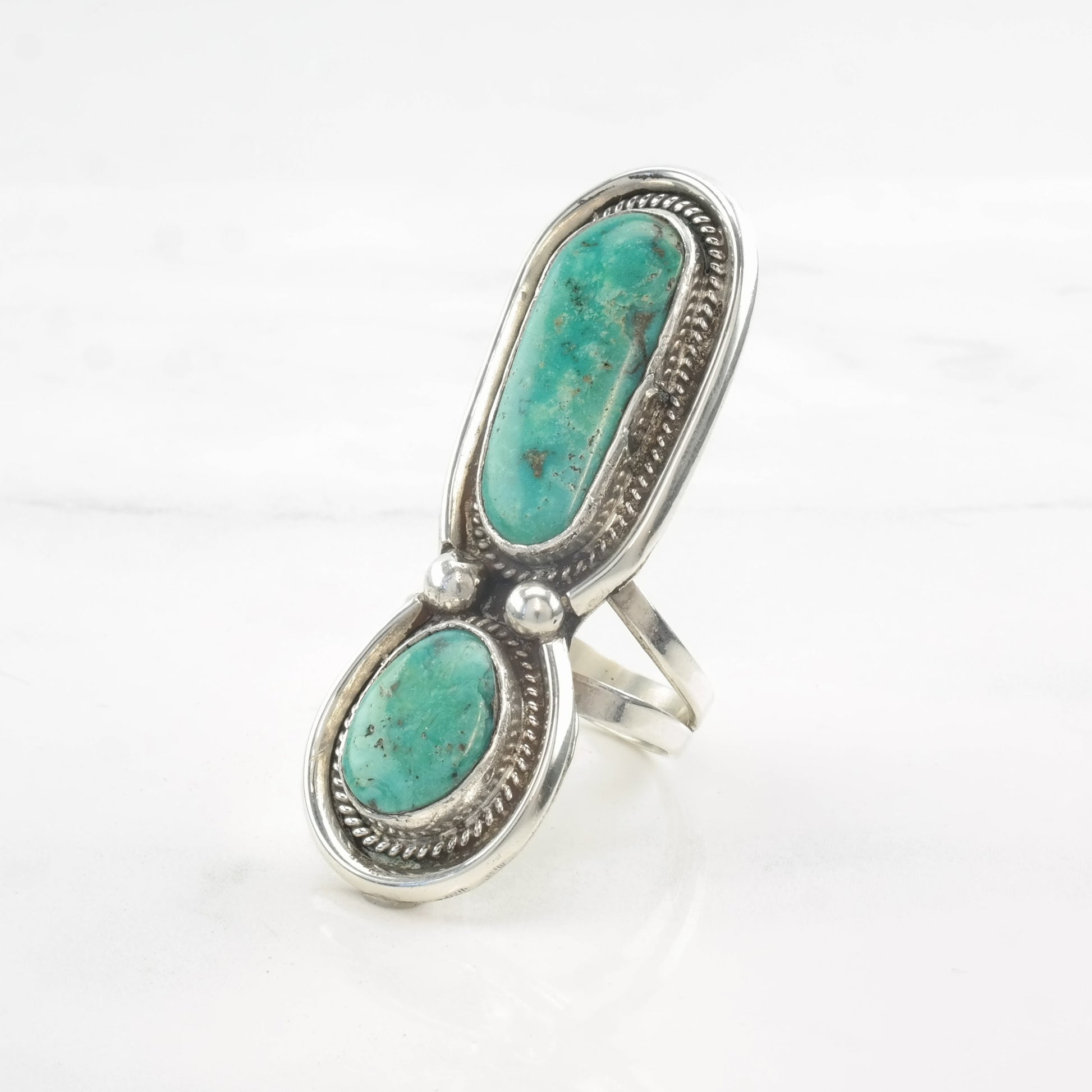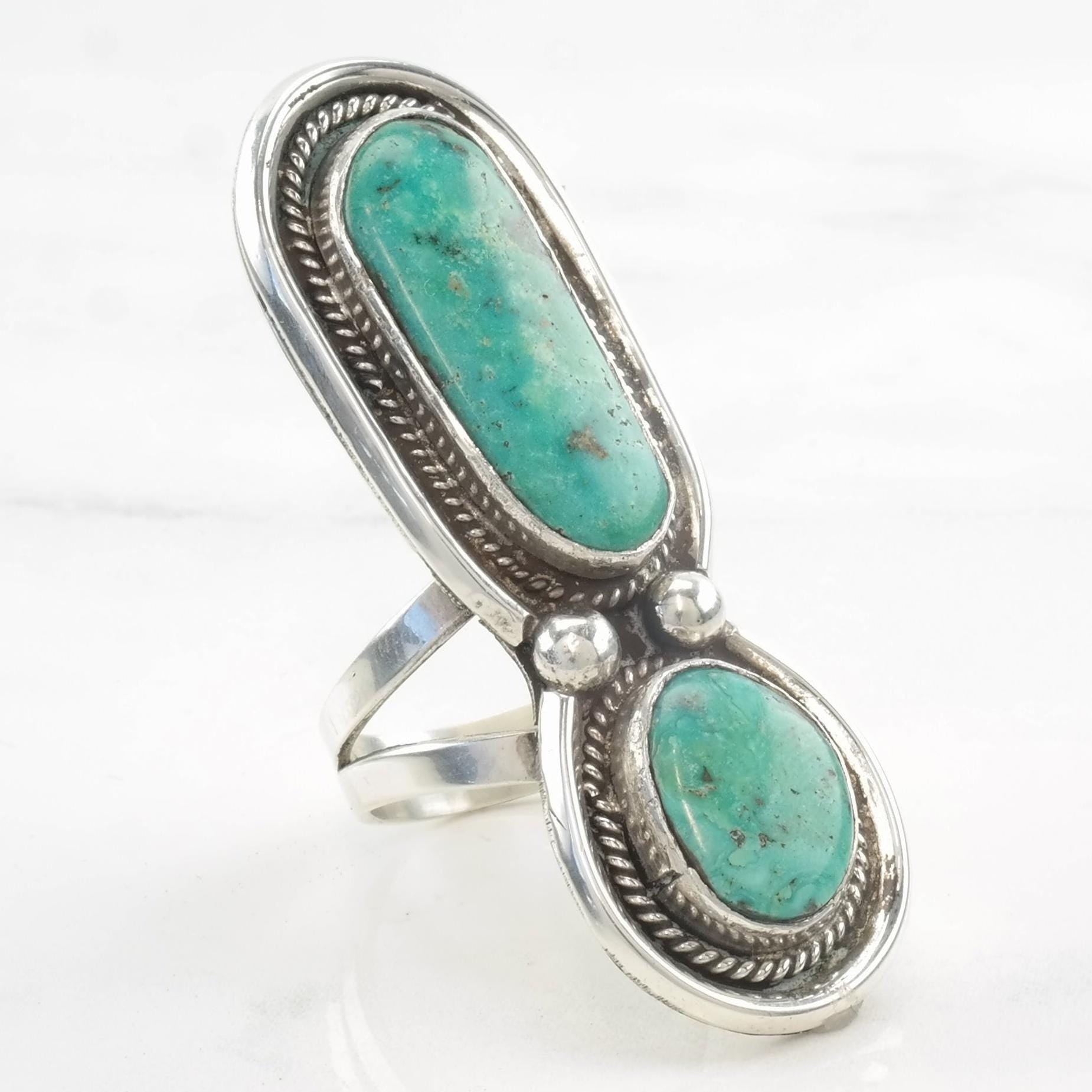 Vintage Native American Ring Two Stone, Turquoise Exclamation Point Sterling Silver Size 9
