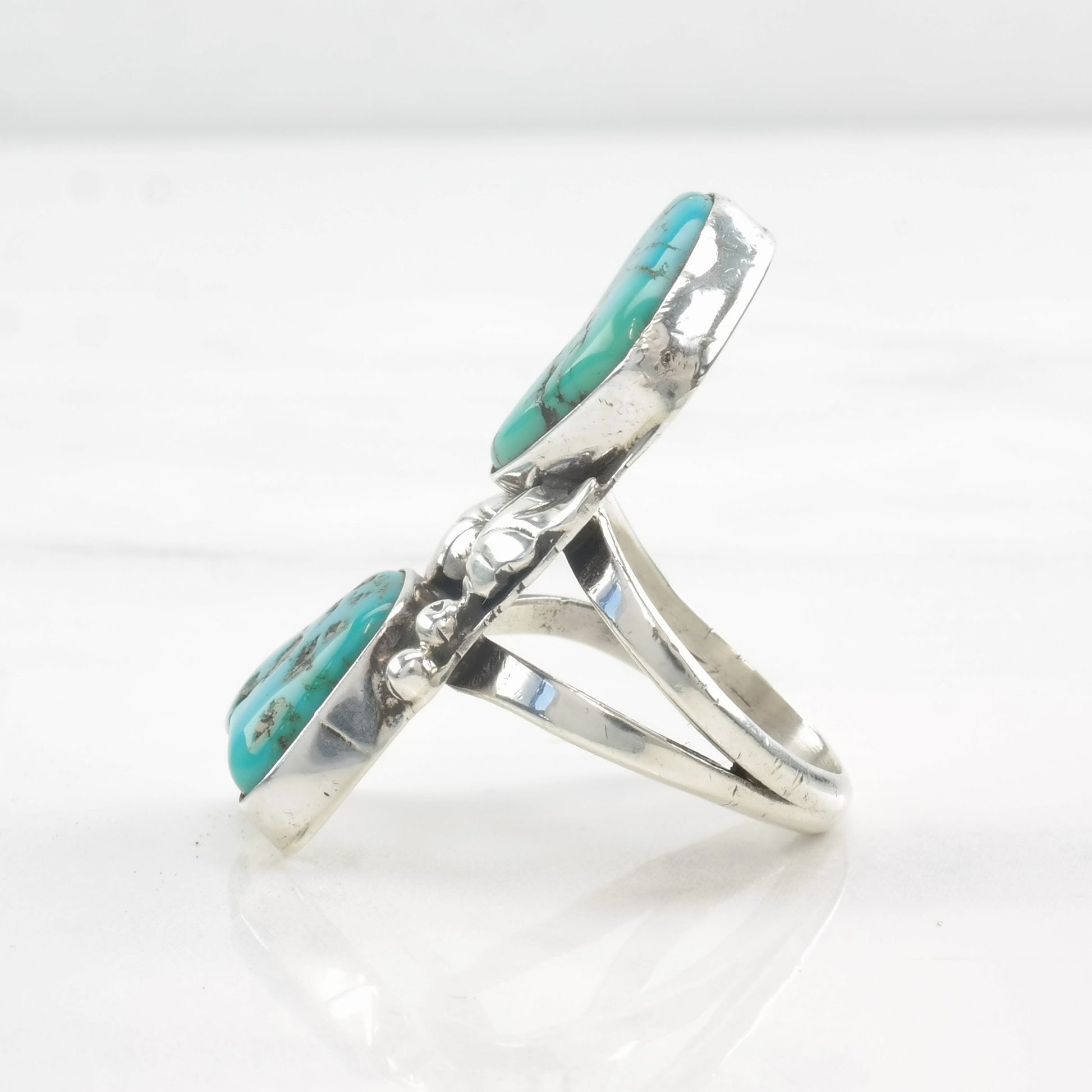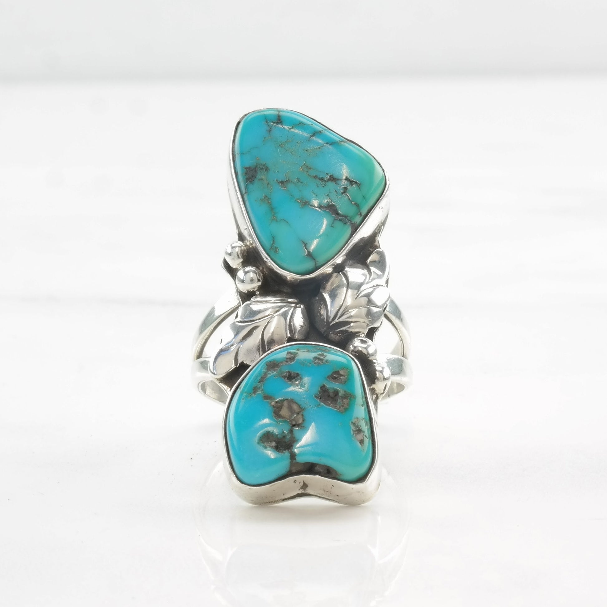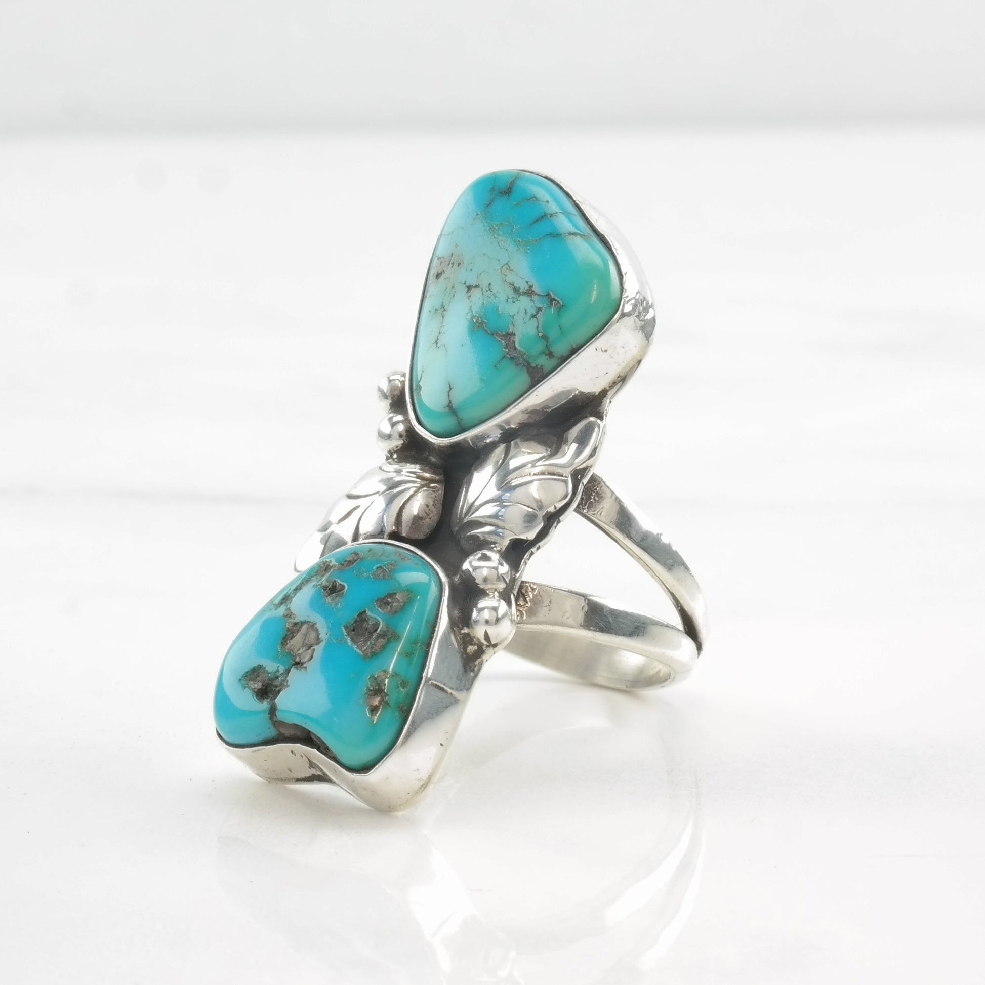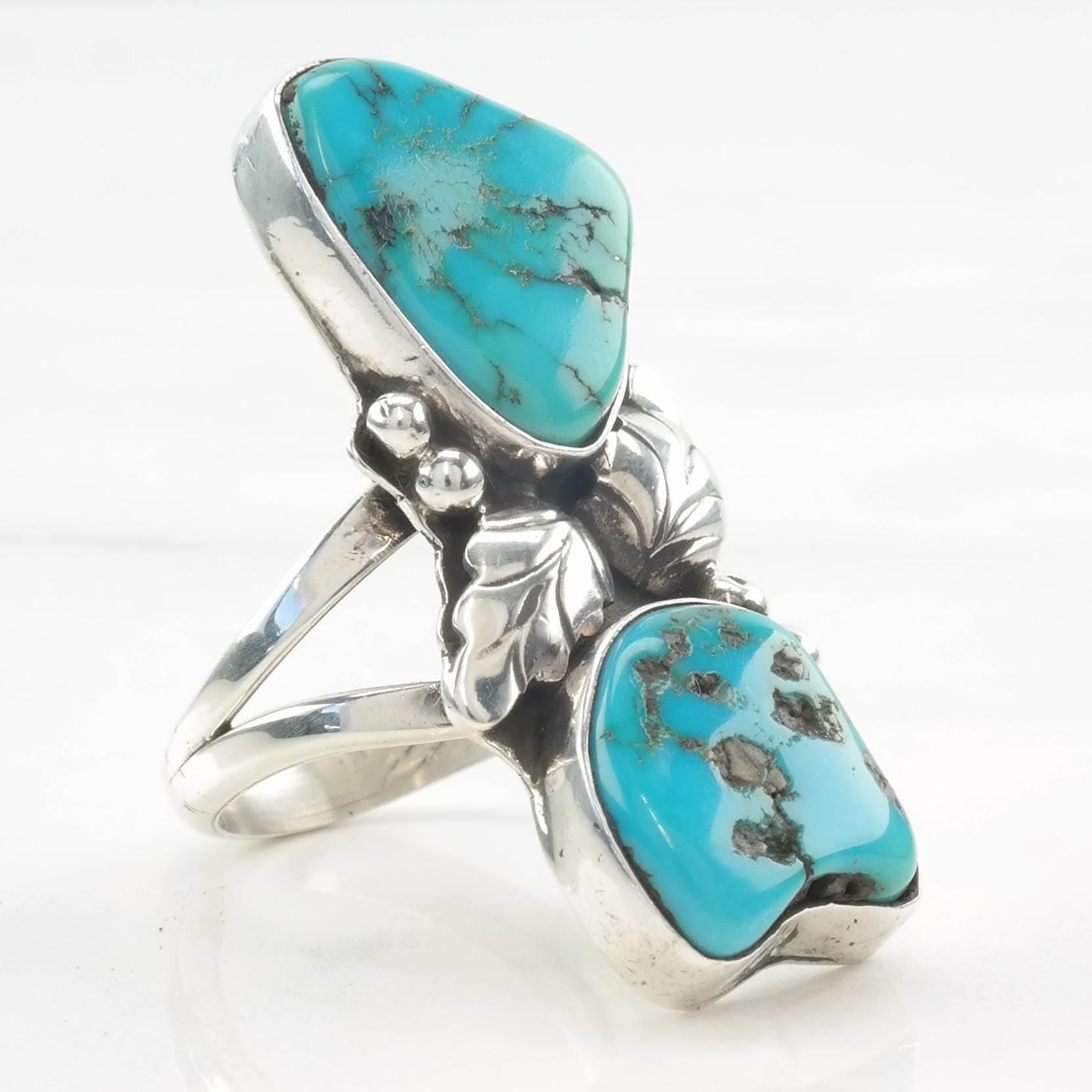 Vintage Native American Ring Two Stone Turquoise, Feather, Leaf Sterling Silver Size 7
