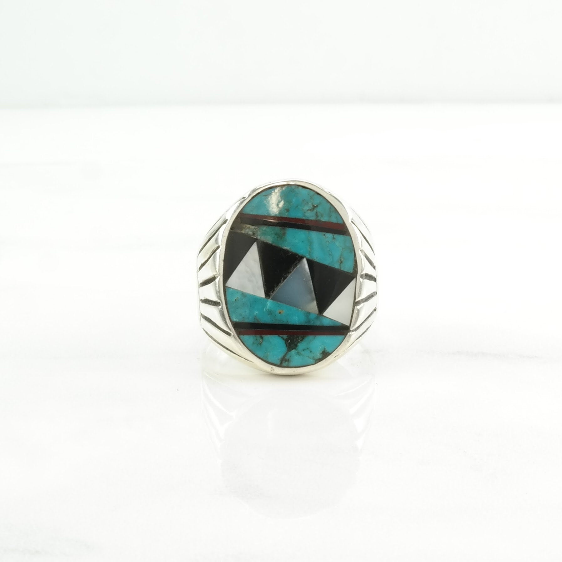 Vintage Native American Silver Ring Turquoise, Onyx, MOP Inlay Sterling Blue, Black, White Size 12 3/4