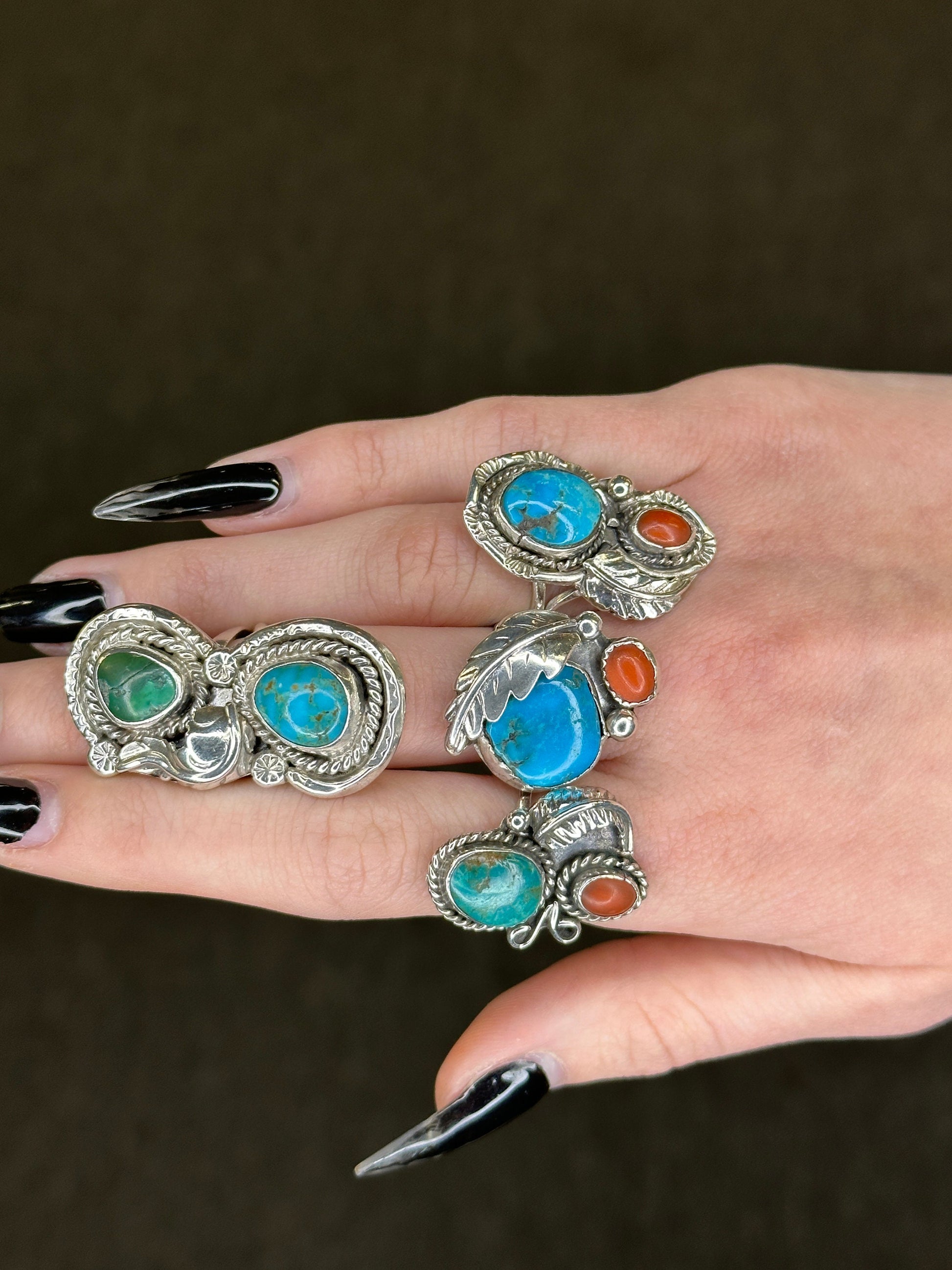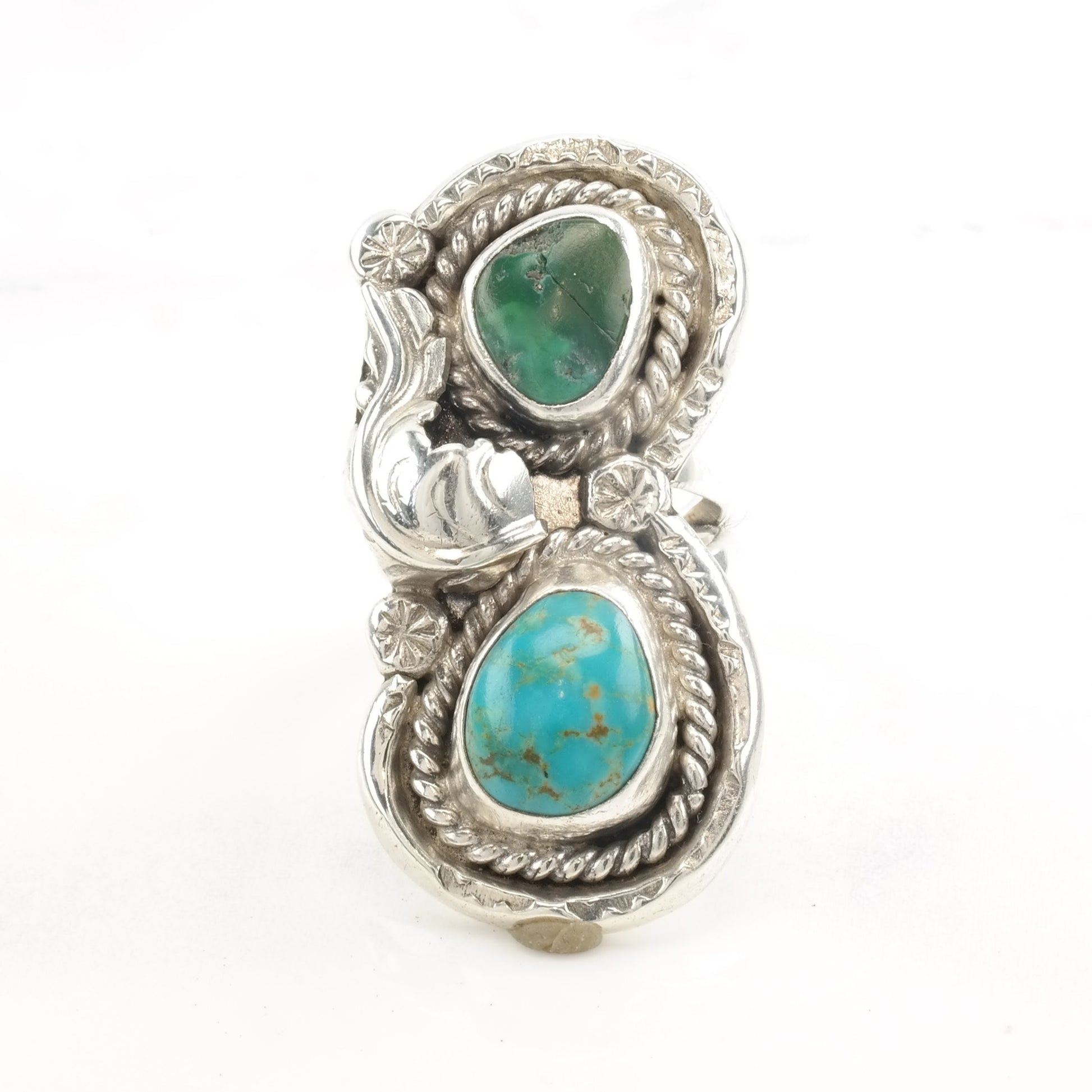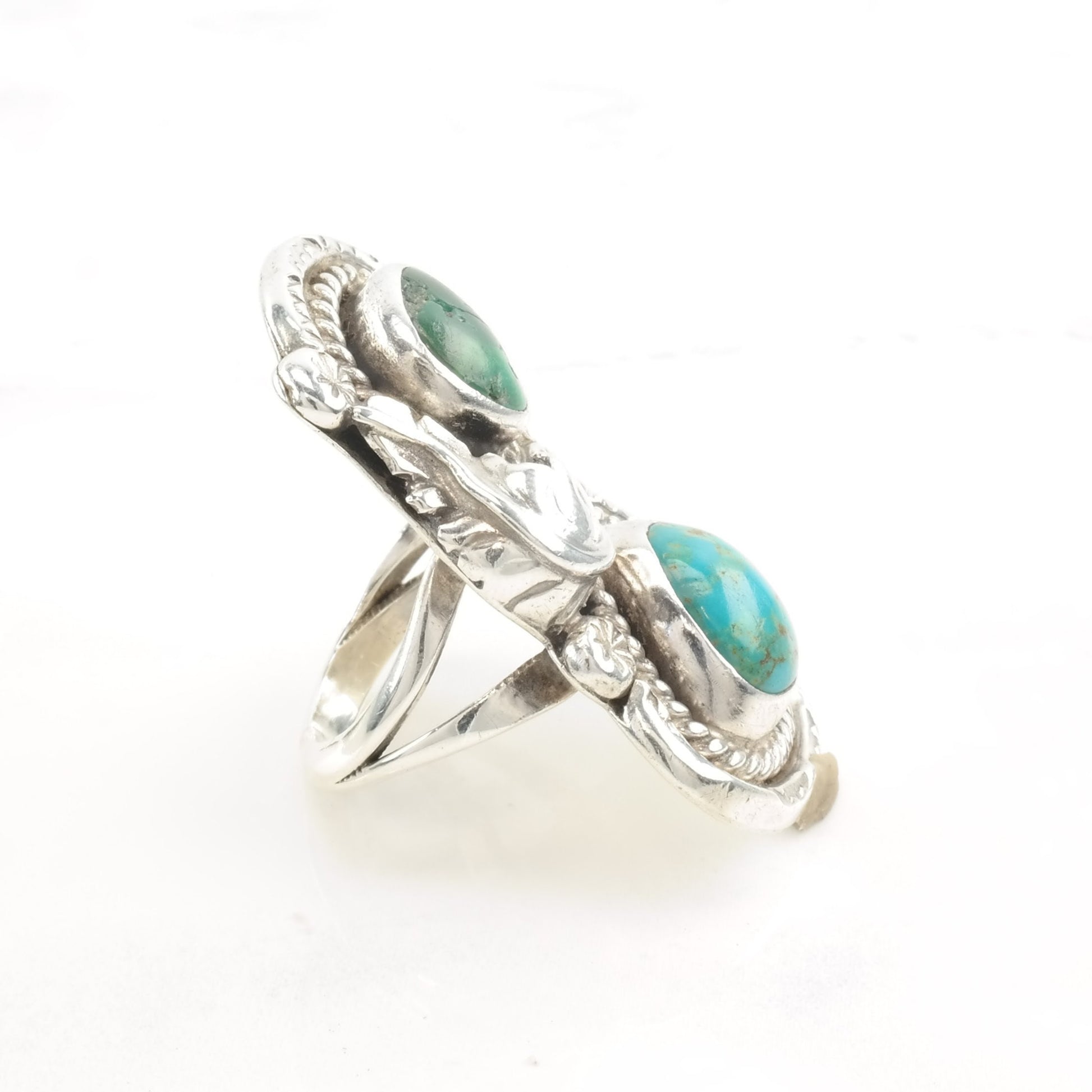 Vintage Native American Silver Ring Two Turquoise Leaf Size 6 3/4