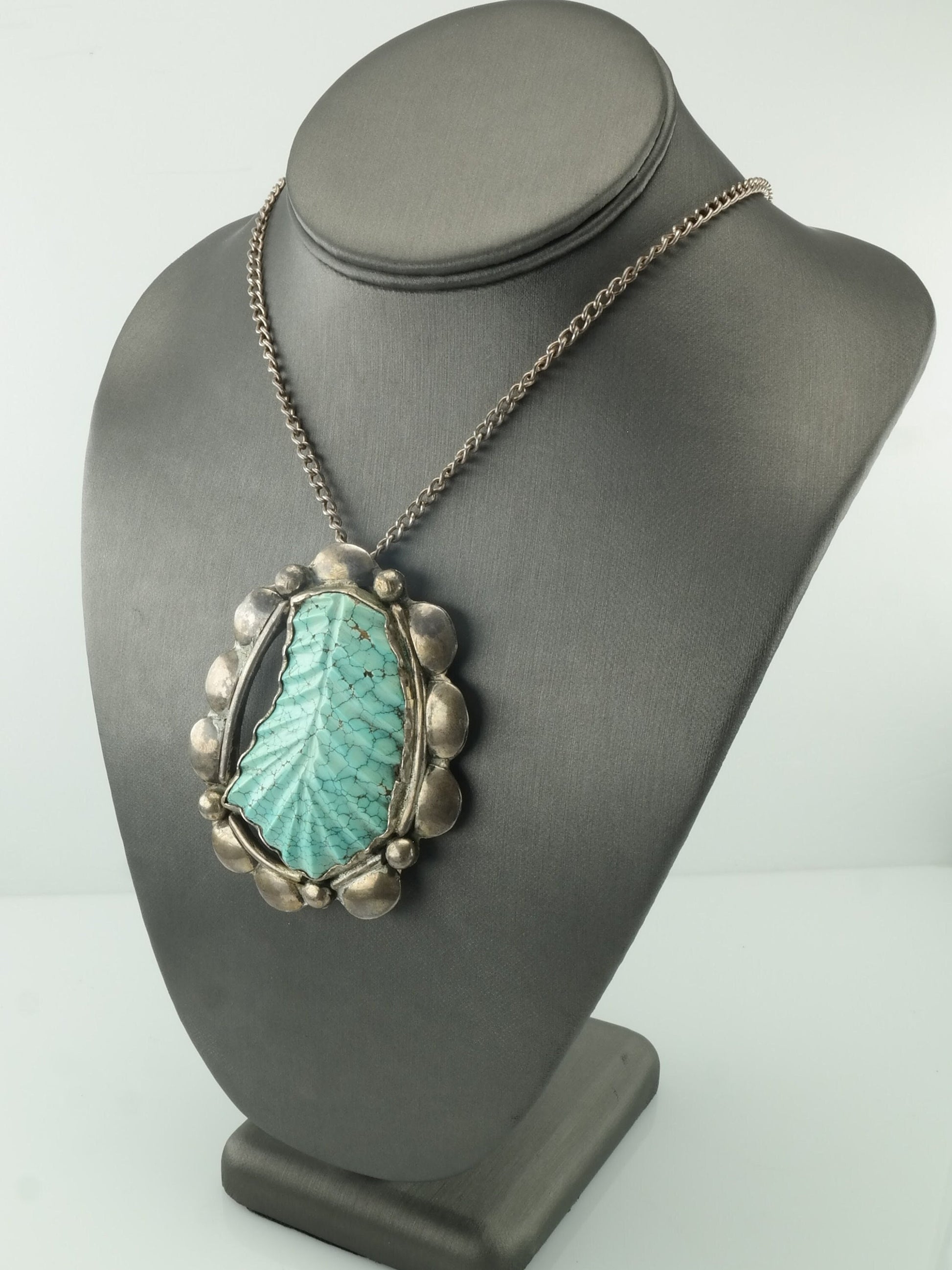Vintage Native American Sterling Silver Blue Spiderweb Carved Turquoise Leaf Necklace