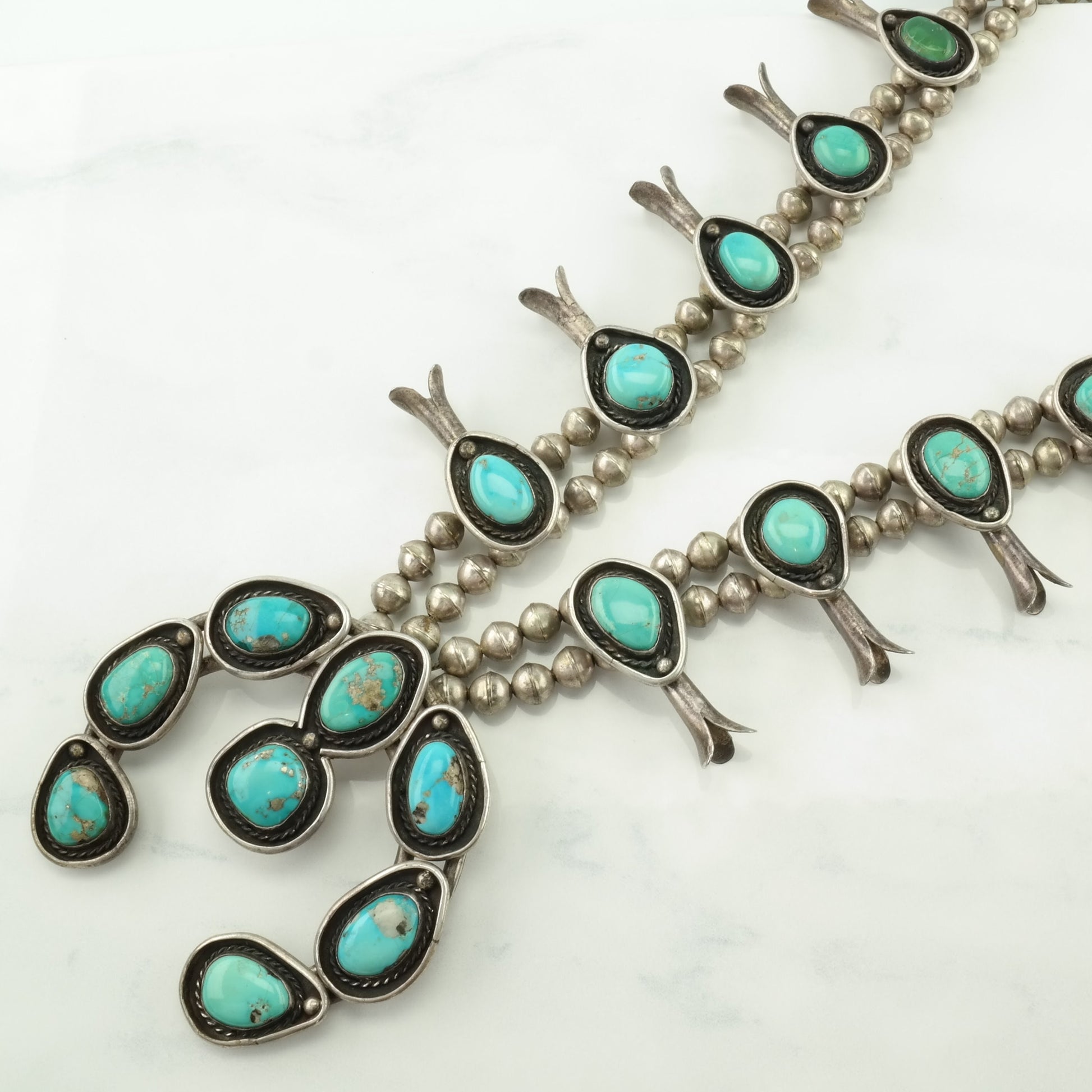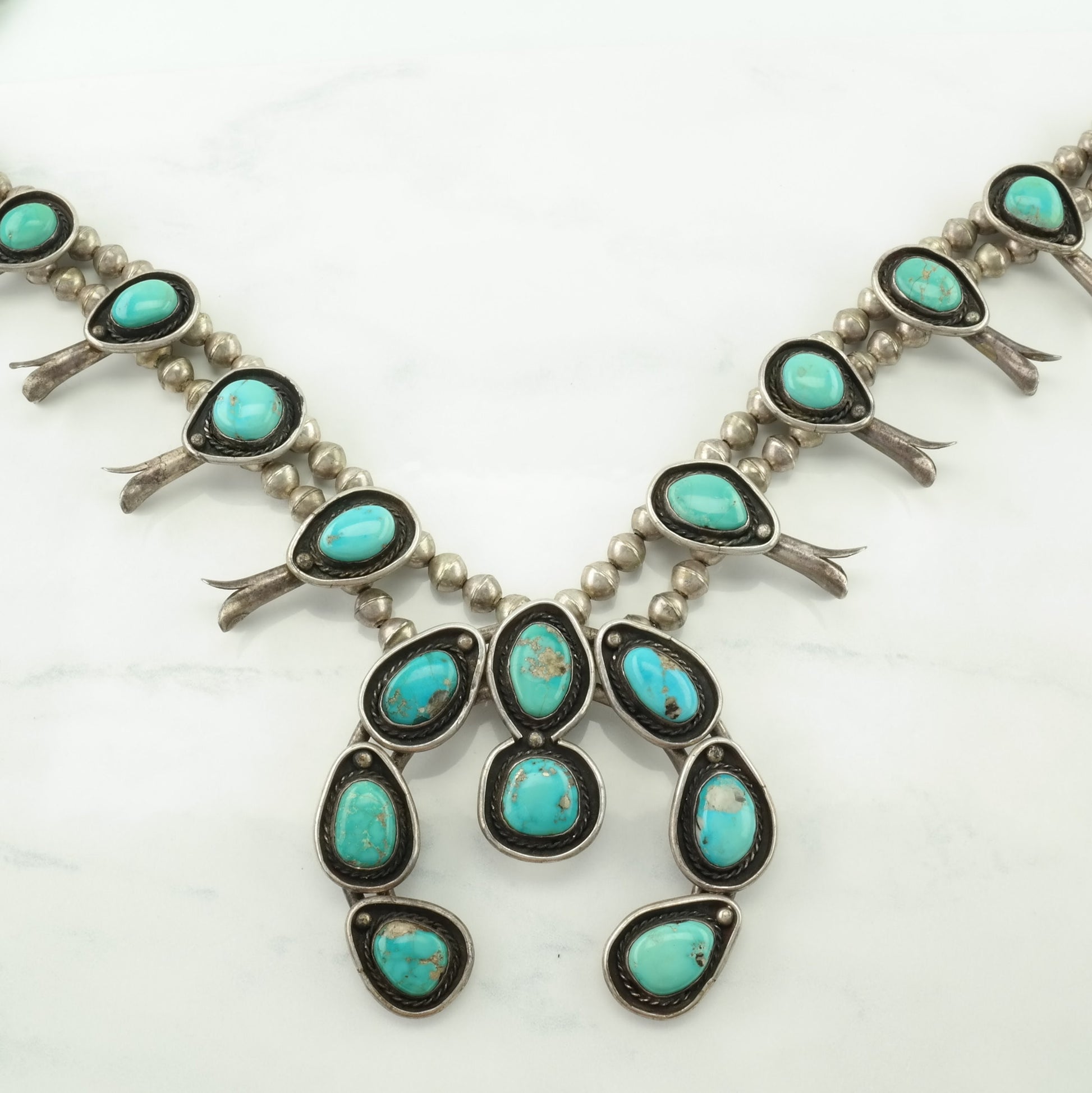 Vintage Native American Sterling Silver Blue Turquoise Squash Blossom Necklace