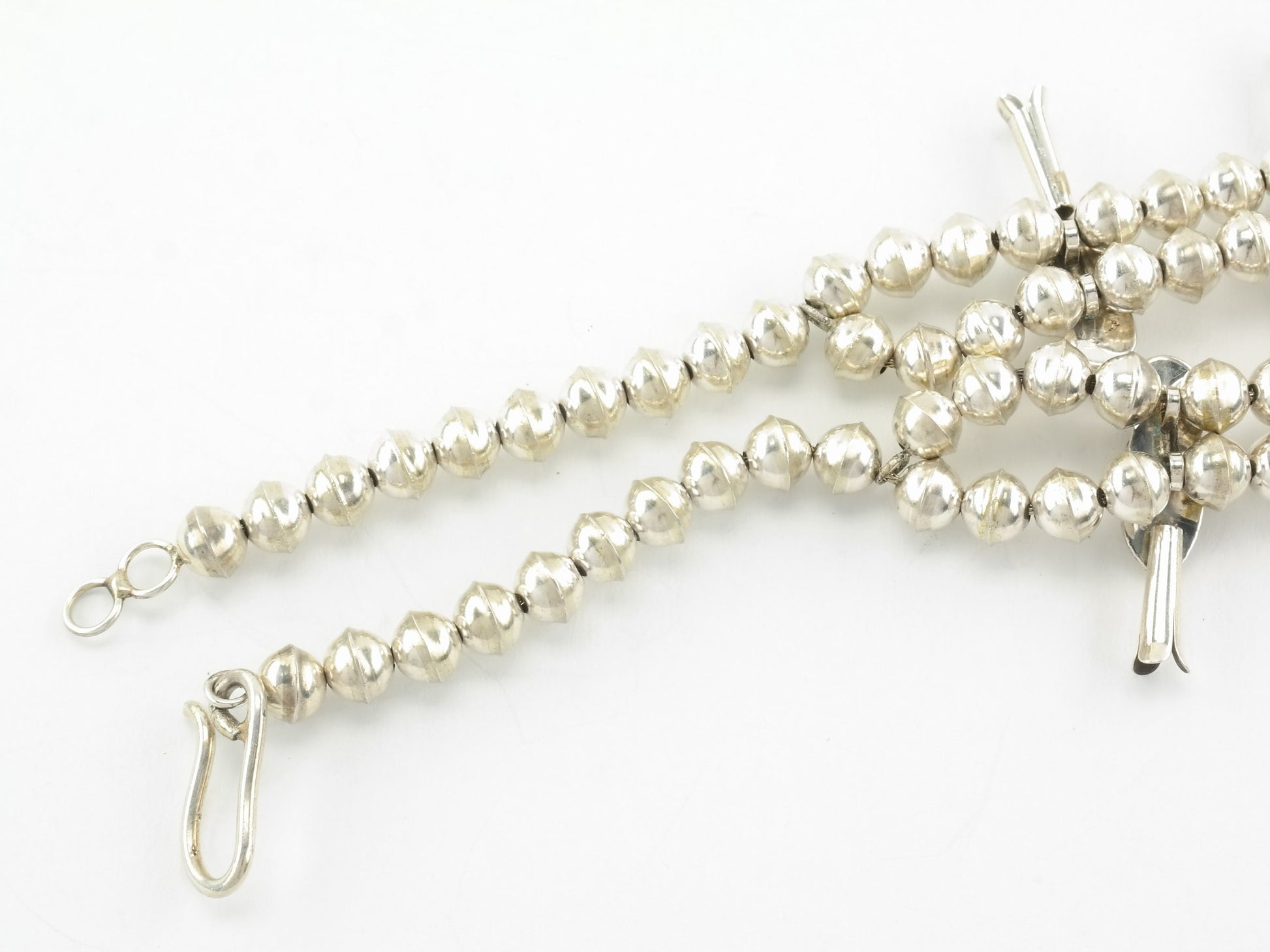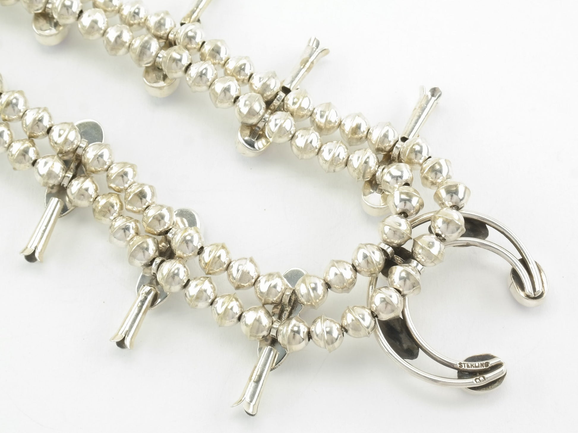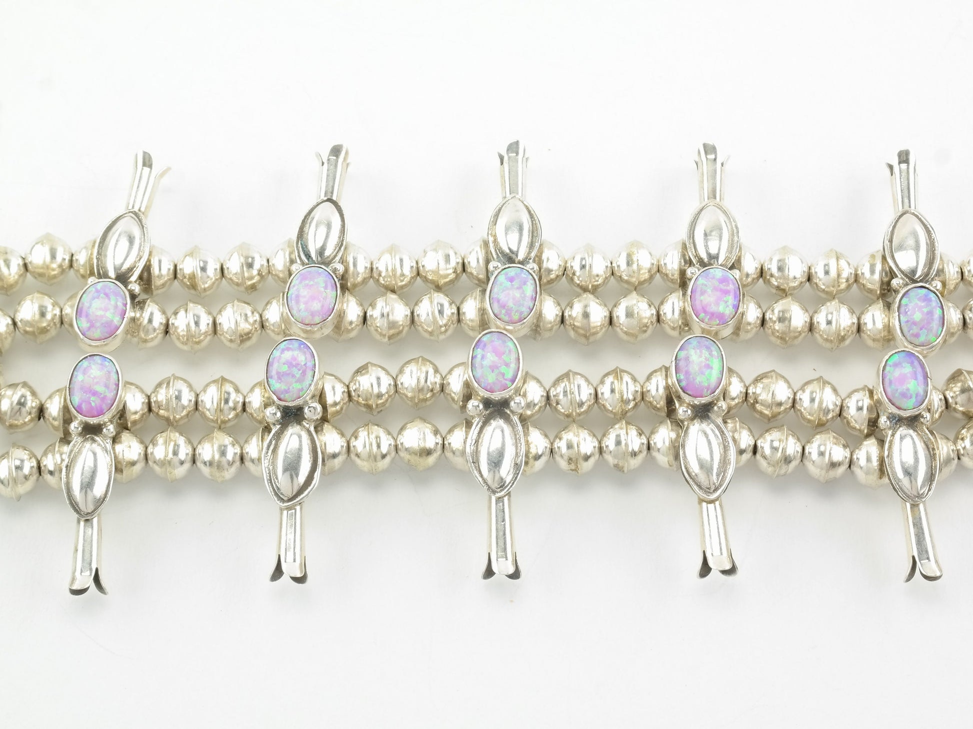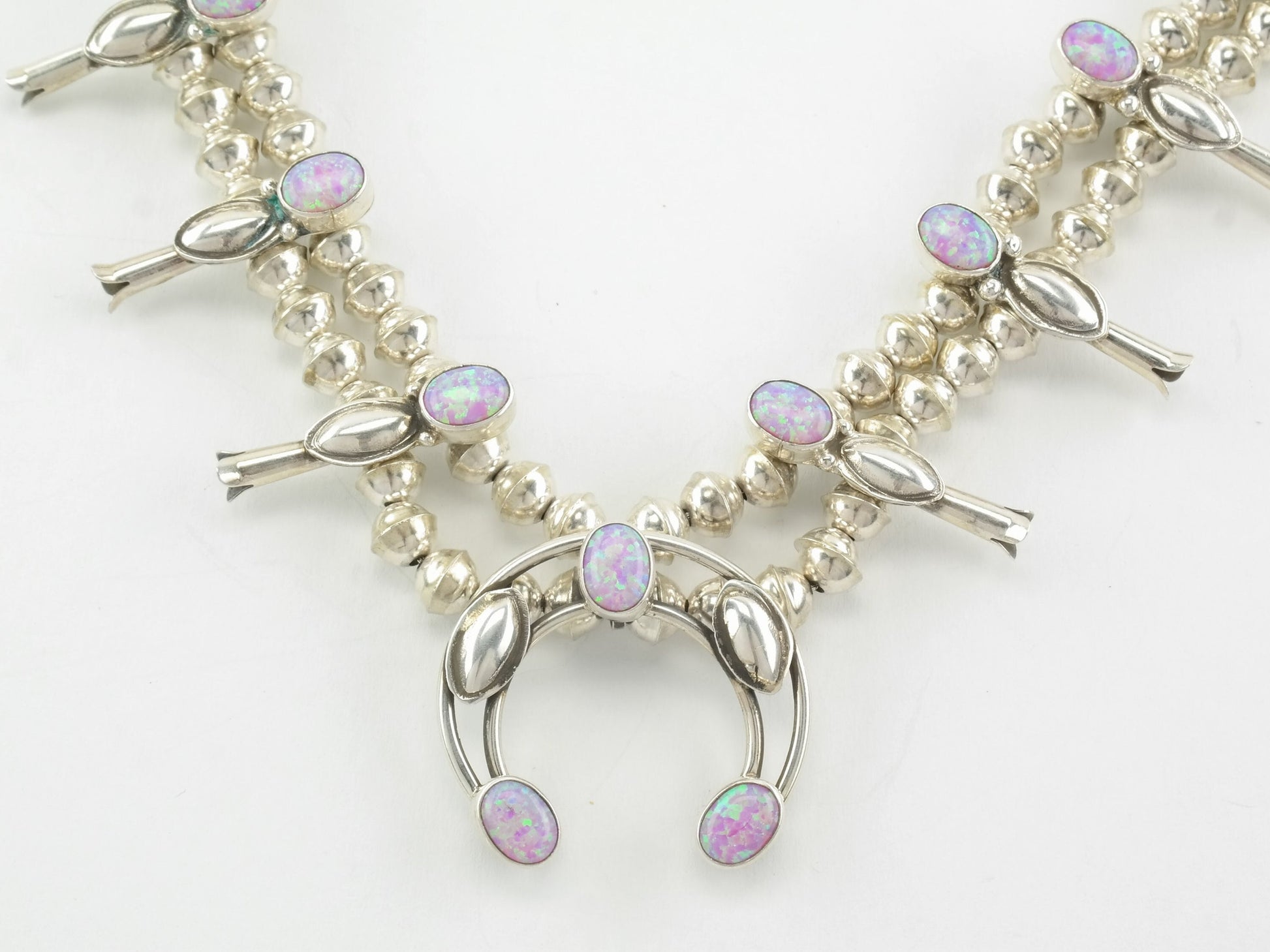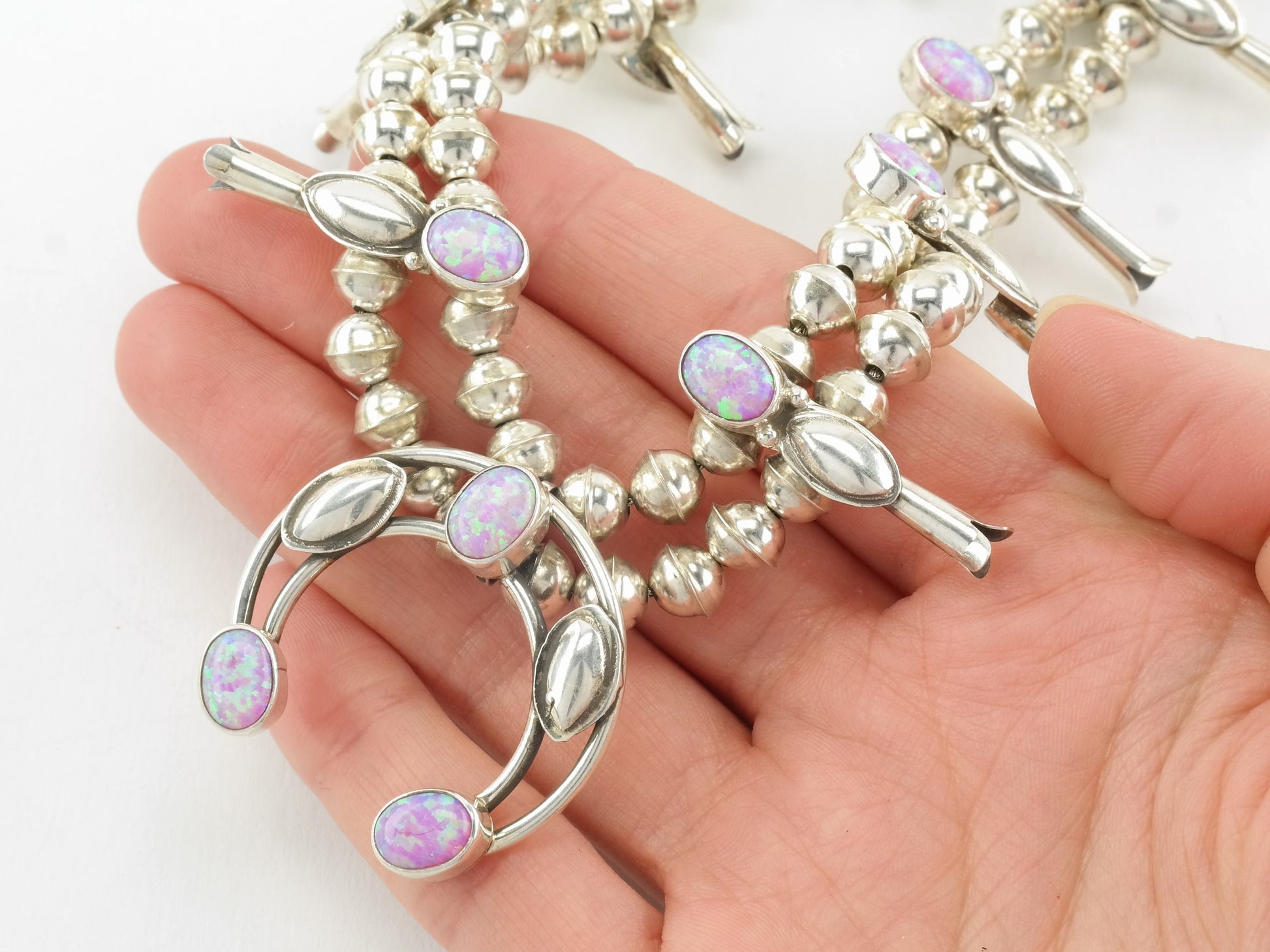 Vintage Native American Sterling Silver Pink Lab Opal Squash Blossom Necklace