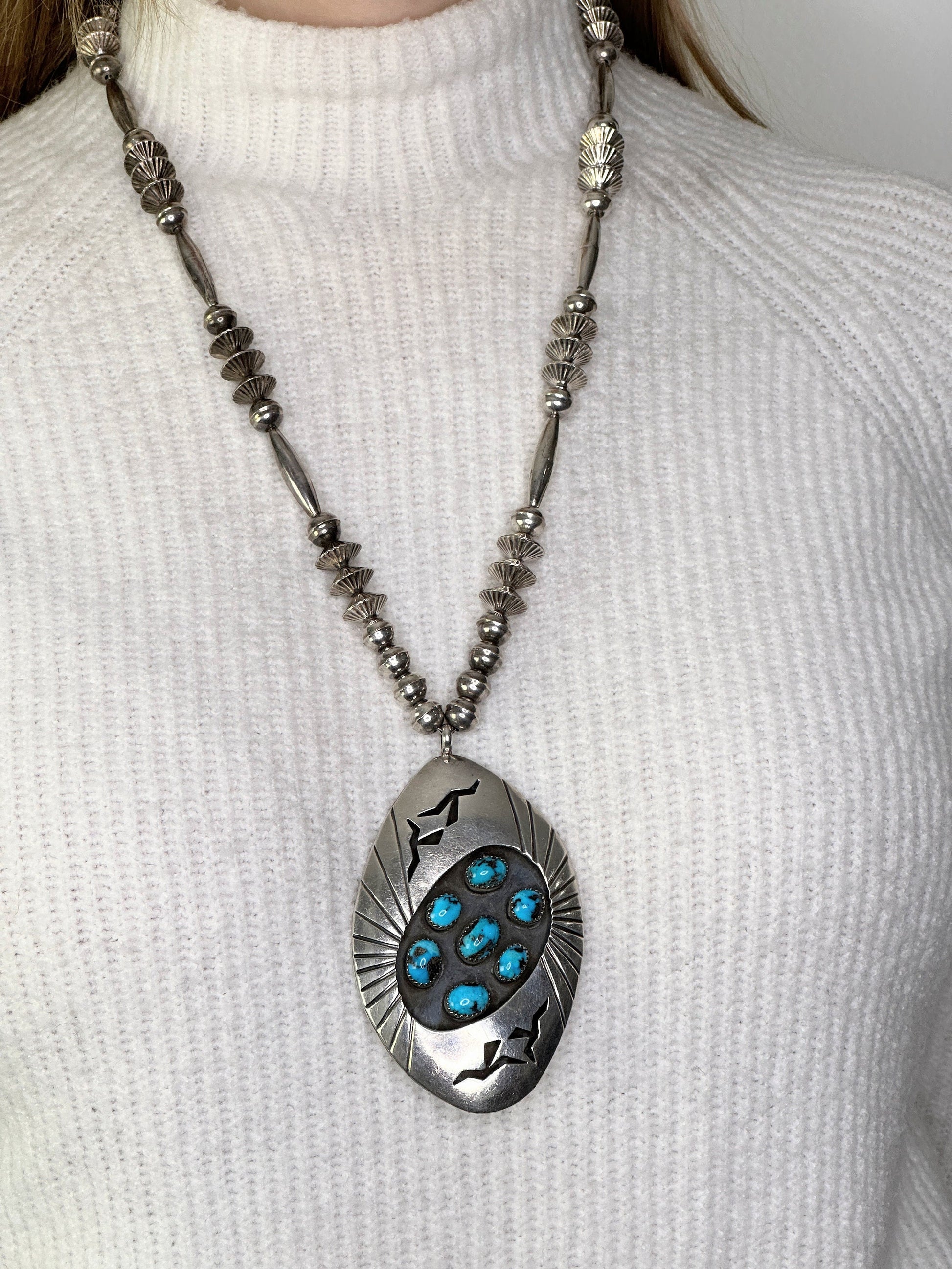 Beautifully unique, this vintage necklace was created using vintage Native American sterling silver Navajo beads and Turquoise.