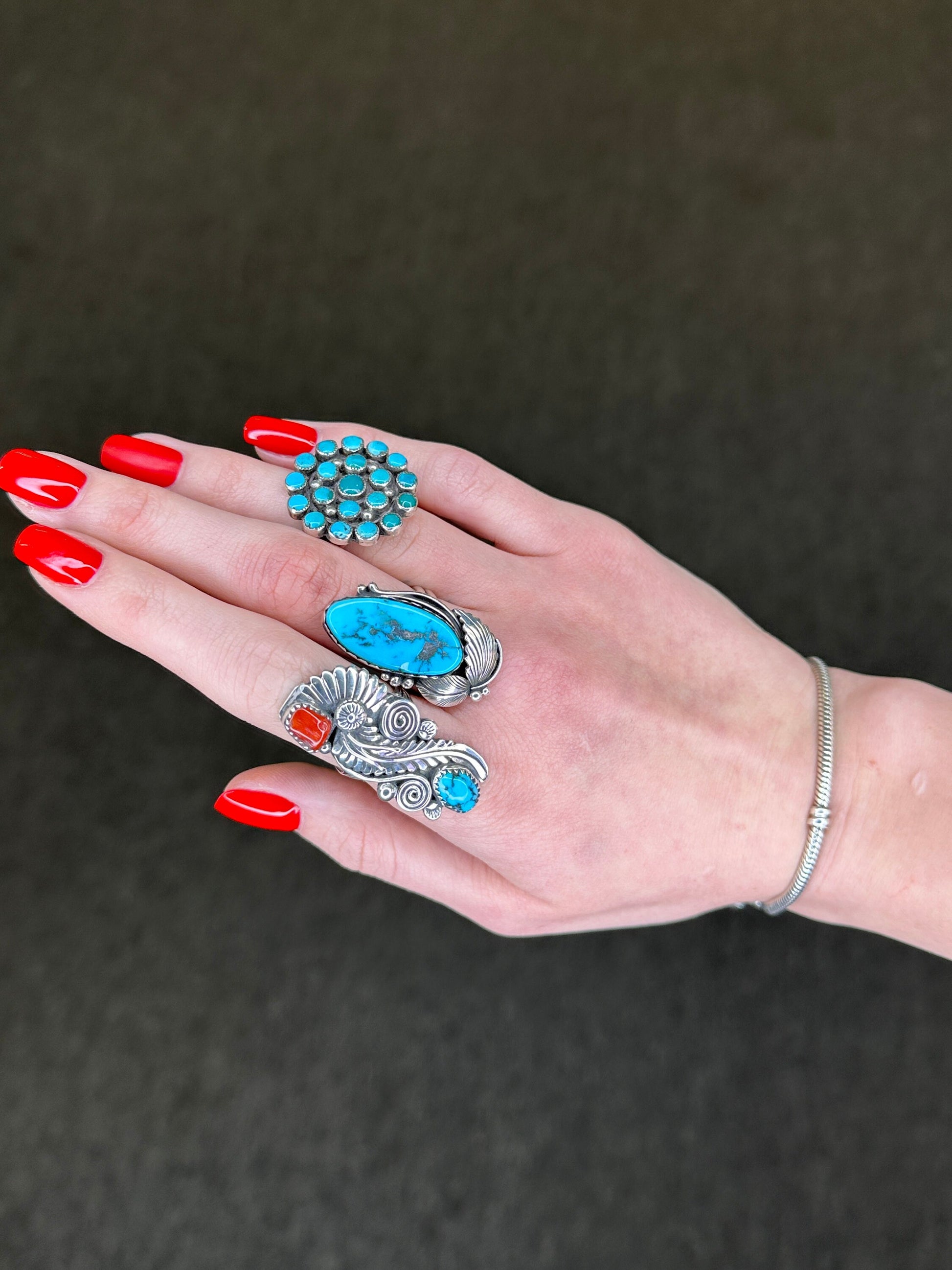 This captivating vintage Native American ring features a cluster of vibrant blue turquoise stones set in a handcrafted sterling silver band. With its classic design and beautiful patina, this ring is a testament to Native American artistry. Though the artist's signature is faint, this piece exudes the quality and craftsmanship characteristic of Zuni jewelry.