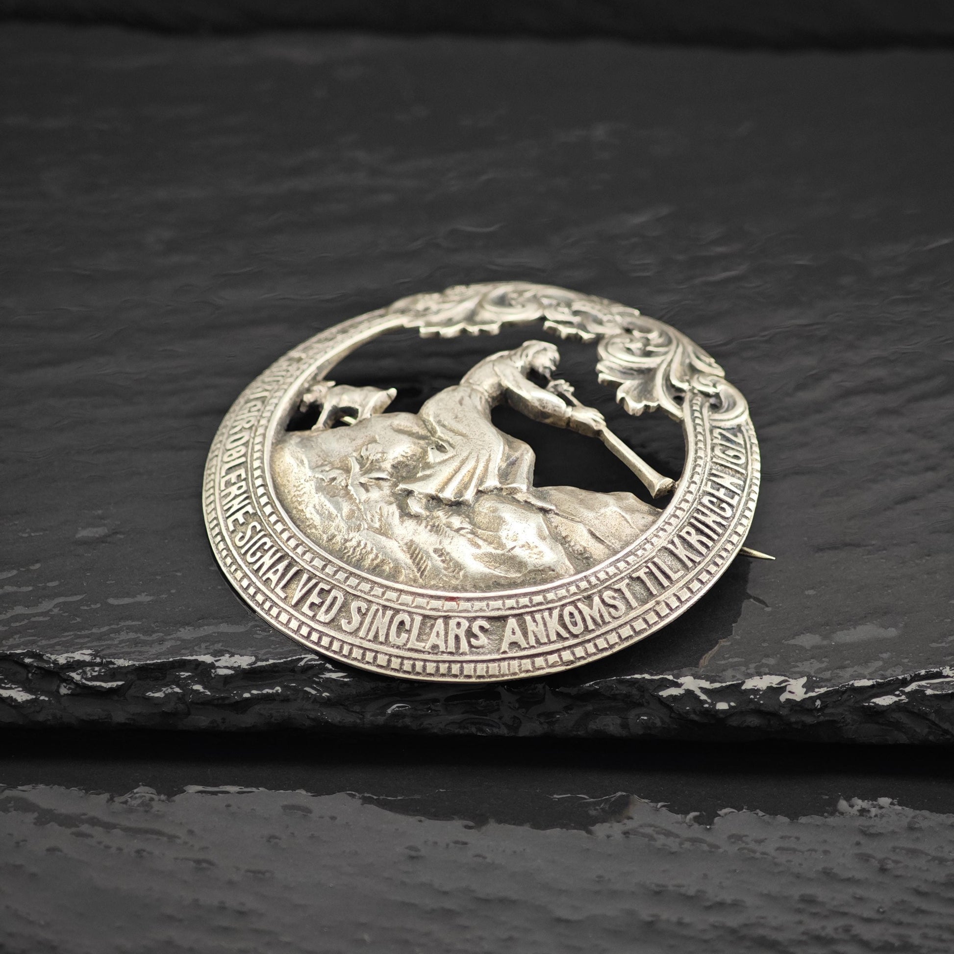Crafted in sterling silver, this brooch features the iconic Pillarguri design, known for its intricate detailing and cultural significance. The brooch is marked with D88, Helene 22/2-13, Pitcher Symbol, N.M., 293., 830. S, and the inscription "Pillar Guri Gir Dolerne Signal Ved Sinclars Ankomst Til Kringen 1612," ensuring its authenticity as a sterling silver piece.