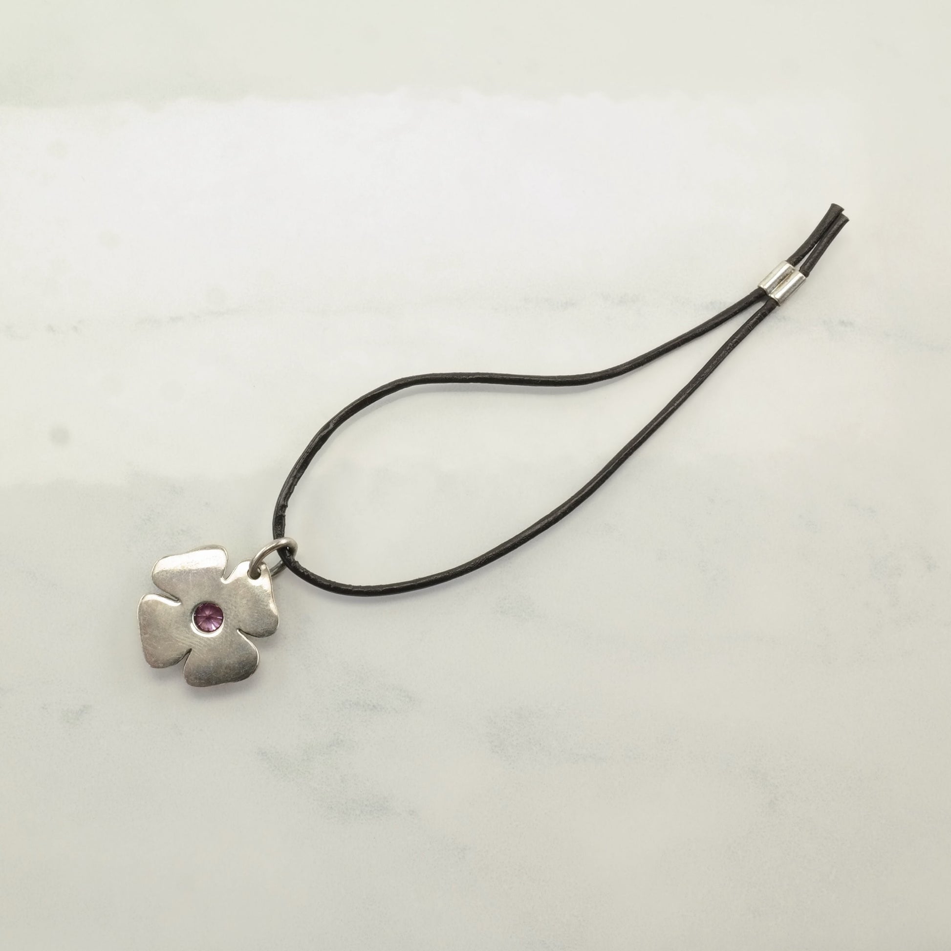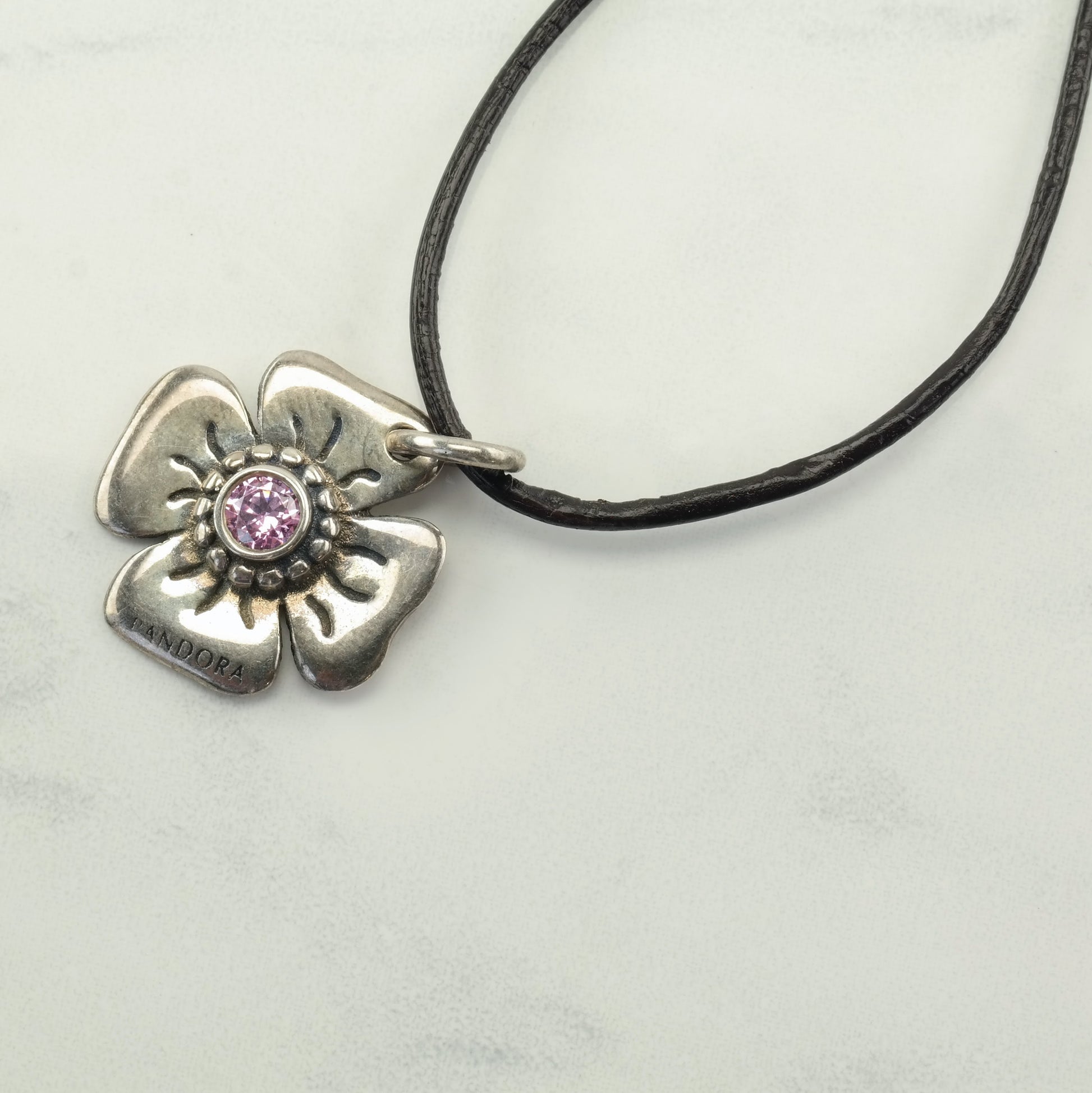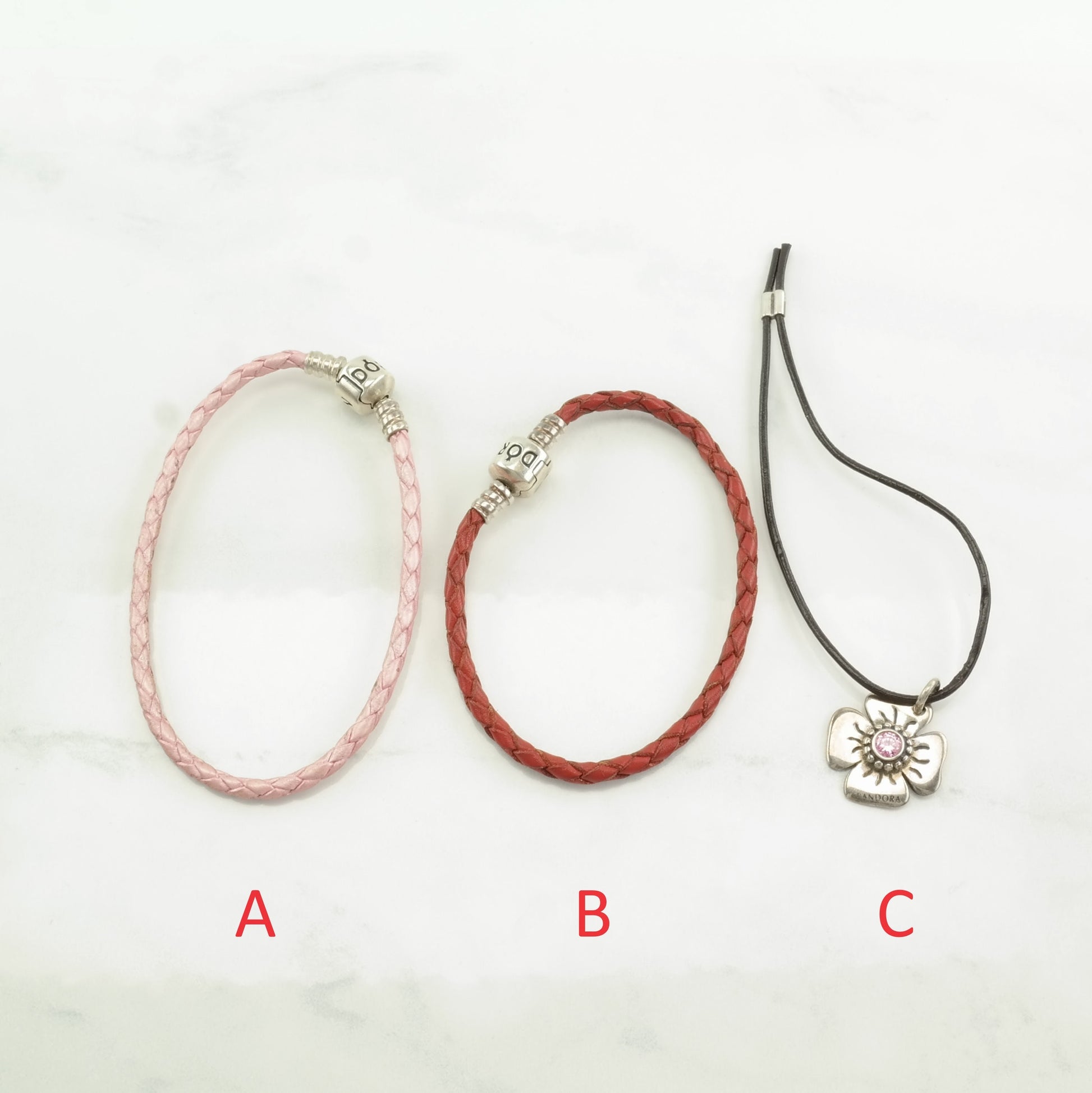 The stones or design is C: CZ A: Leather Braid, B: Leather Braid, C: Flower Charm