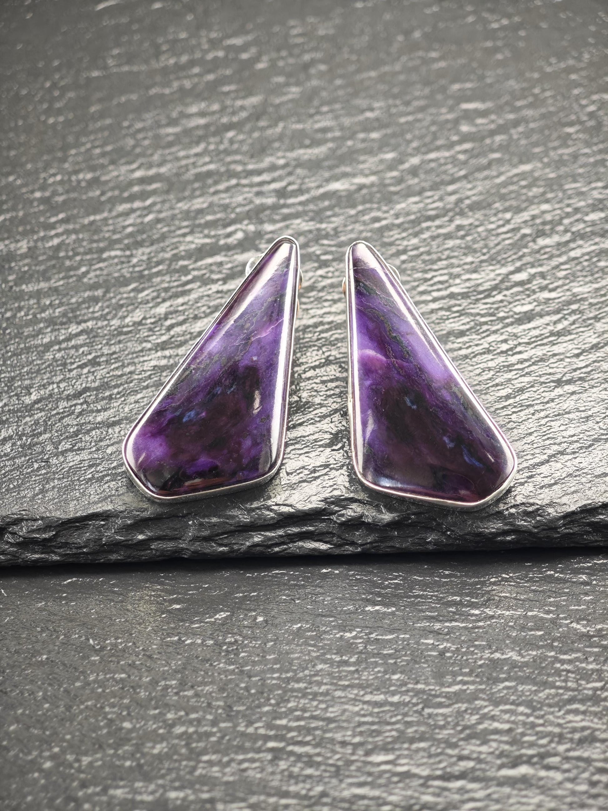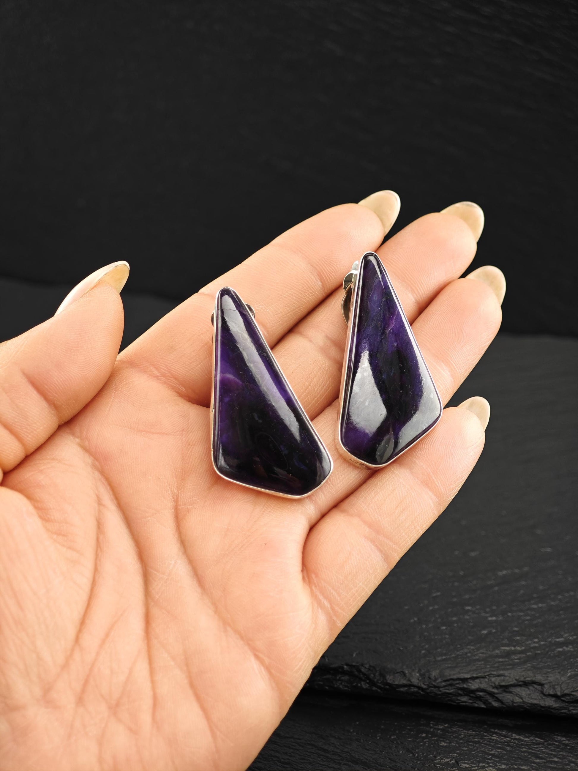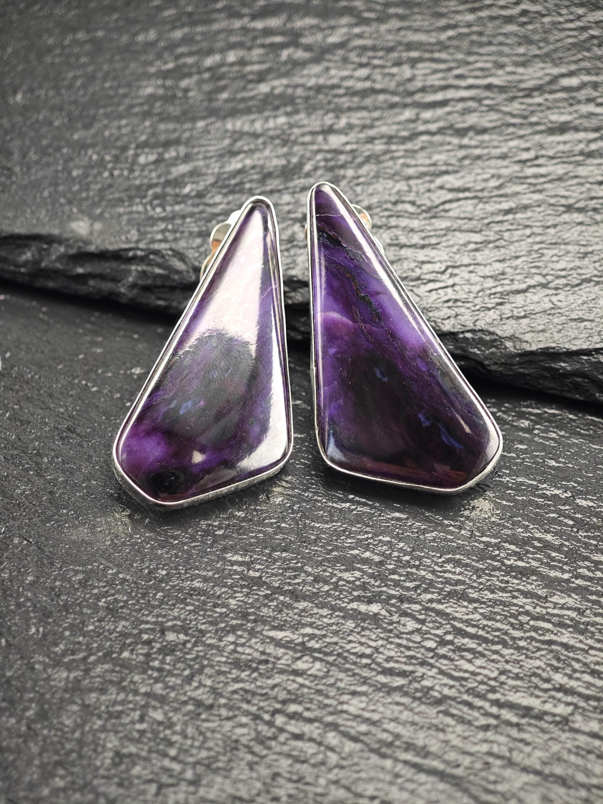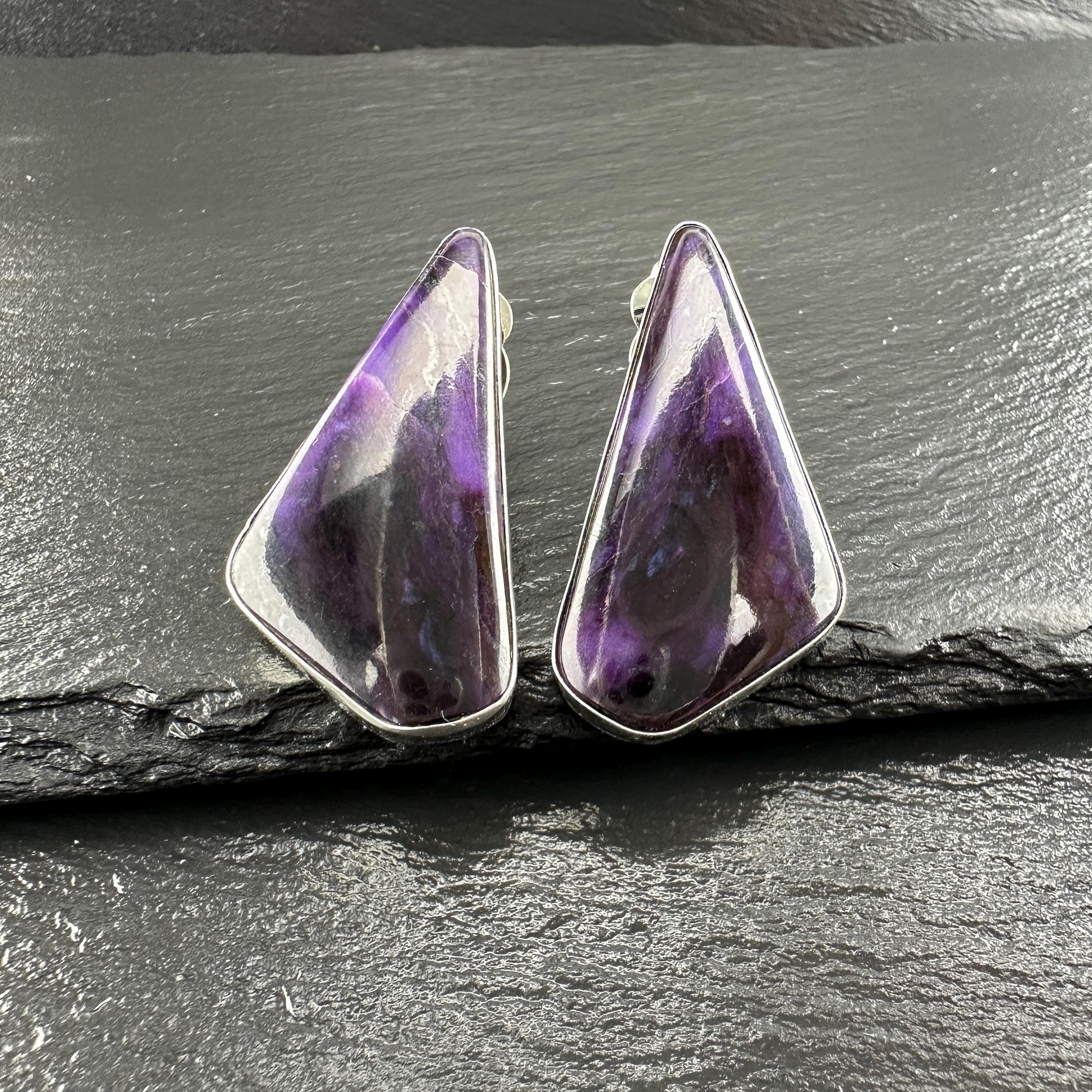 Vintage Purple Sugilite Sterling Silver Clip-On Earrings - Unique Abstract Design