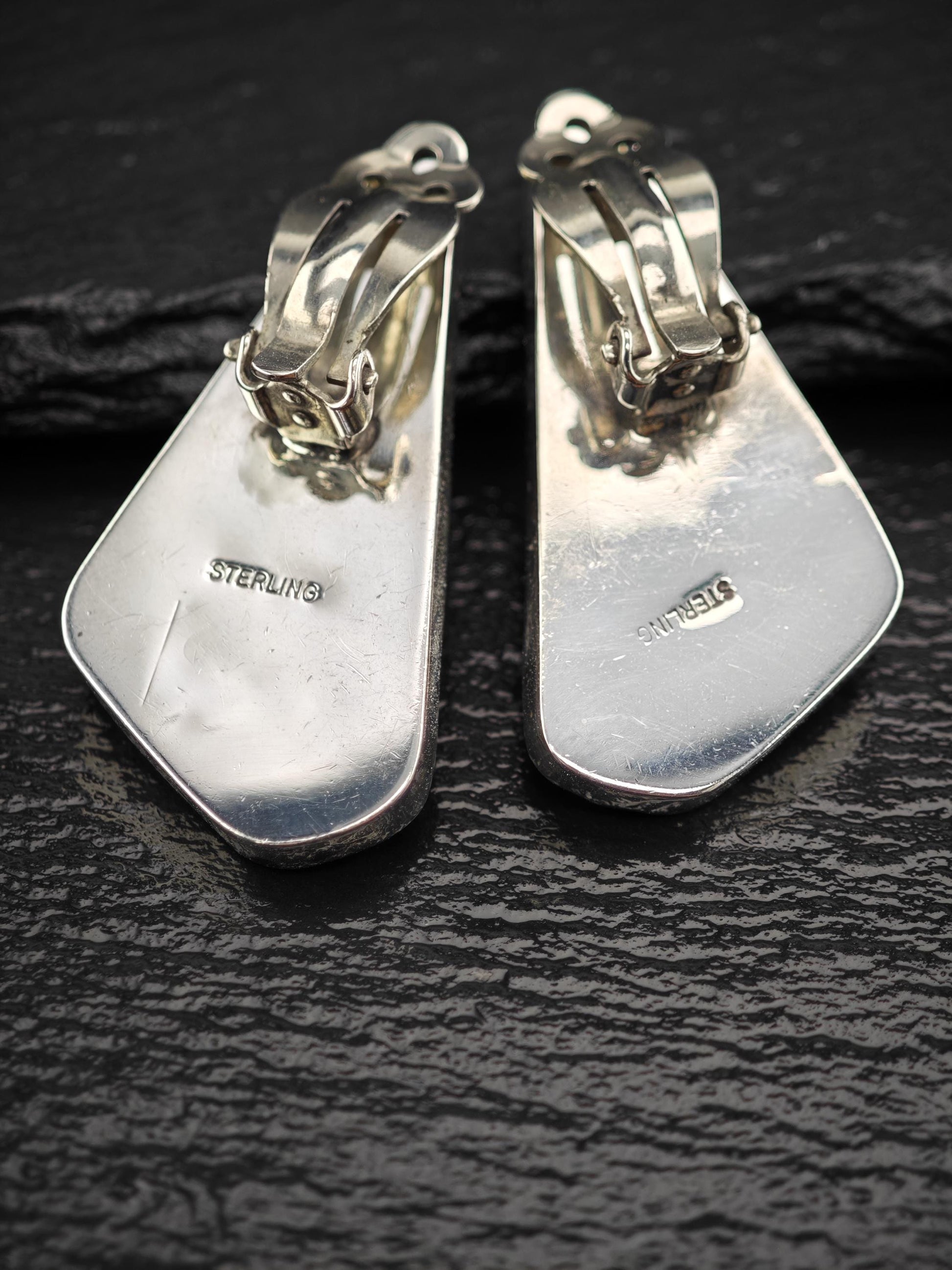 Discover these stunning vintage sterling silver clip-on earrings featuring a unique abstract design, perfect for adding a touch of elegance to any outfit. Measuring 1 3/4 inches in length and 7/8 inches in width, these earrings weigh 18.4 grams, making them a comfortable yet eye-catching accessory.