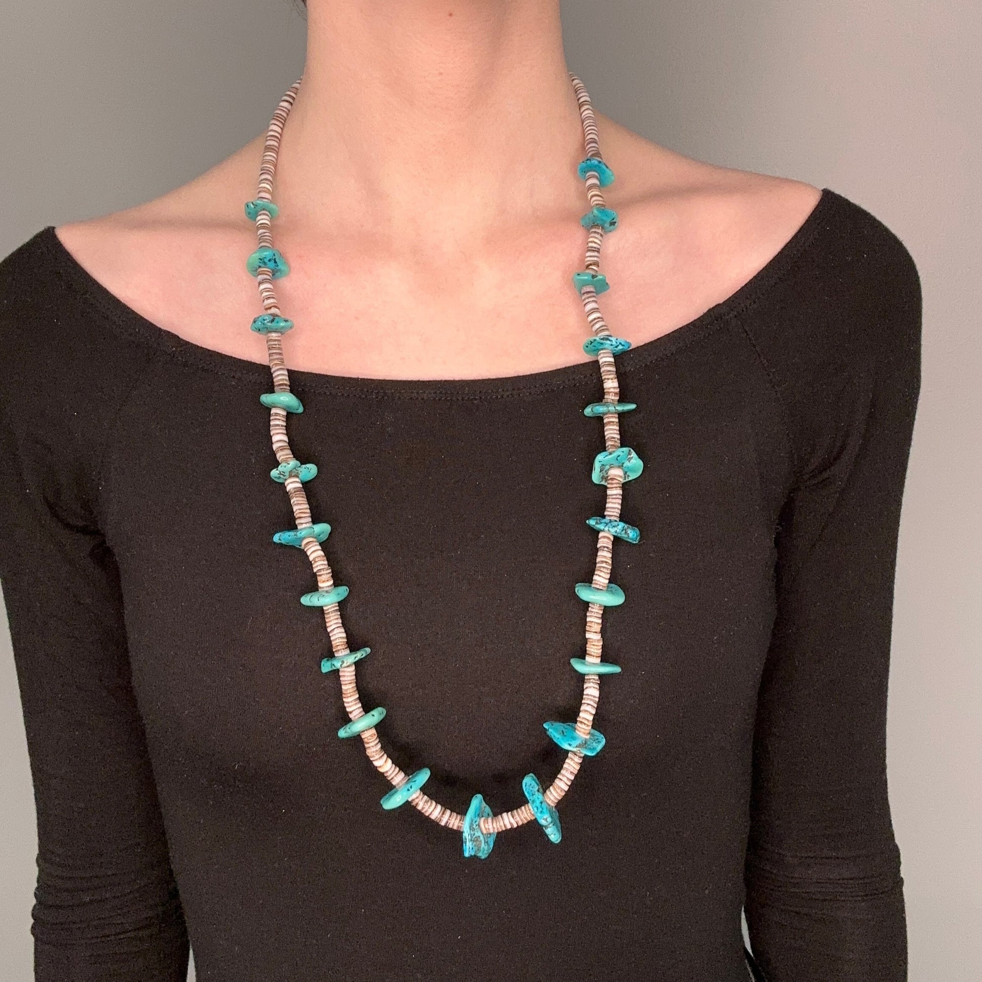 The stone/design of this necklace is Turquoise Shell, Heishi Natural, industry standard treatment if any