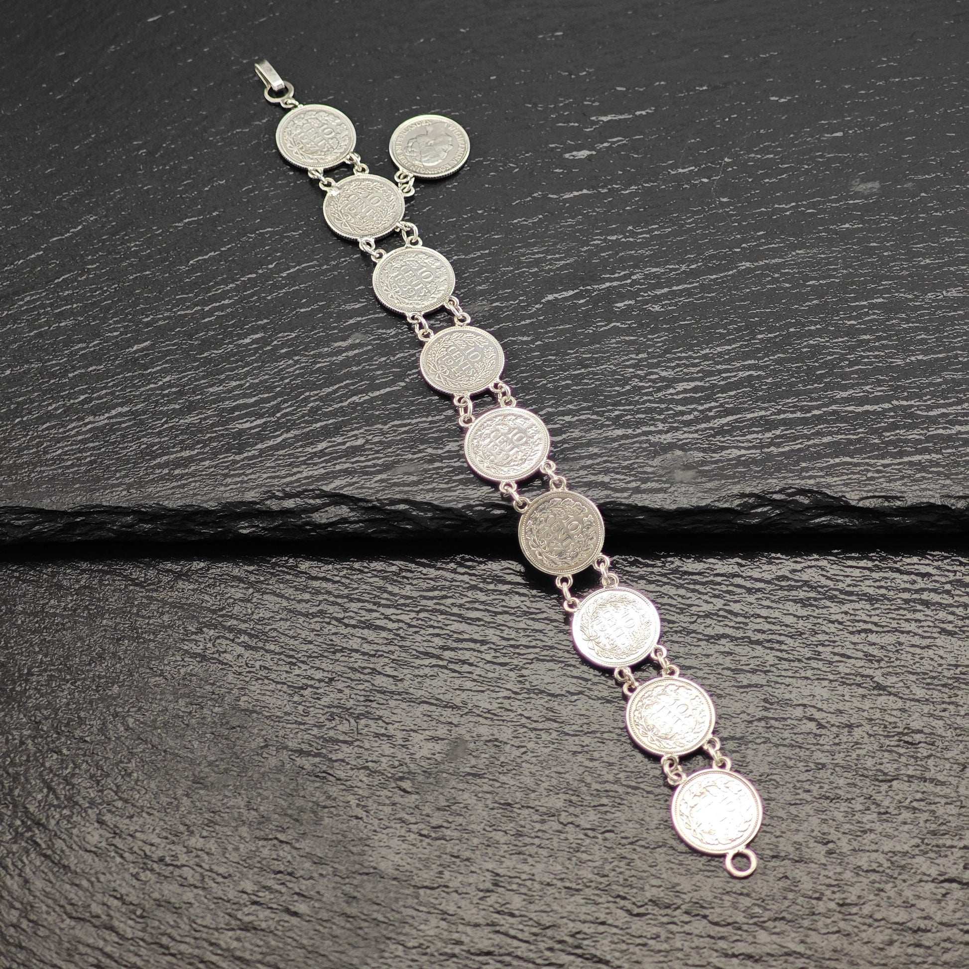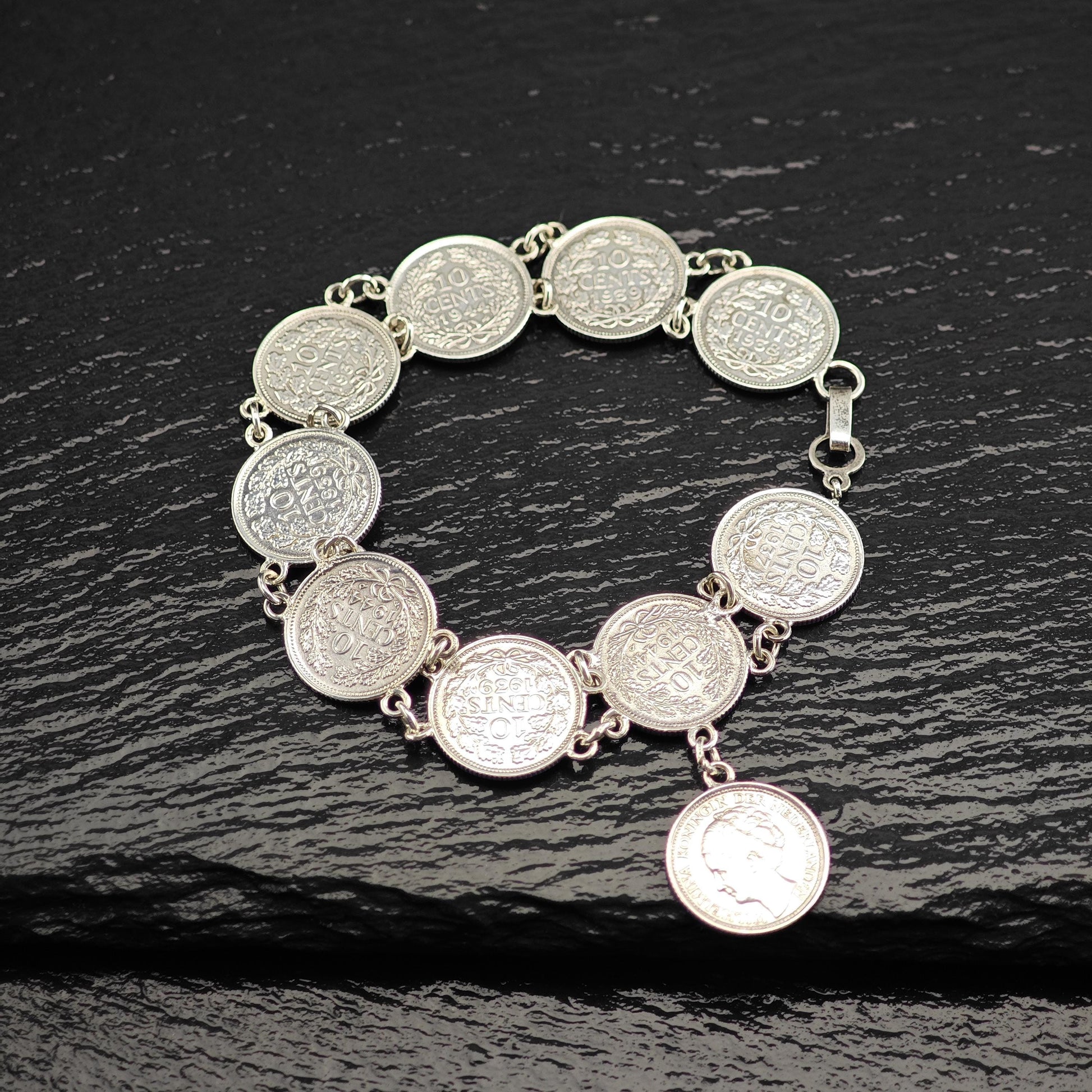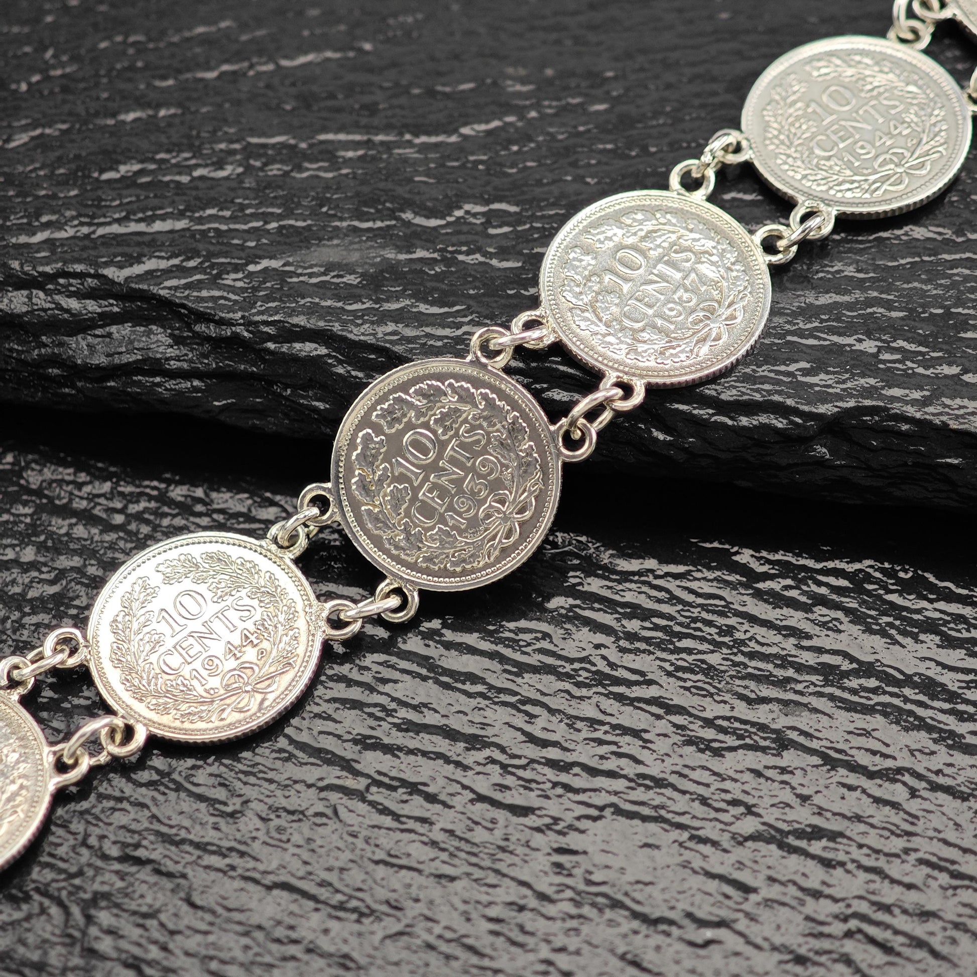 Discover the charm of our Vintage Silver Dime Bracelet, crafted from authentic Canadian coins minted before 1944. This unique piece features a selection of dimes stamped with the years 1944, 1937, 1939, and 1938, showcasing the likeness of Wilhelmina, Koningin der Nederlanden.