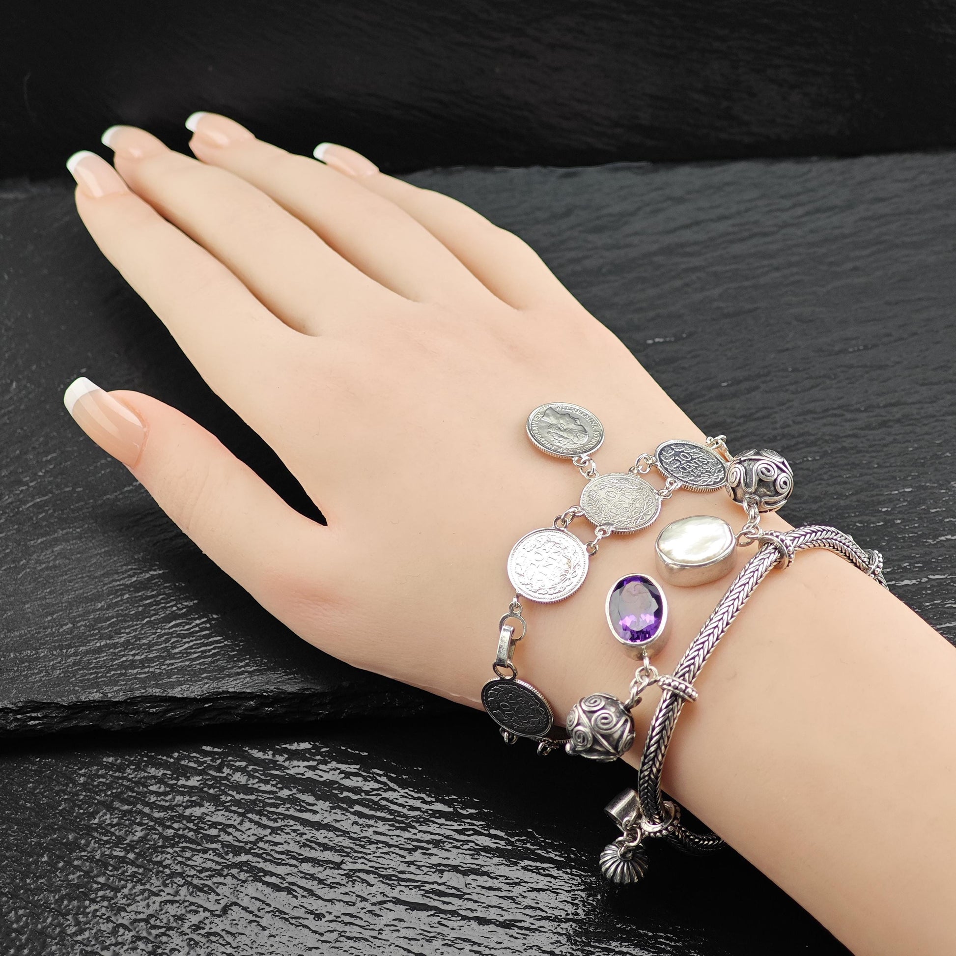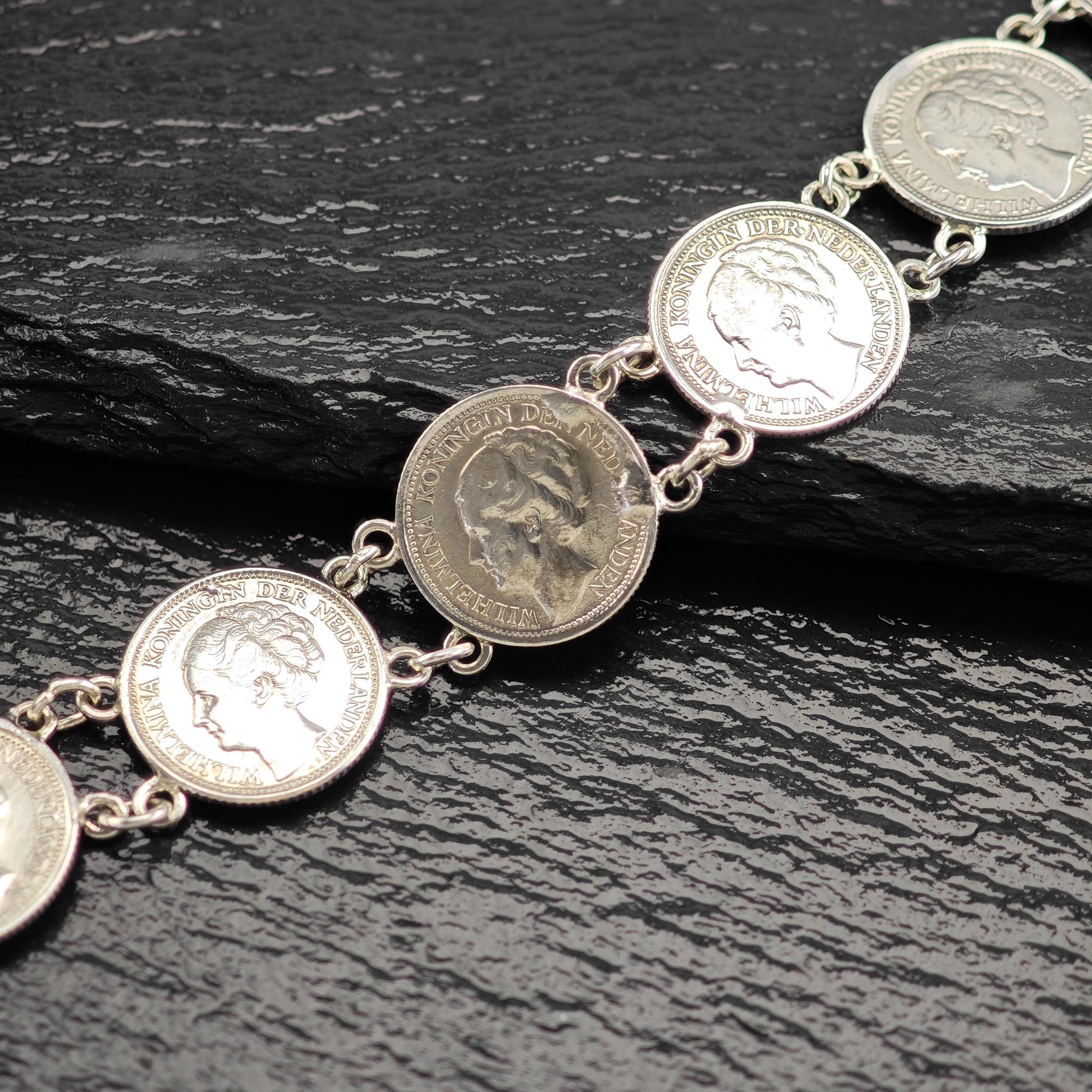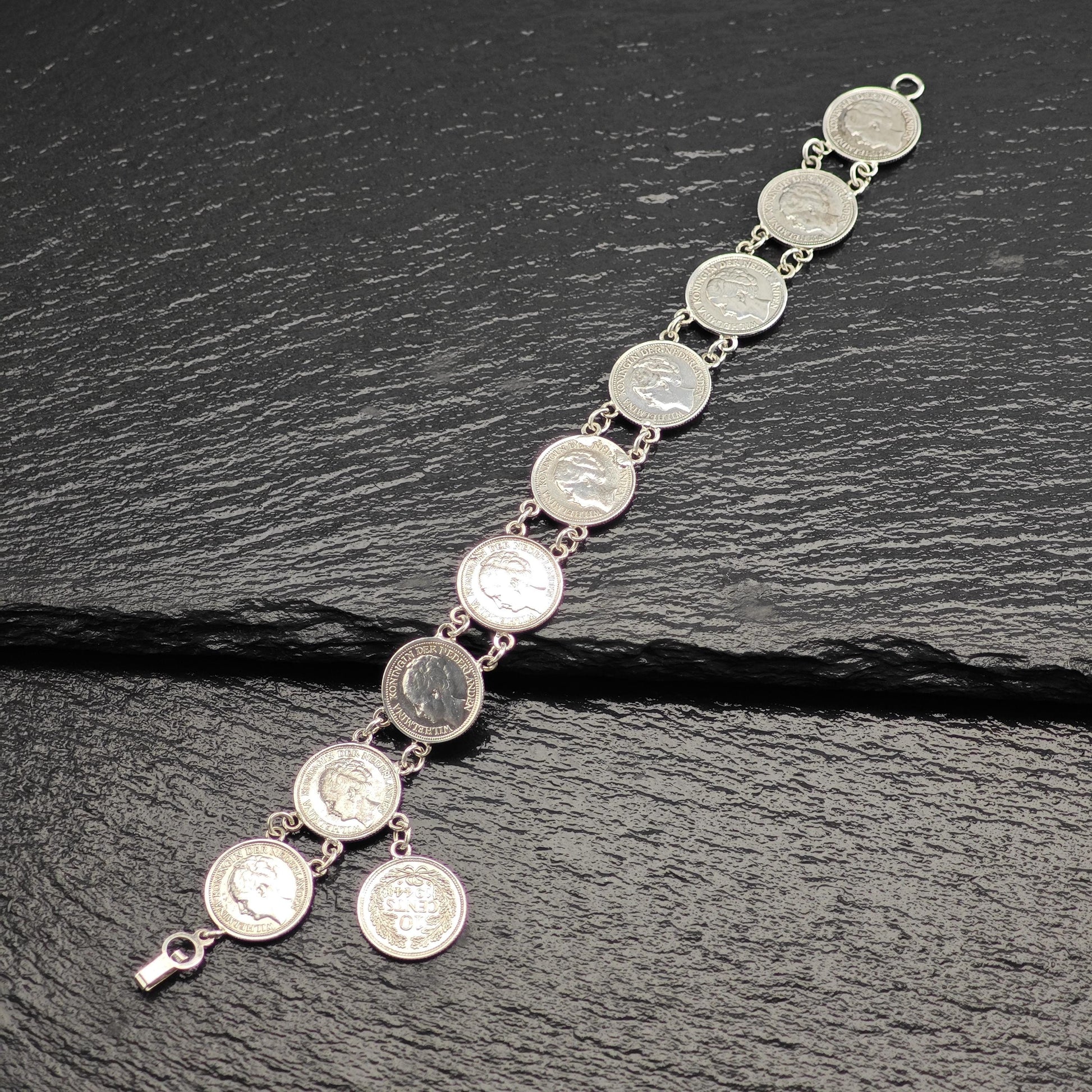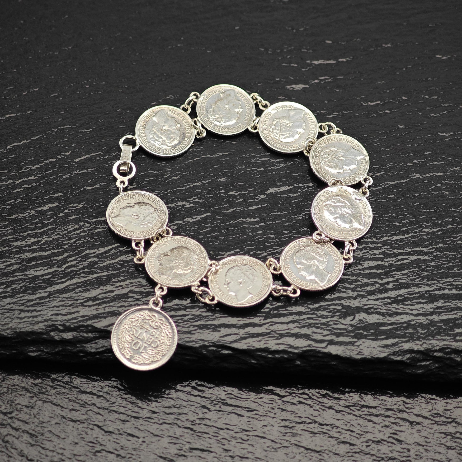 Discover the charm of our Vintage Silver Dime Bracelet, crafted from authentic Canadian coins minted before 1944. This unique piece features a selection of dimes stamped with the years 1944, 1937, 1939, and 1938, showcasing the likeness of Wilhelmina, Koningin der Nederlanden.