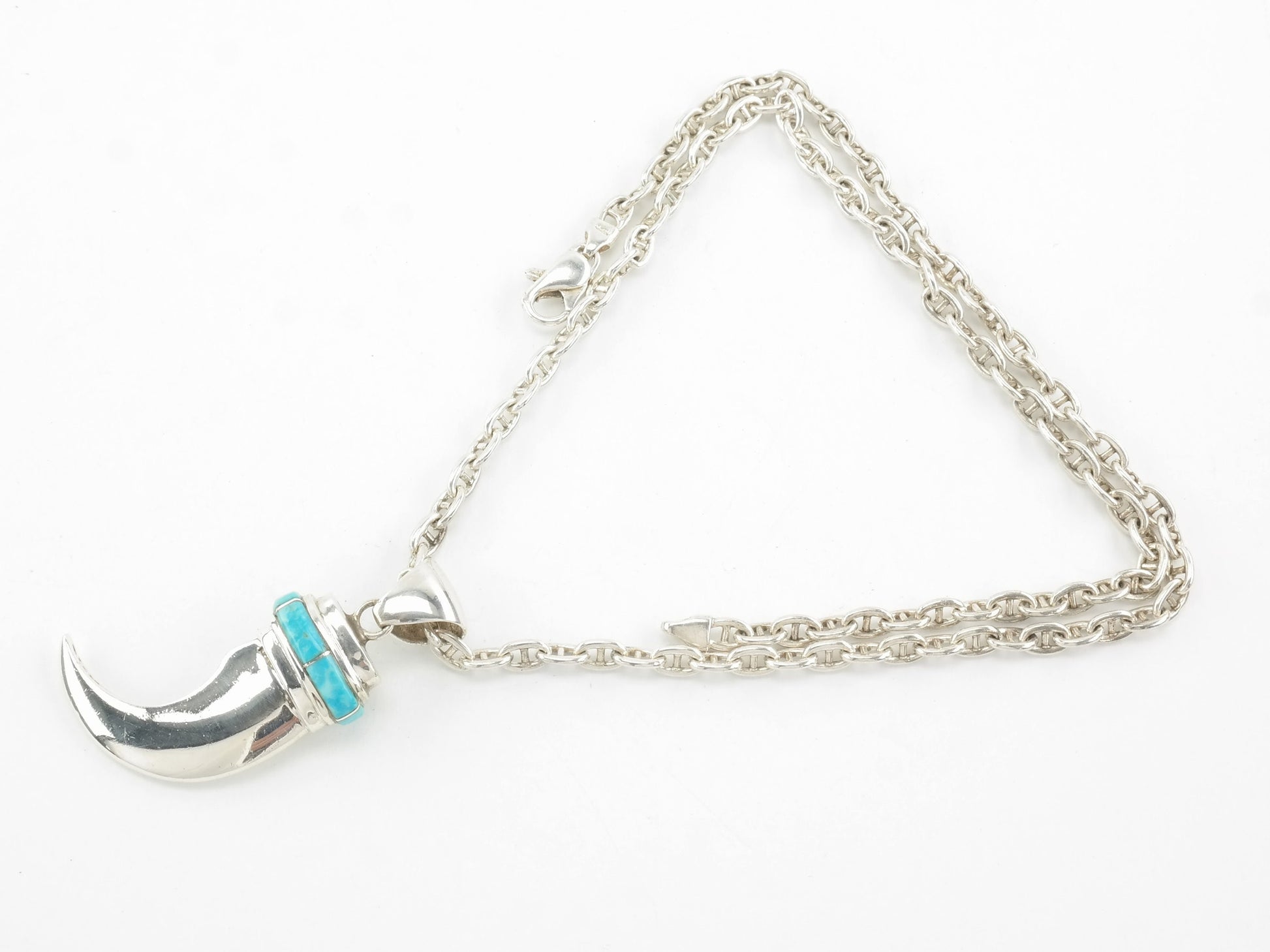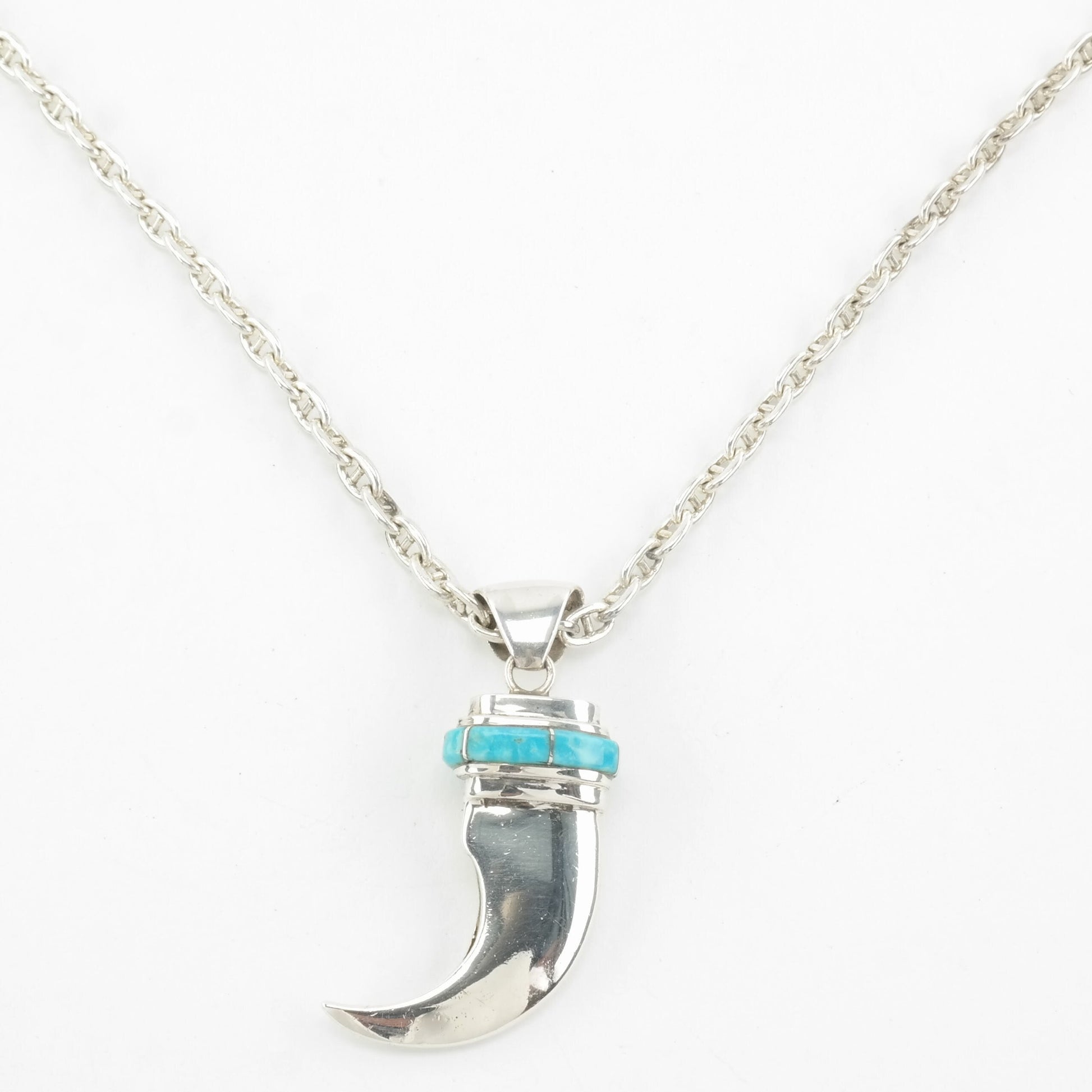 This captivating necklace evokes the spirit of the Southwest with its striking silver claw pendant. Crafted from sterling silver, the pendant features a vibrant blue turquoise inlay, adding a pop of color to this dramatic piece. The necklace measures 20 1/4 inches in length and is secured with a sturdy sterling silver chain.