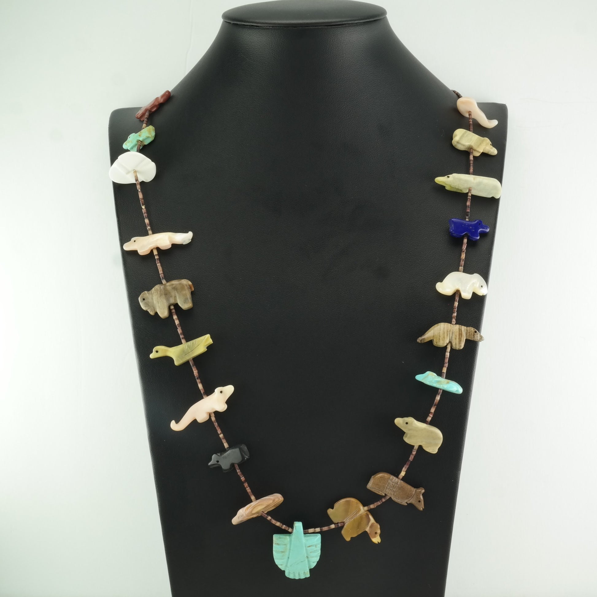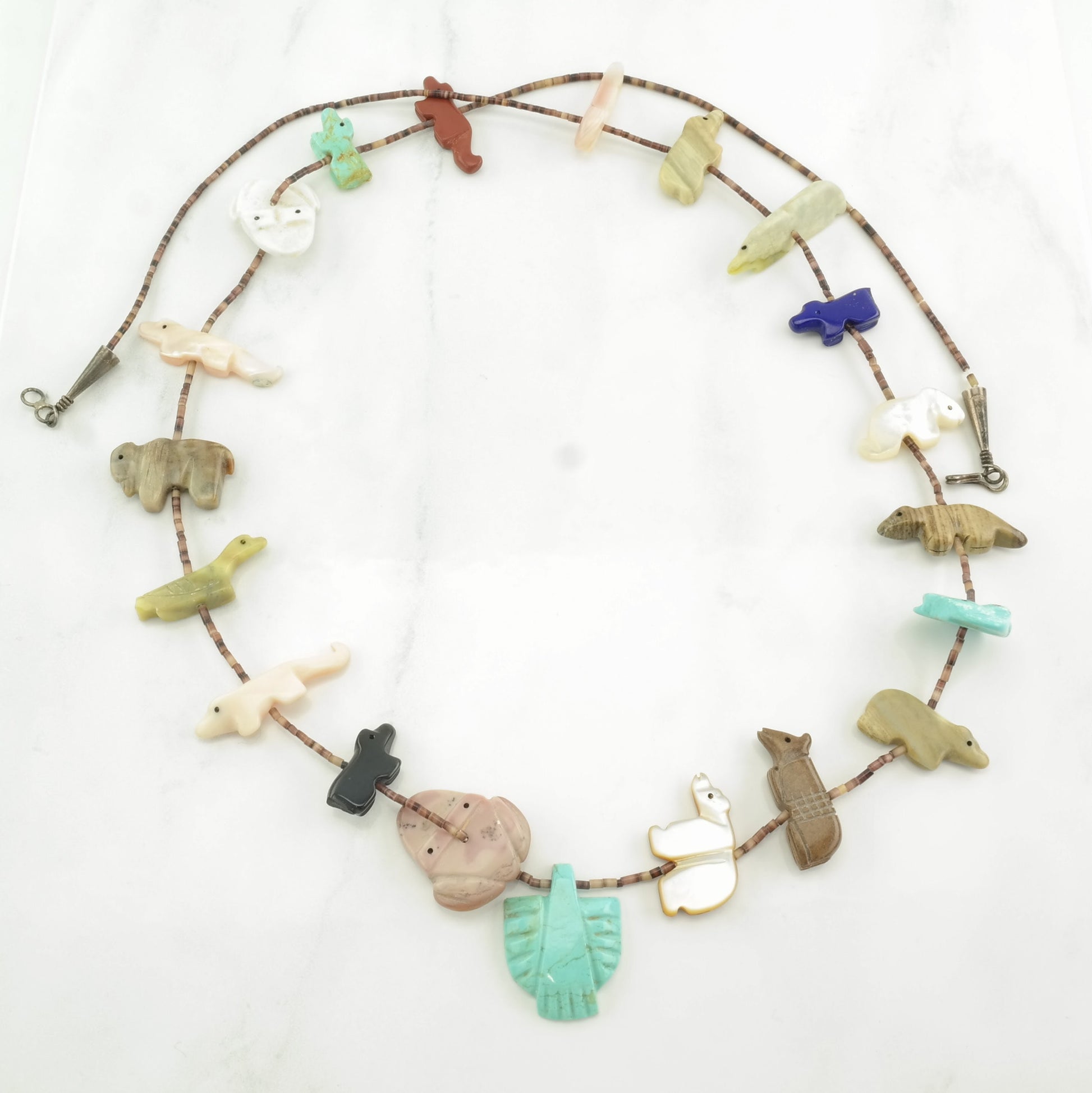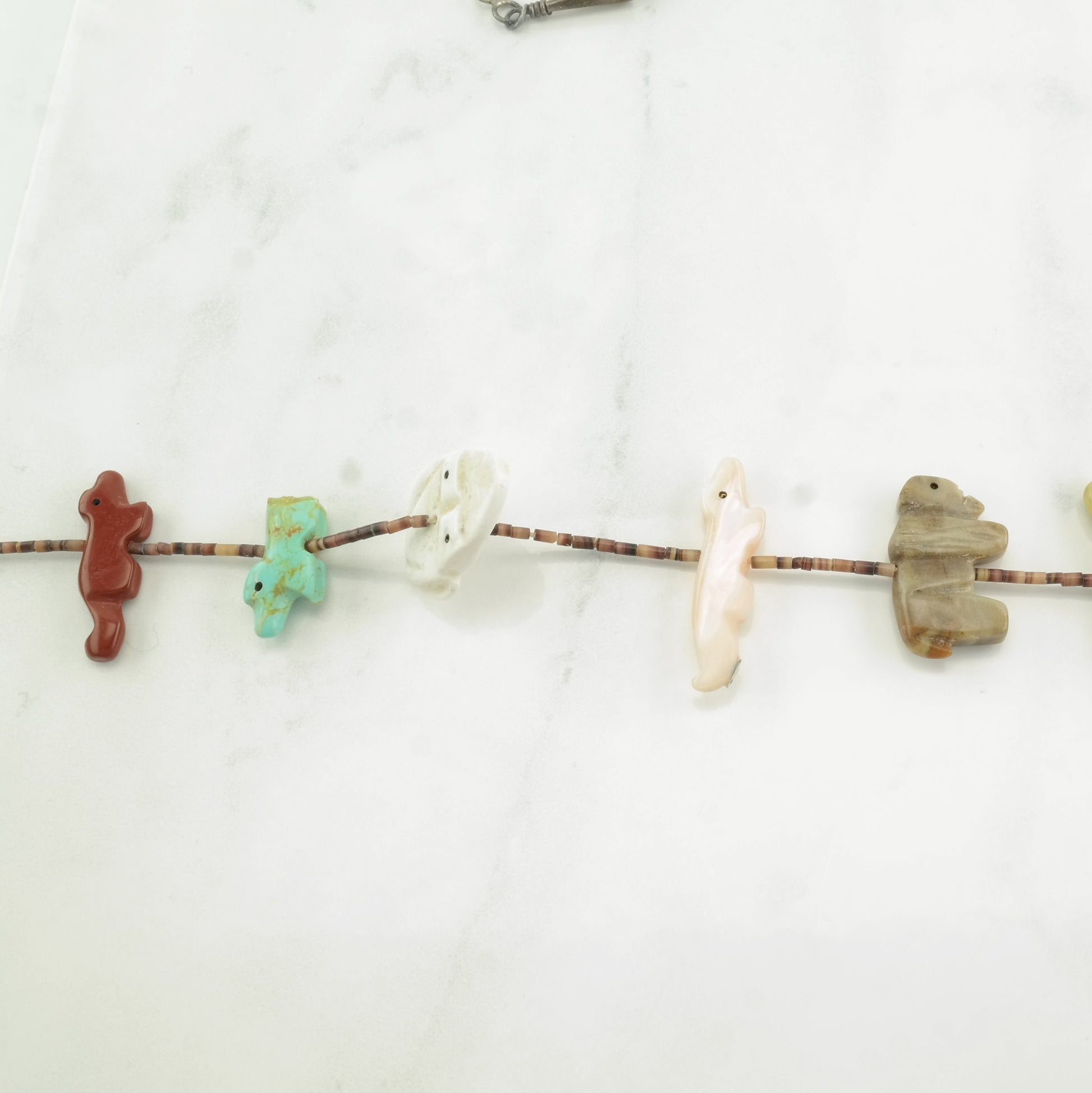 Vintage Southwest Sterling Silver Turquoise, MOP, Lapis Lazuli Animal, Heishi Necklace