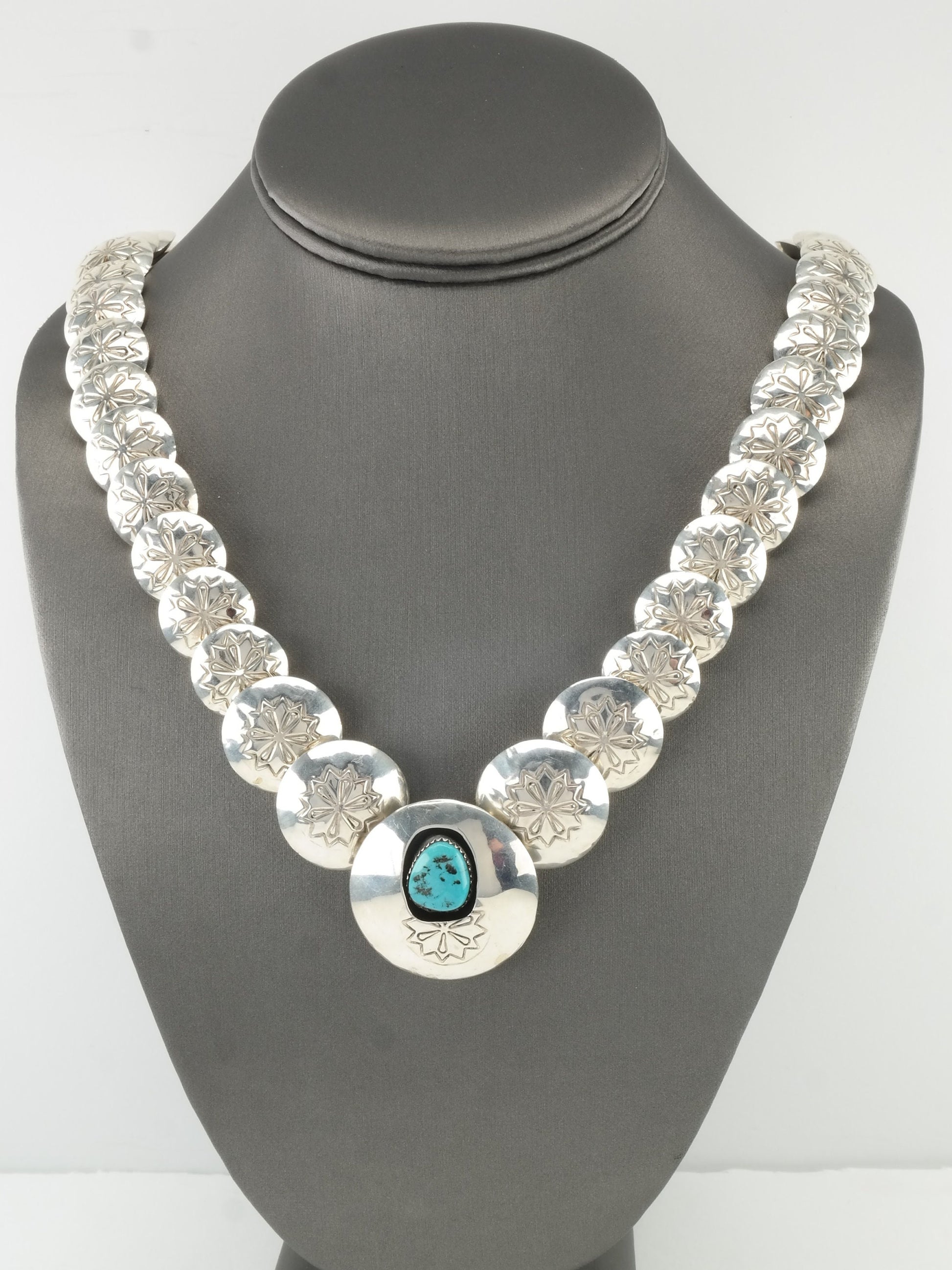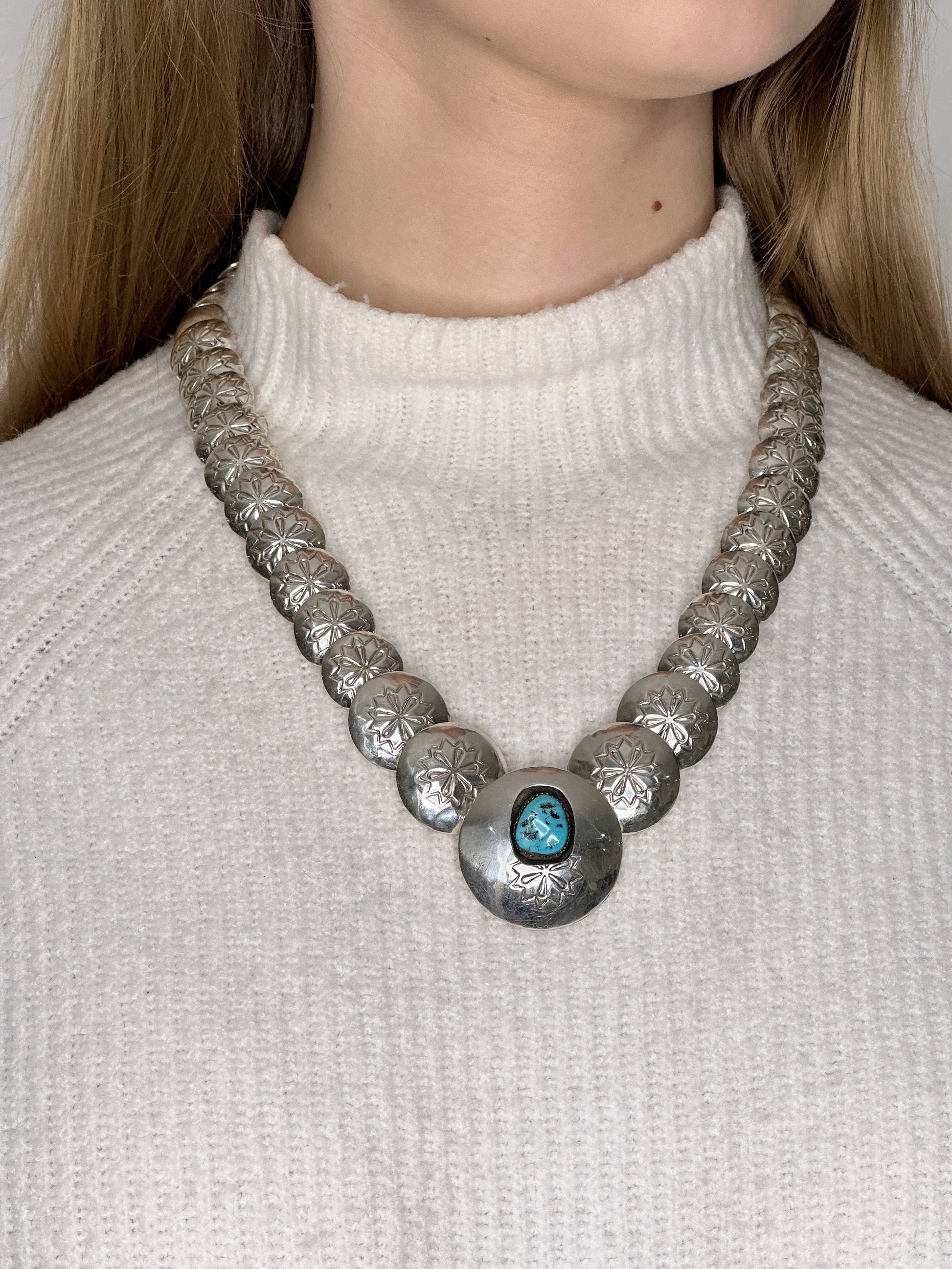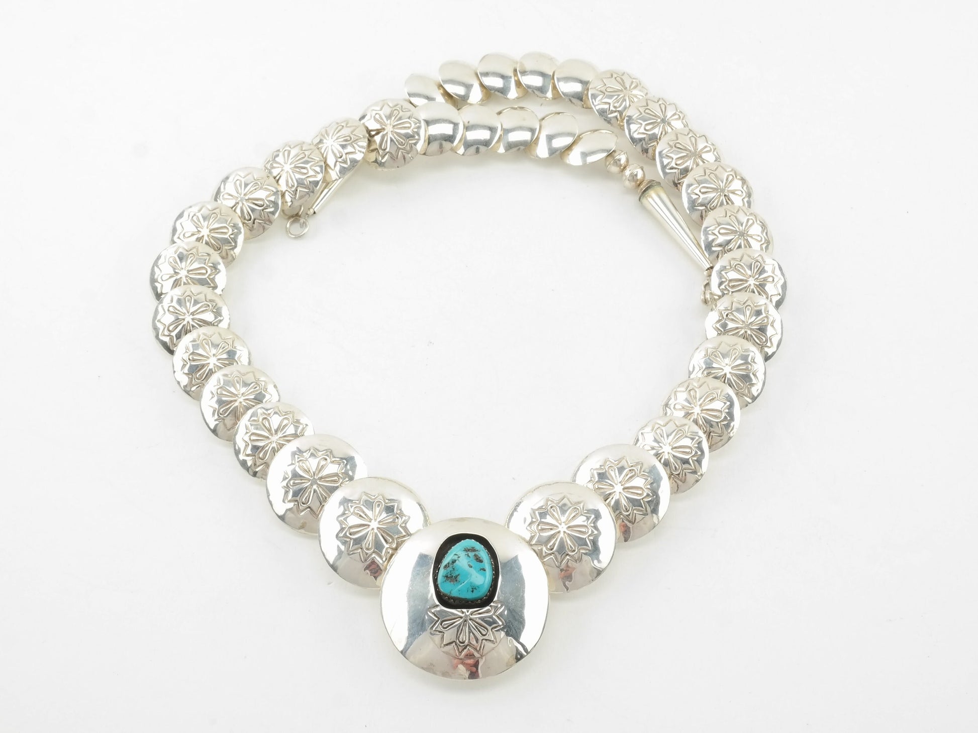 Celebrate the Southwest with our Vintage Sterling Silver Blue Turquoise, Disc Reversible Necklace.