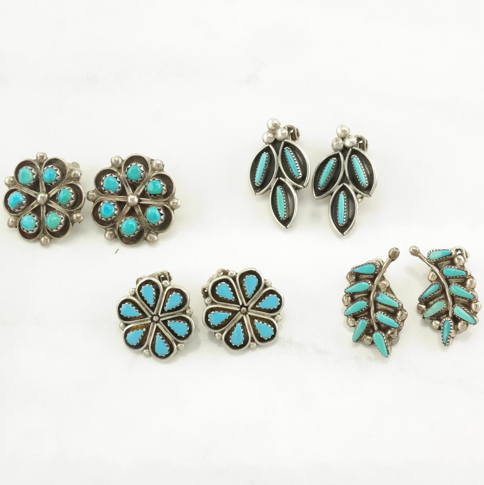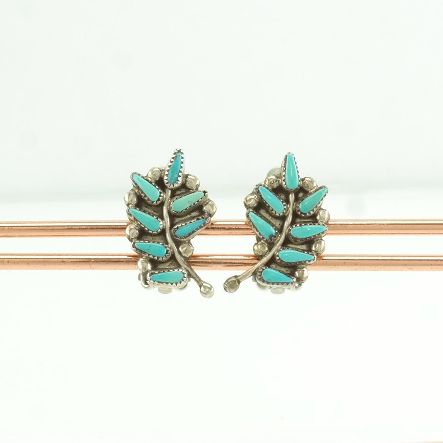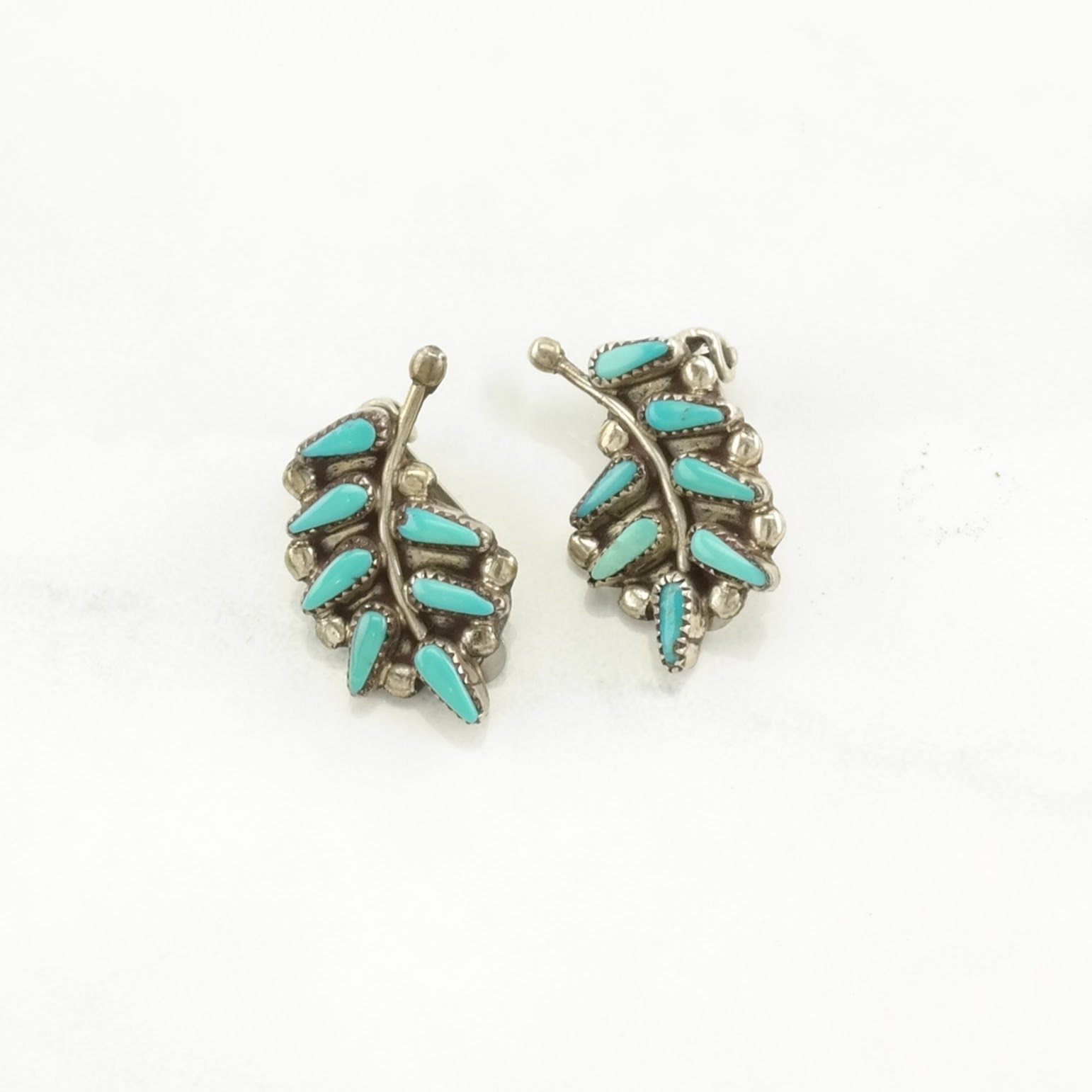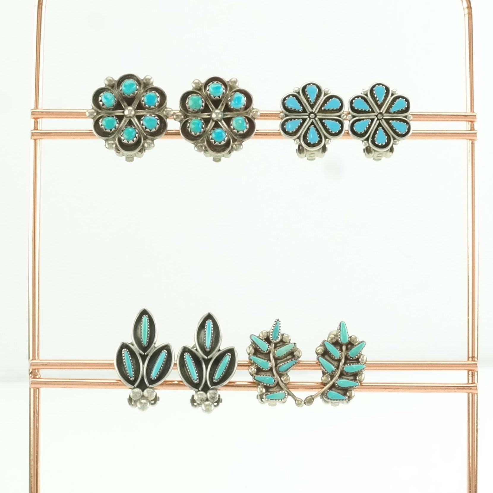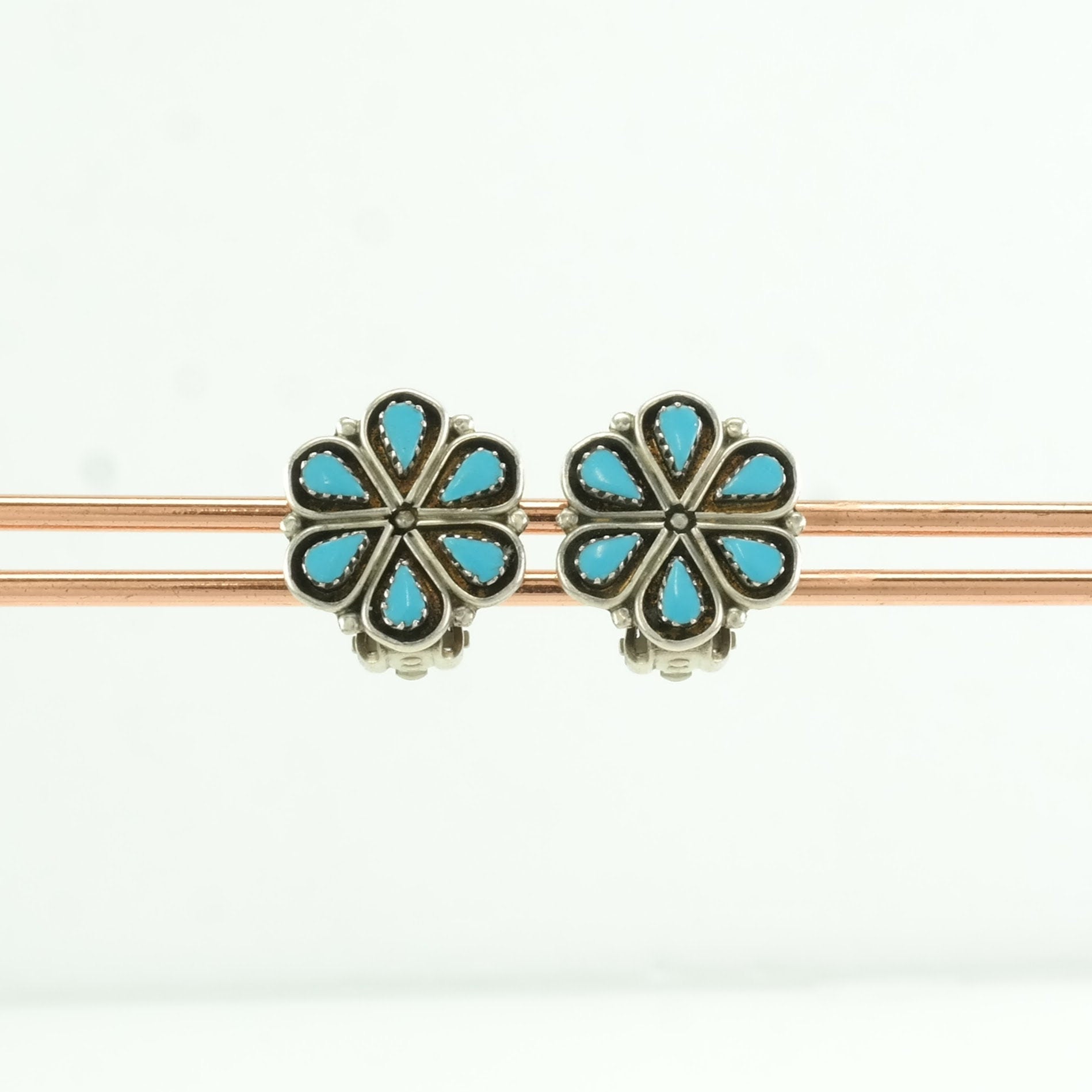 Vintage Sterling Silver Clip on Earrings Native American Blue Turquoise Needle Point, Floral