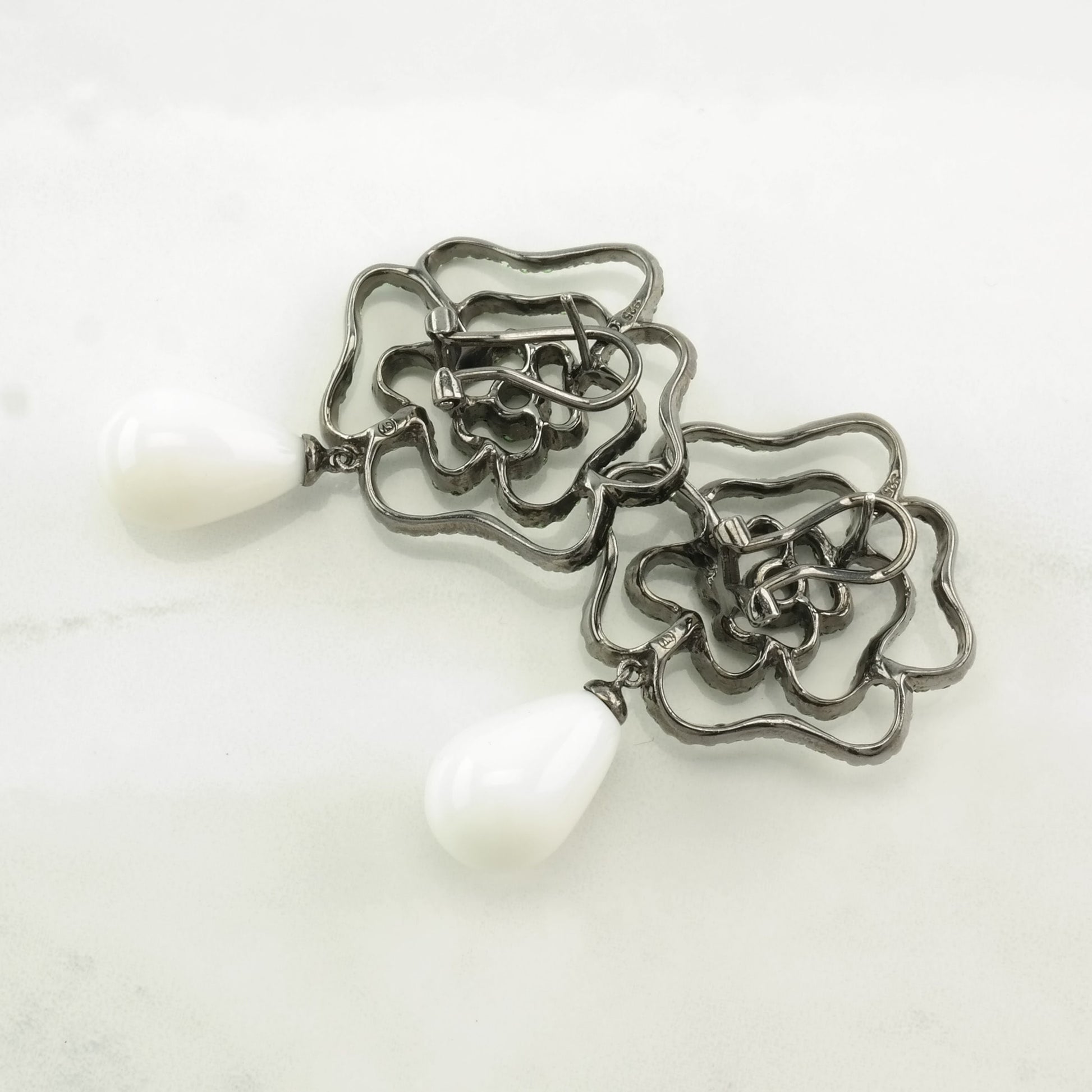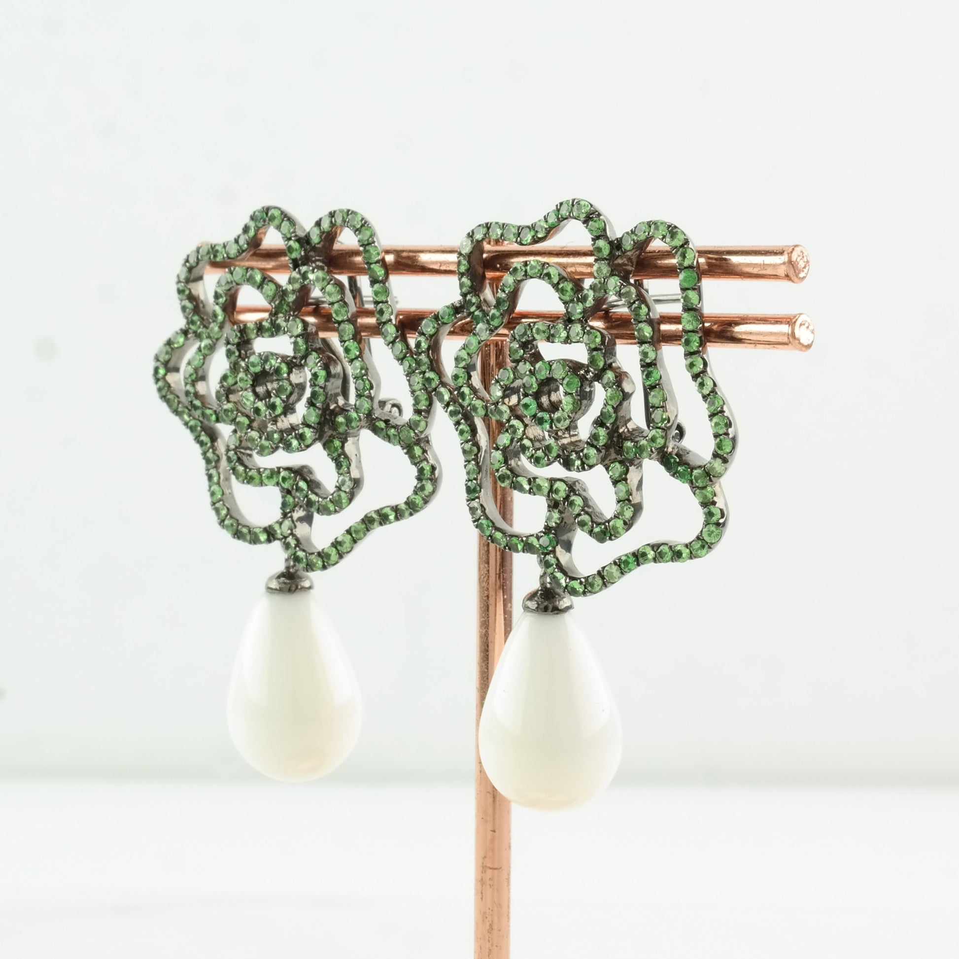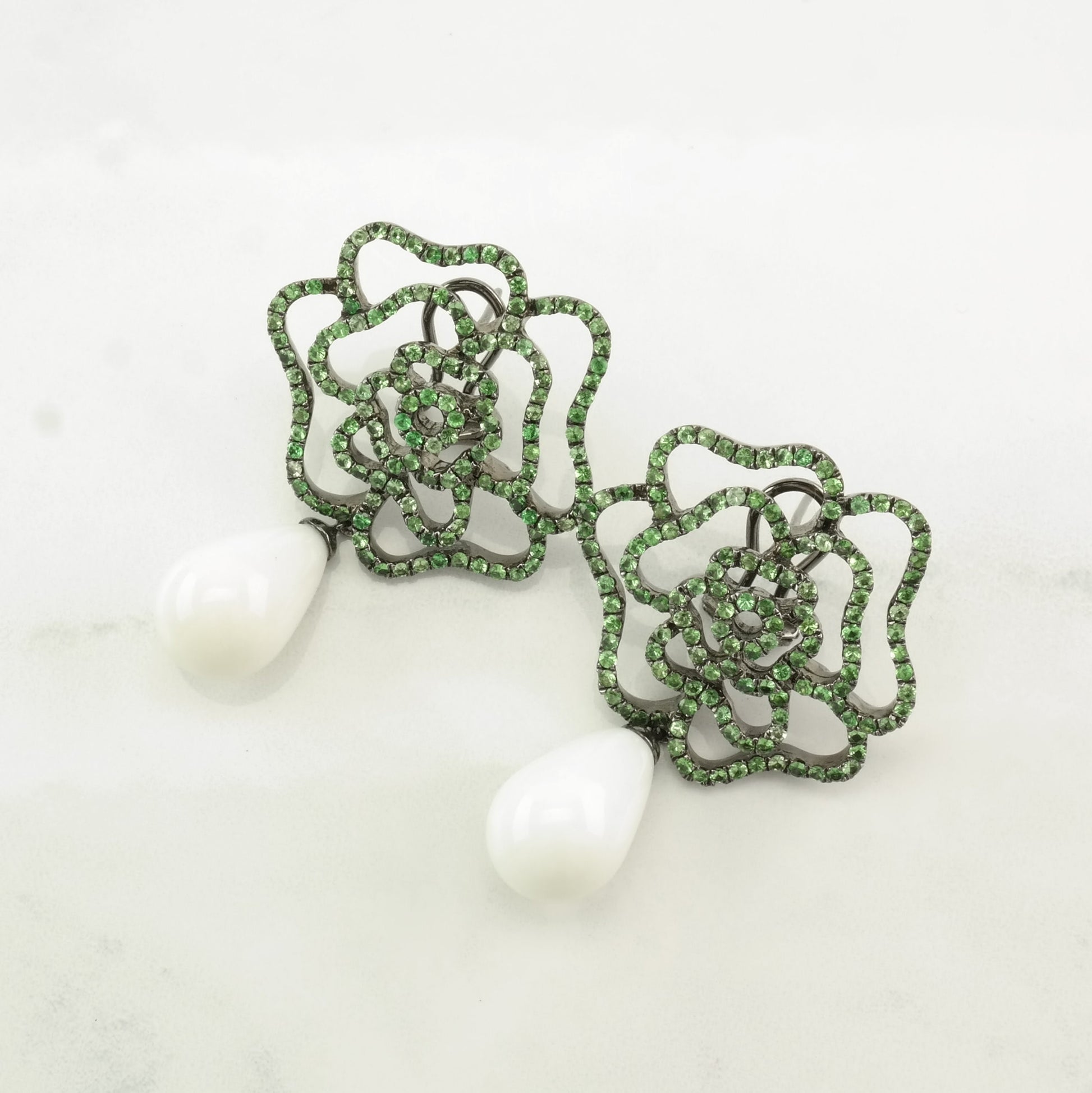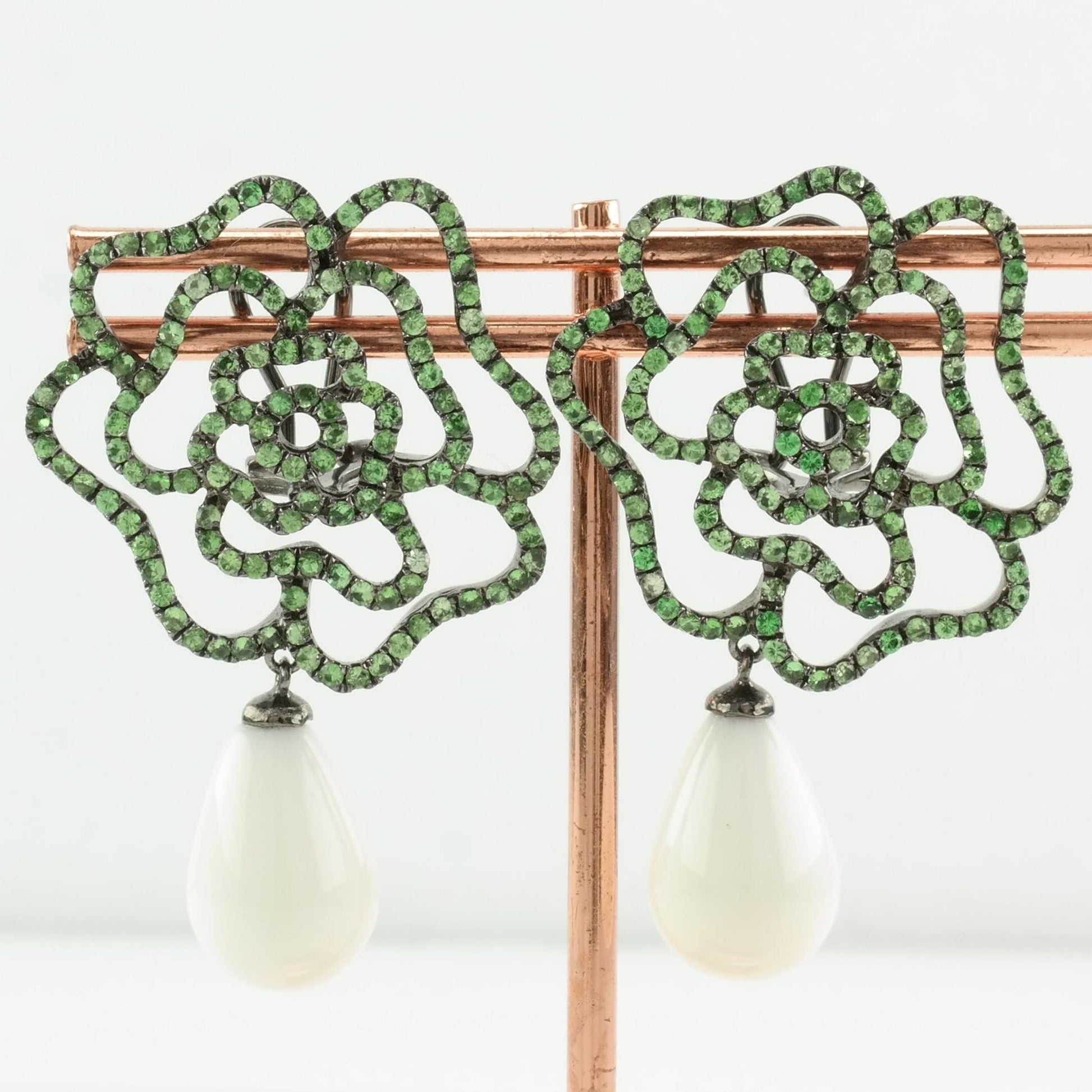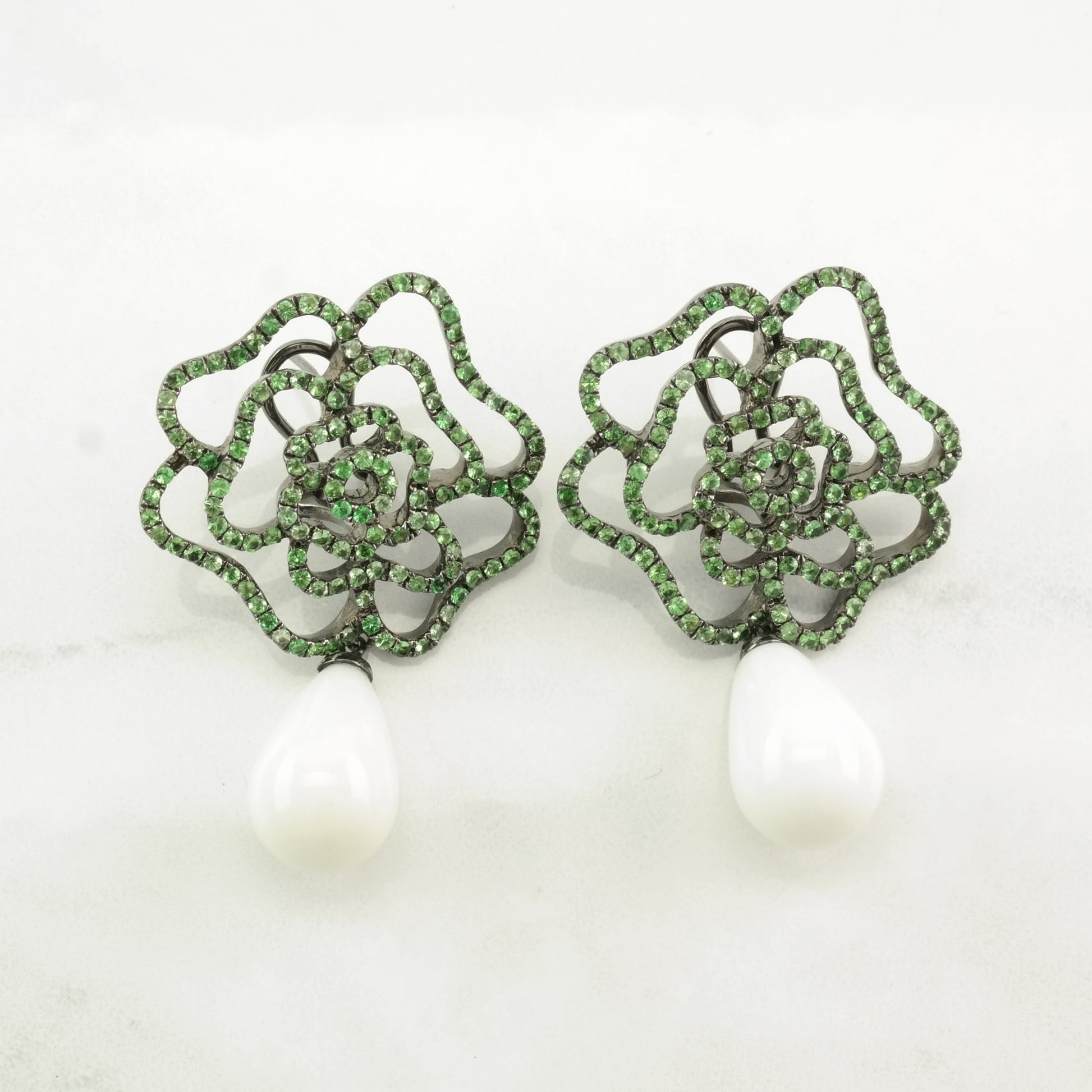 These elegant vintage earrings feature a unique floral design crafted from sterling silver with an oxidized finish. Each earring showcases a delicate openwork flower adorned with sparkling green tsavorites and a dangling white stone, creating a captivating contrast.