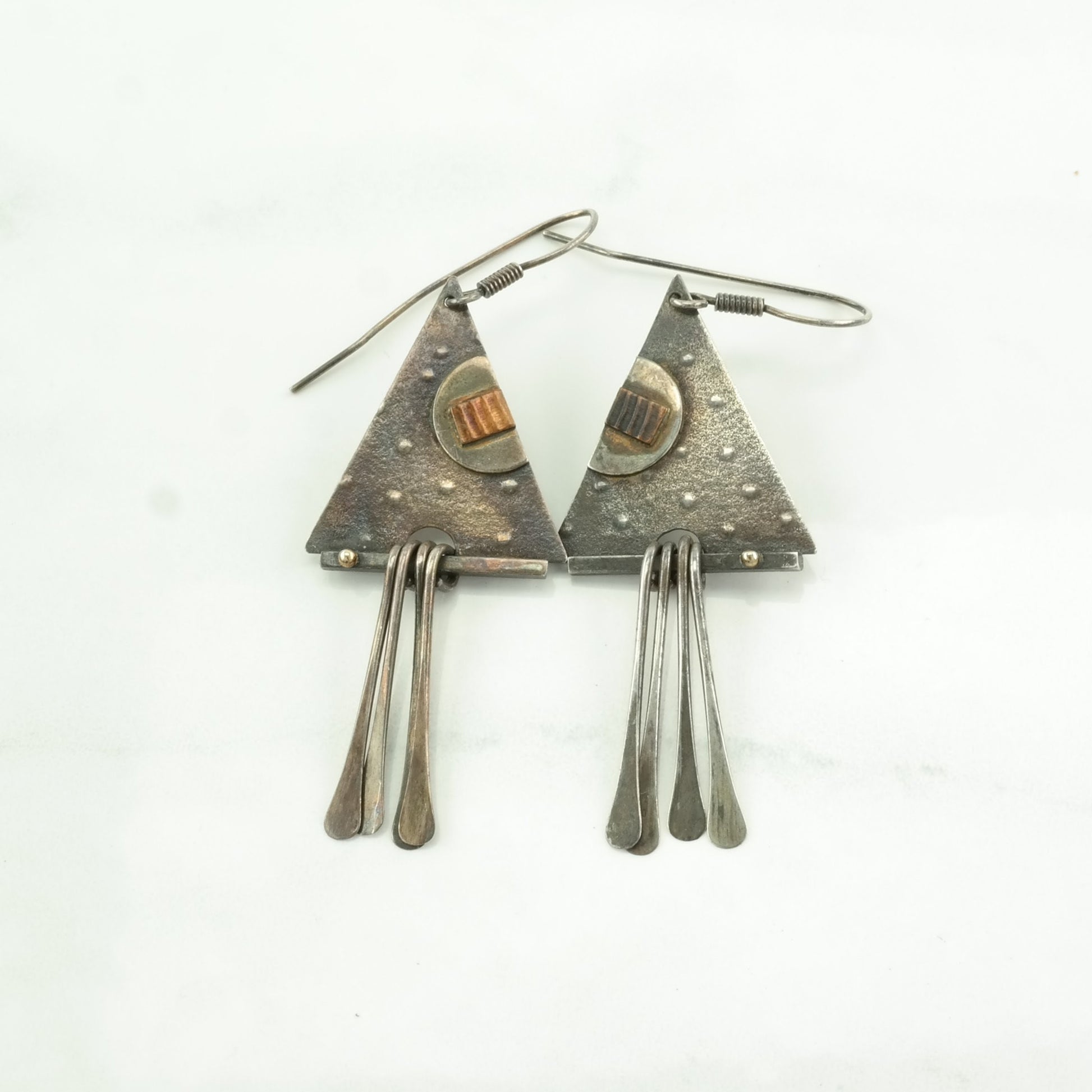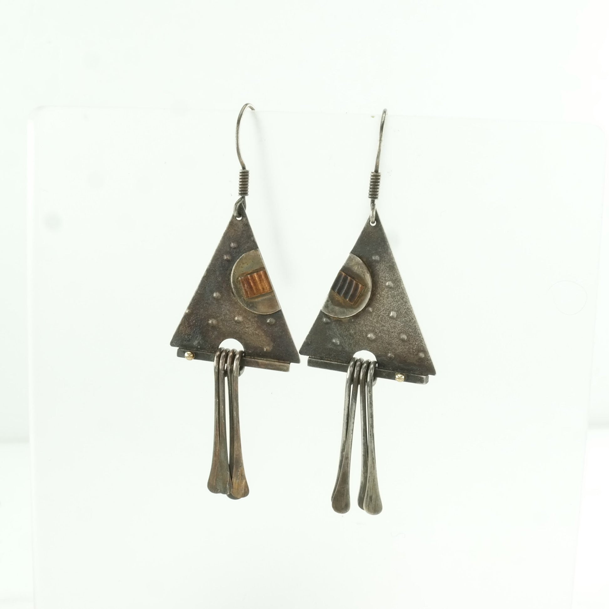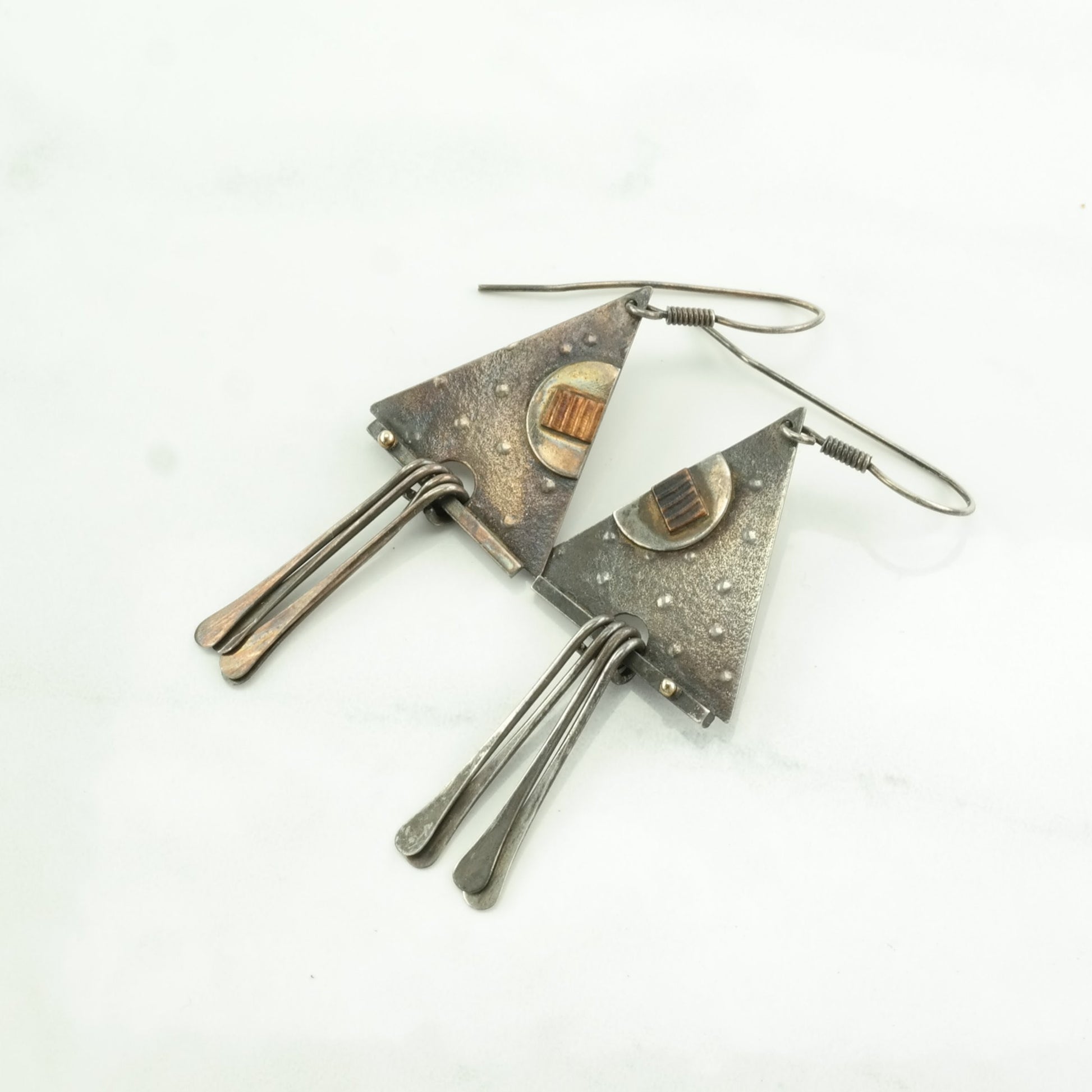 Vintage Sterling Silver Fish Hook/Dangle Earrings MCM, Modernist Abstract Triangular, Copper Inlay