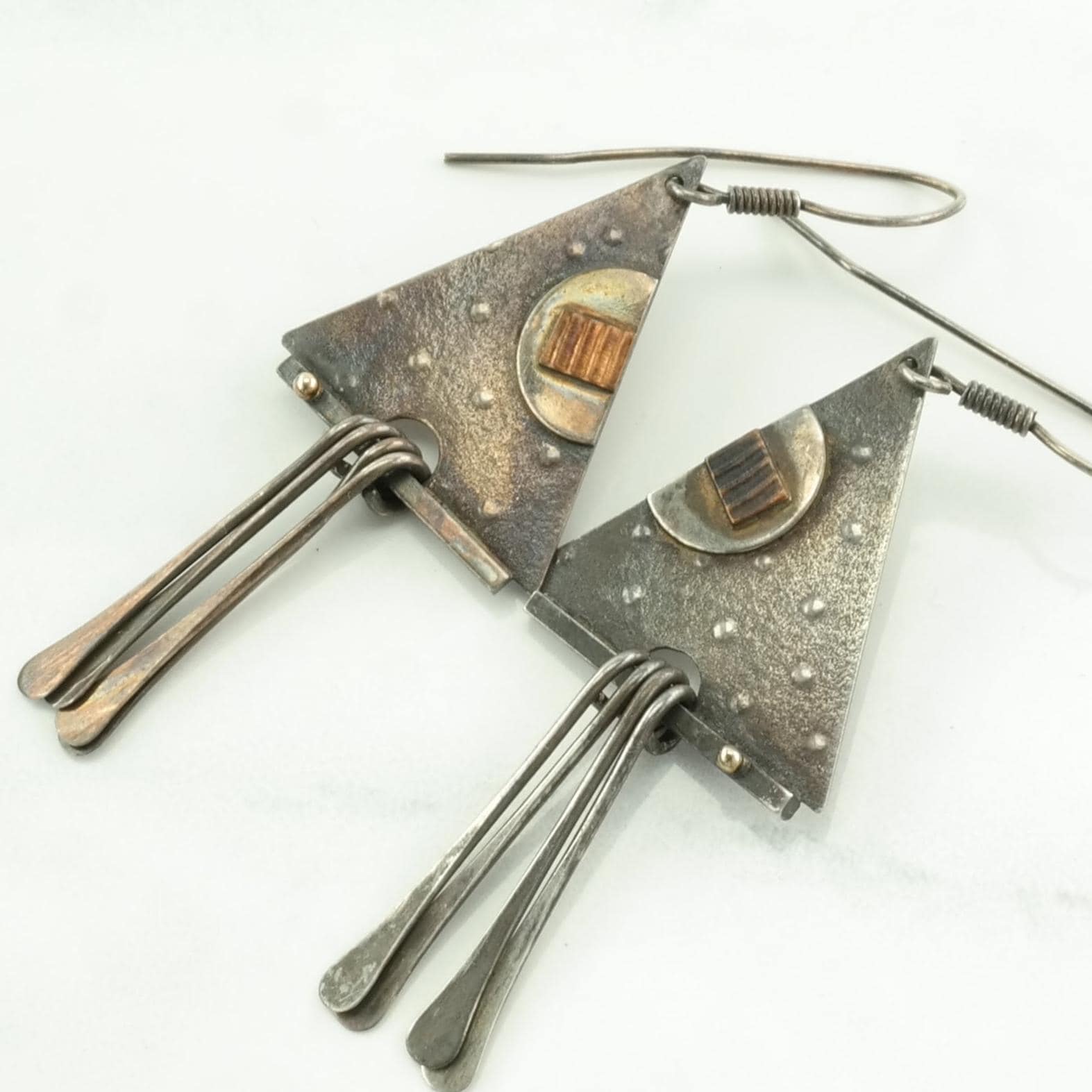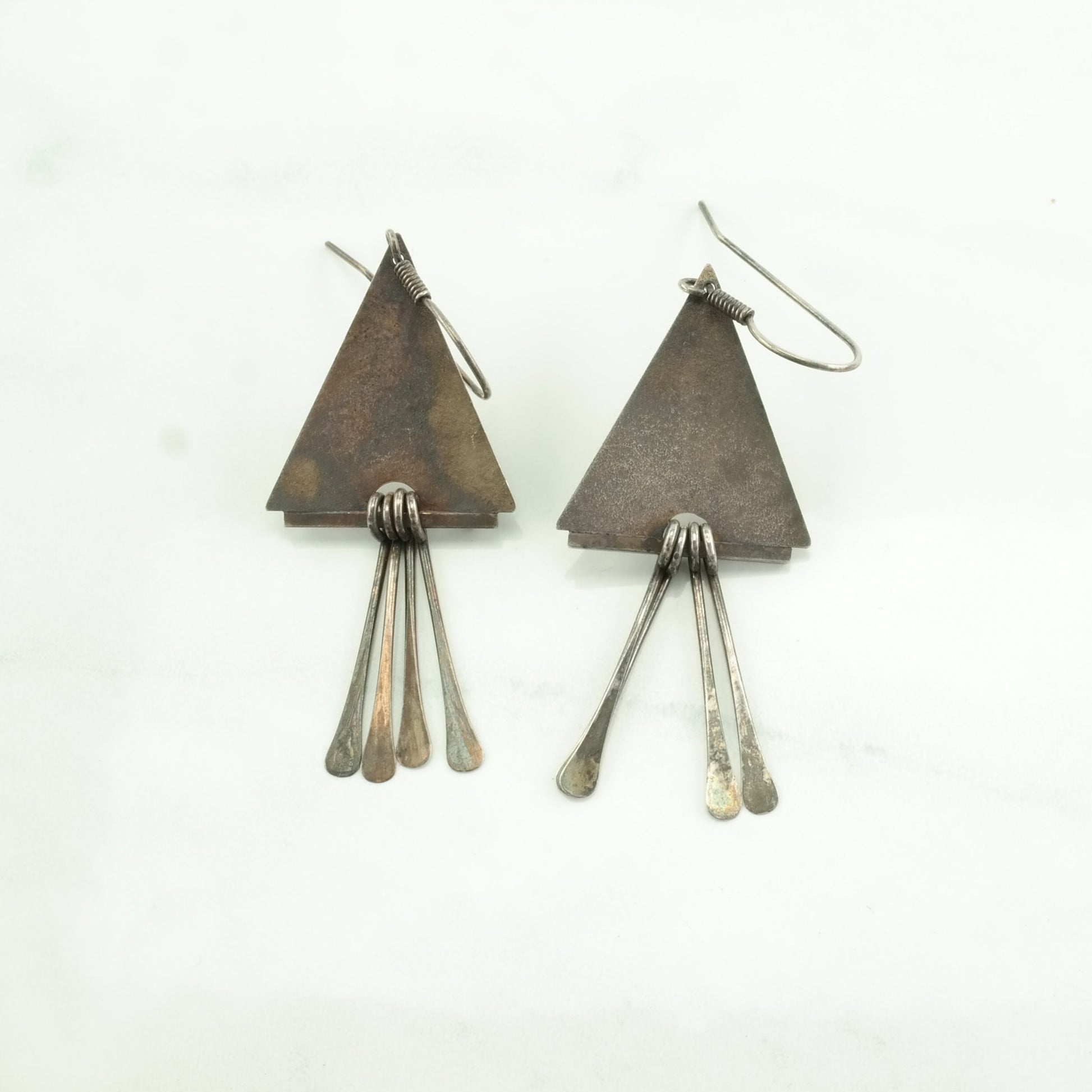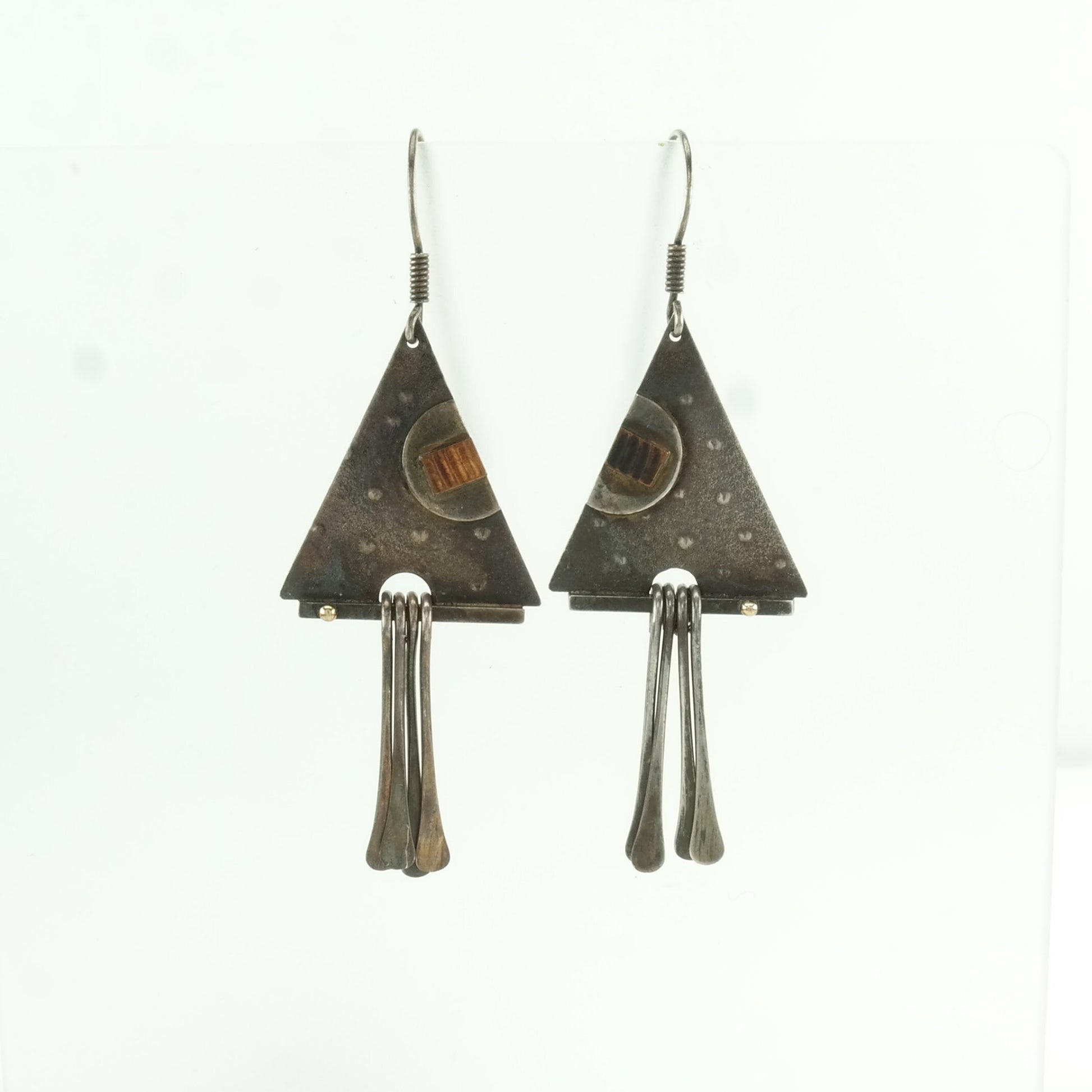 Vintage Sterling Silver Fish Hook/Dangle Earrings MCM, Modernist Abstract Triangular, Copper Inlay