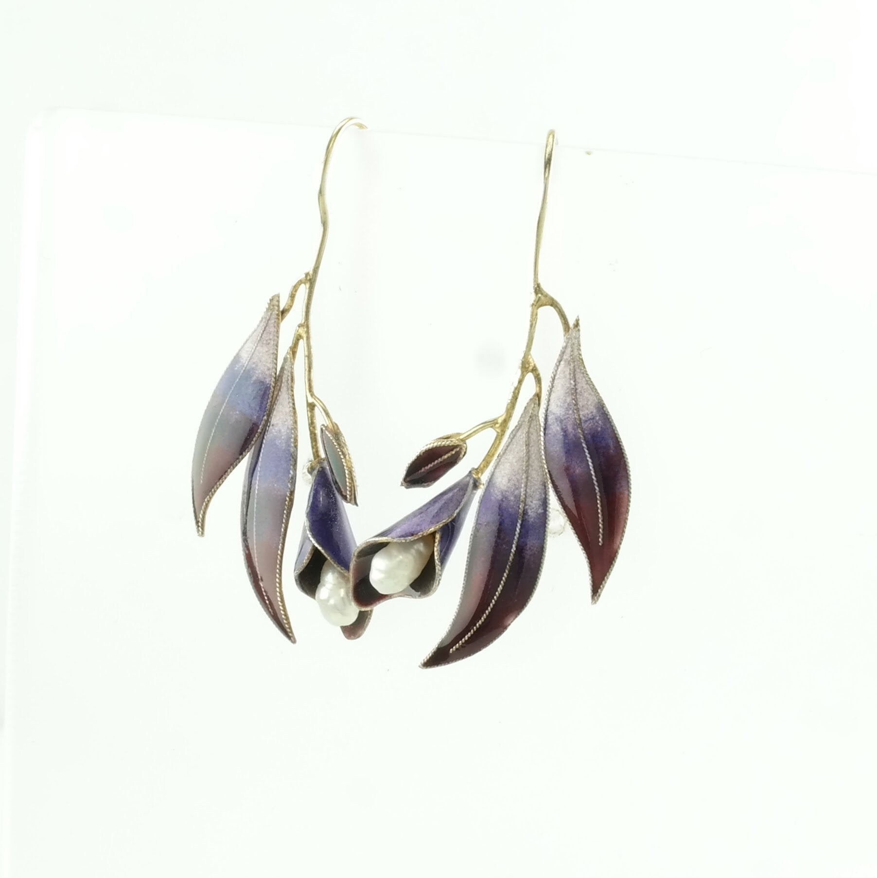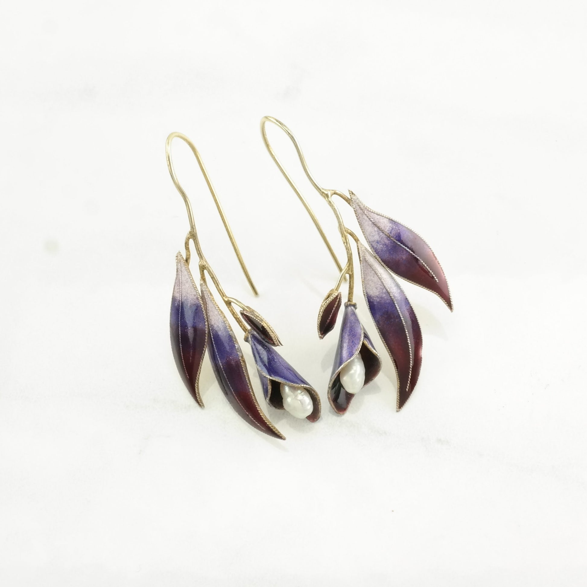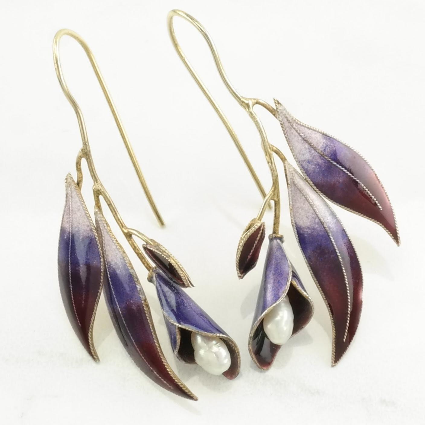 Vintage Sterling Silver Fish hook Earrings Purple Enamel, Pearl Floral