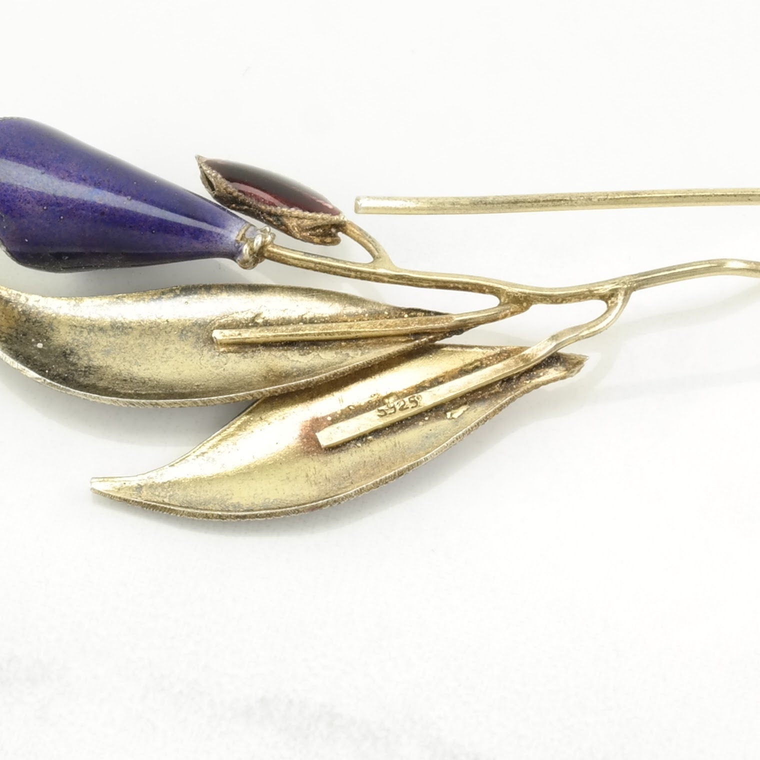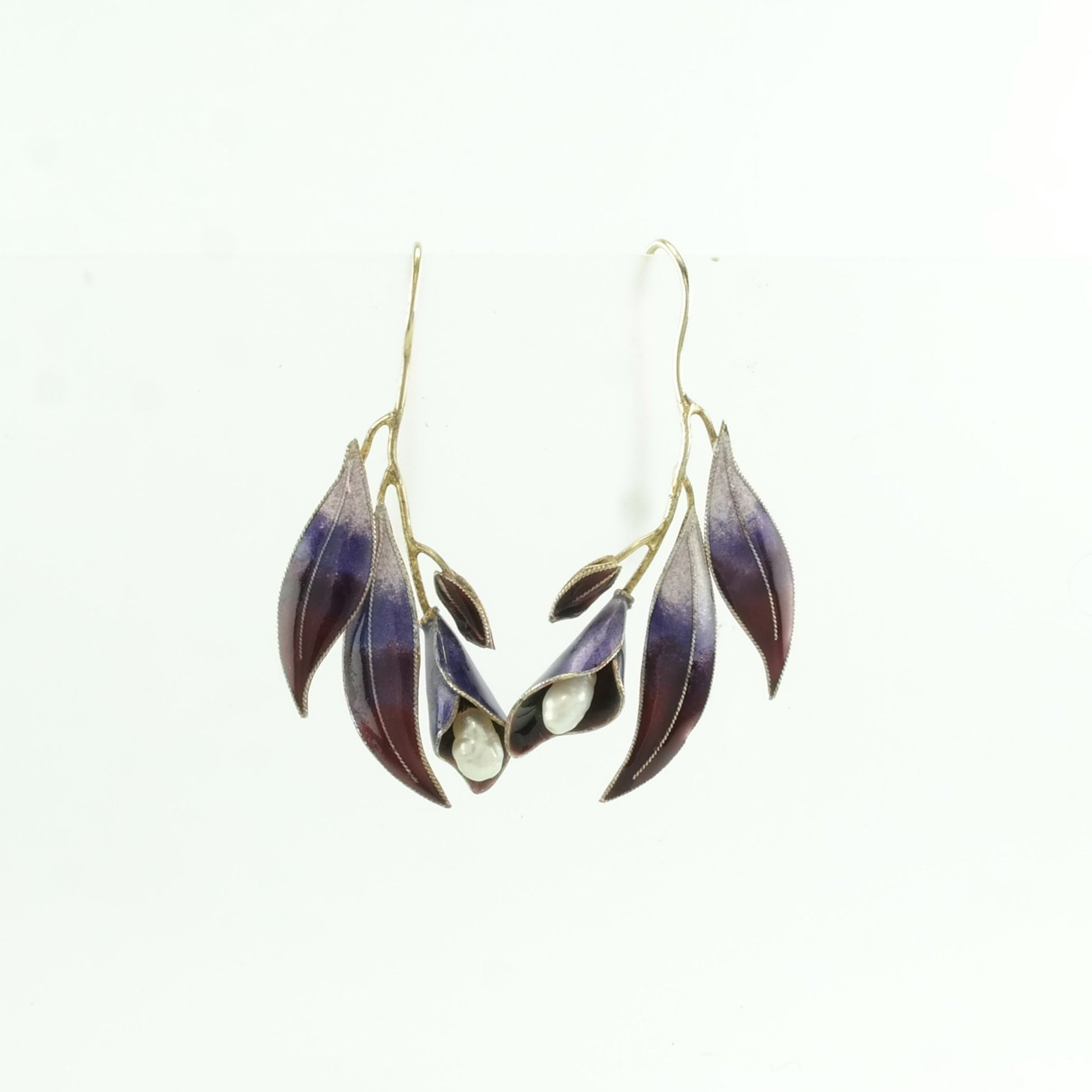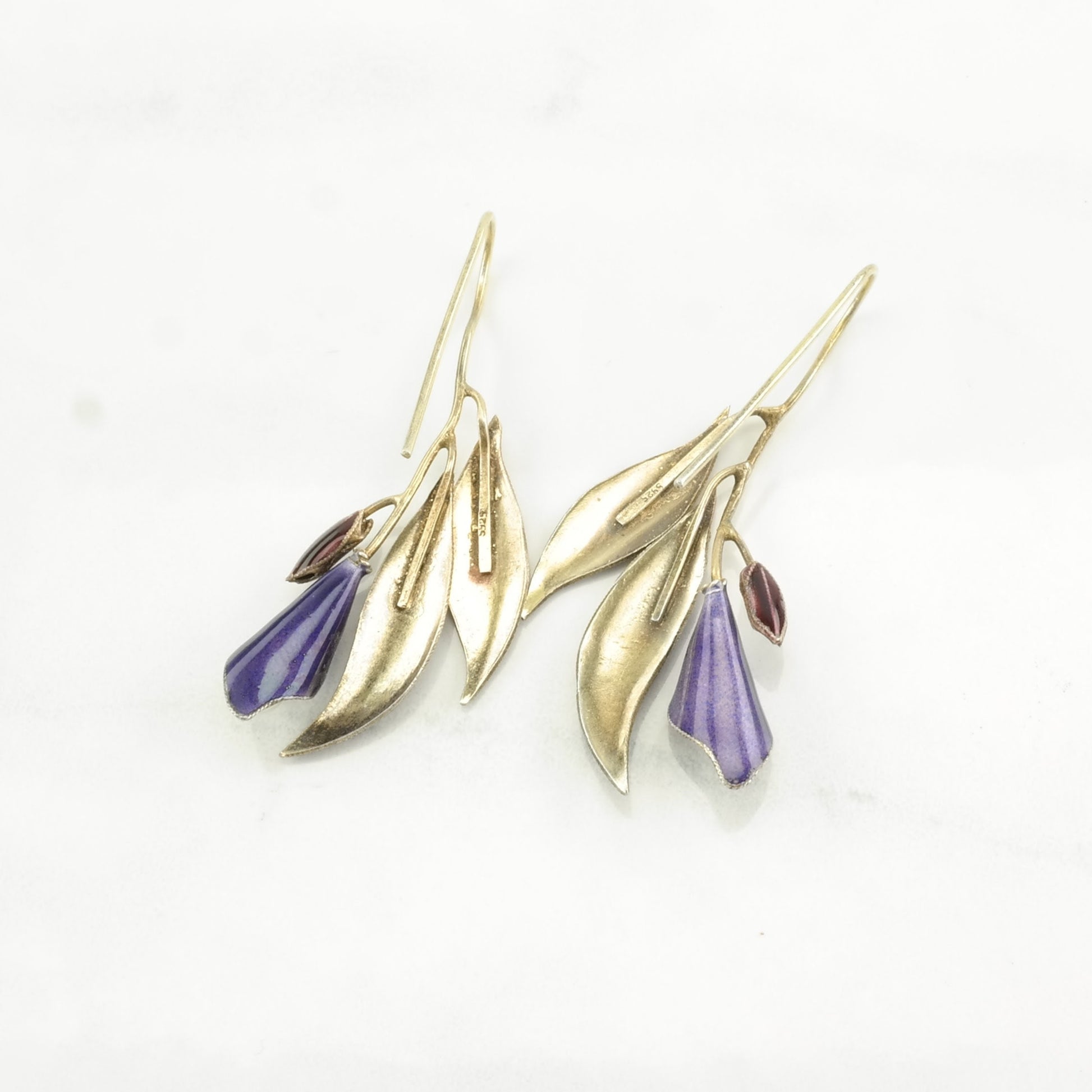 Vintage Sterling Silver Fish hook Earrings Purple Enamel, Pearl Floral
