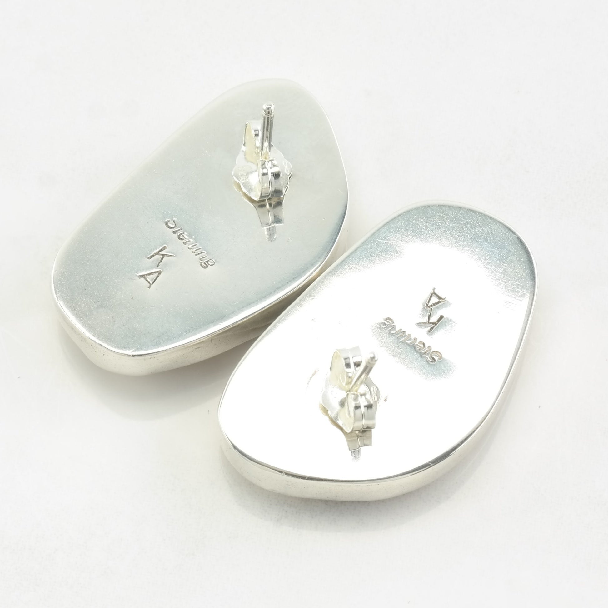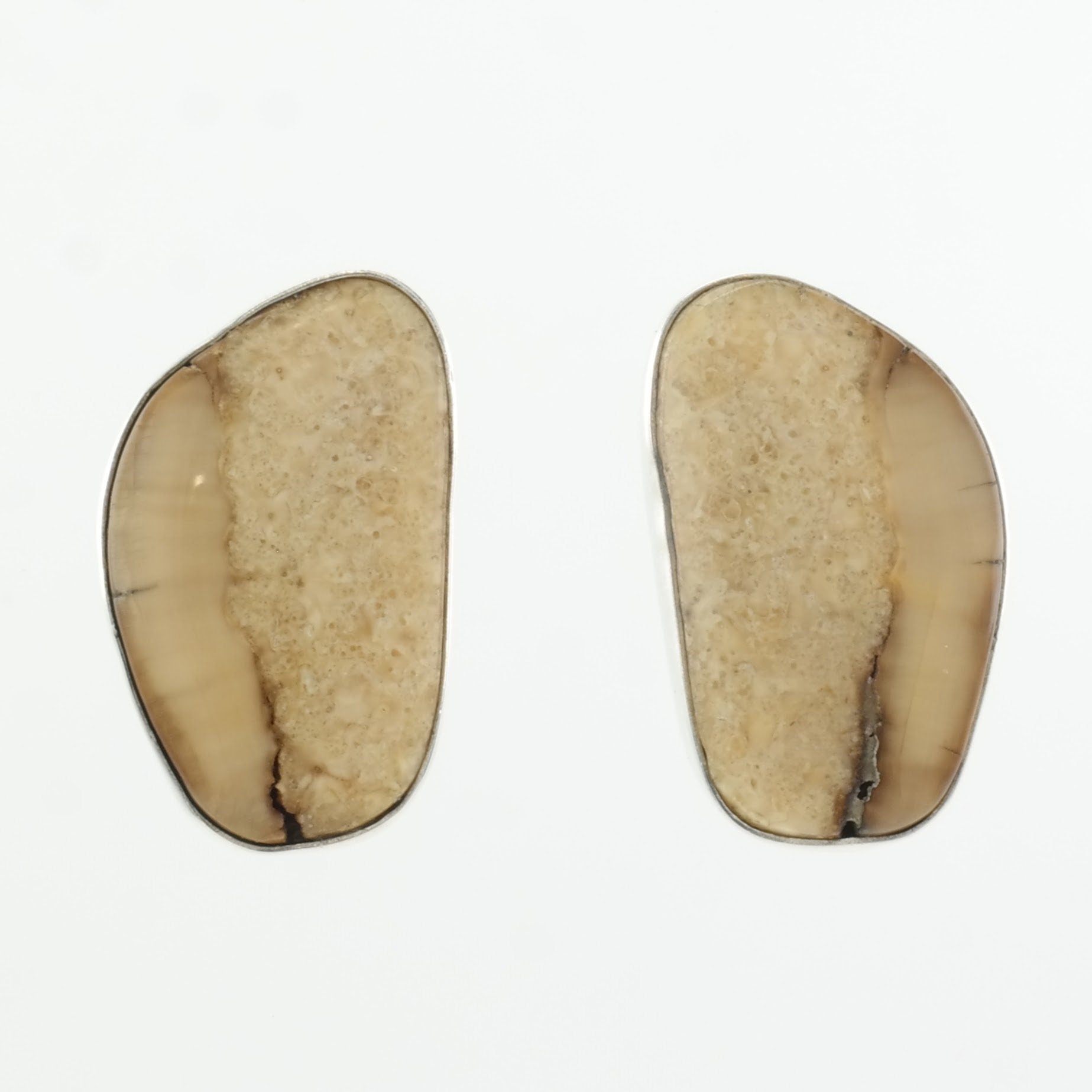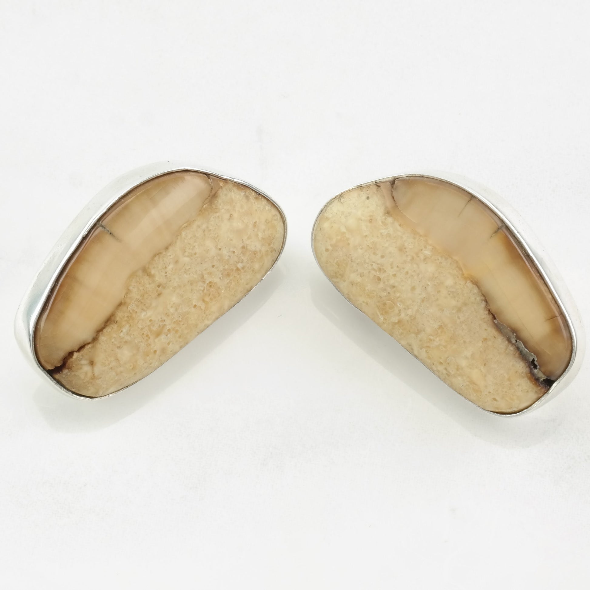 Make a statement with these unique vintage Native American sterling silver pierced earrings from the 1970s. Featuring intriguing beige fossil stones in an organic, freeform shape, these earrings embody the minimalist aesthetic of modernist jewelry. The natural variations and textures within the fossils make each earring truly one-of-a-kind.