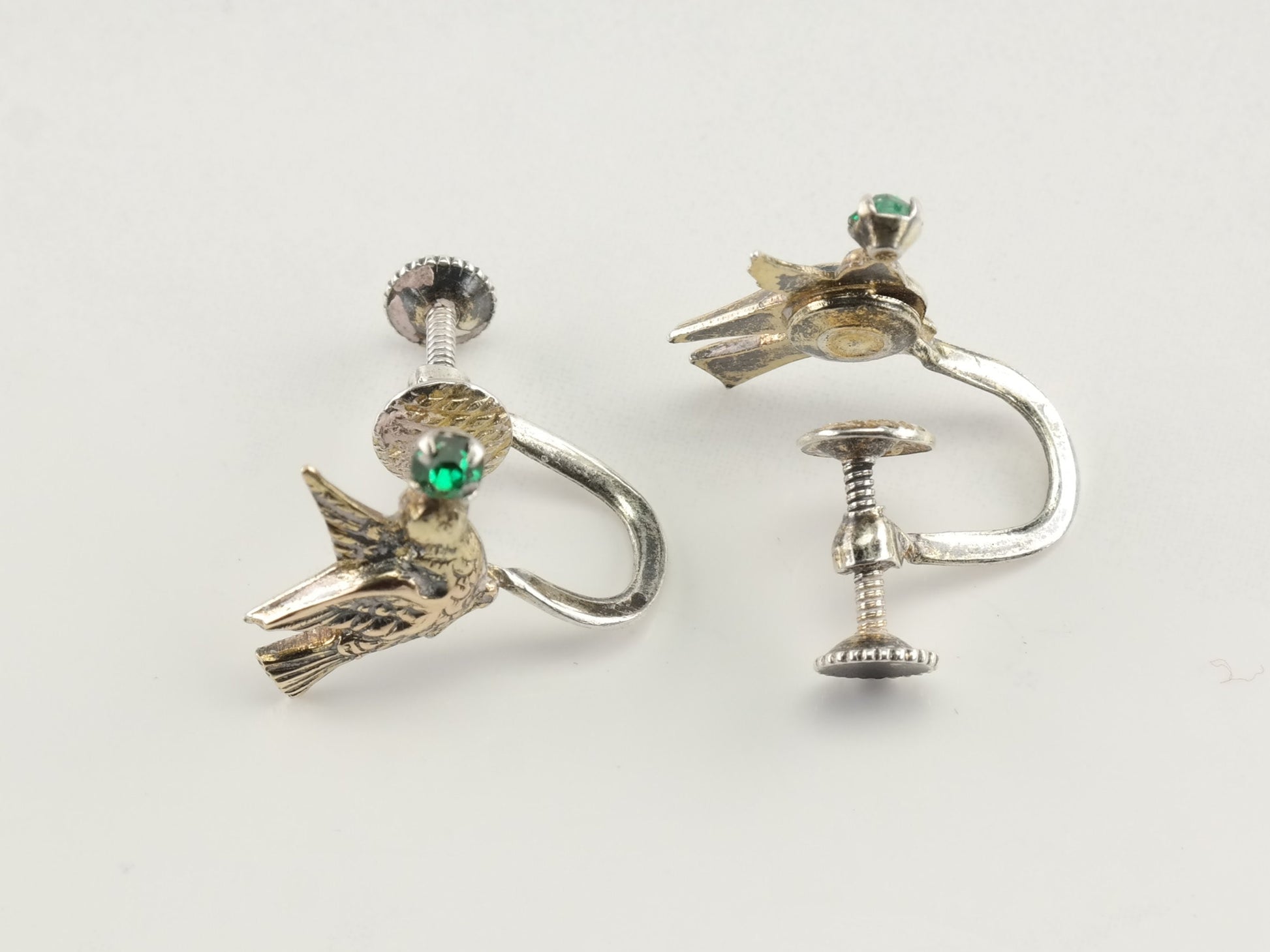 Vintage Sterling Silver Green Rhinestone Bird Earrings Screw Back