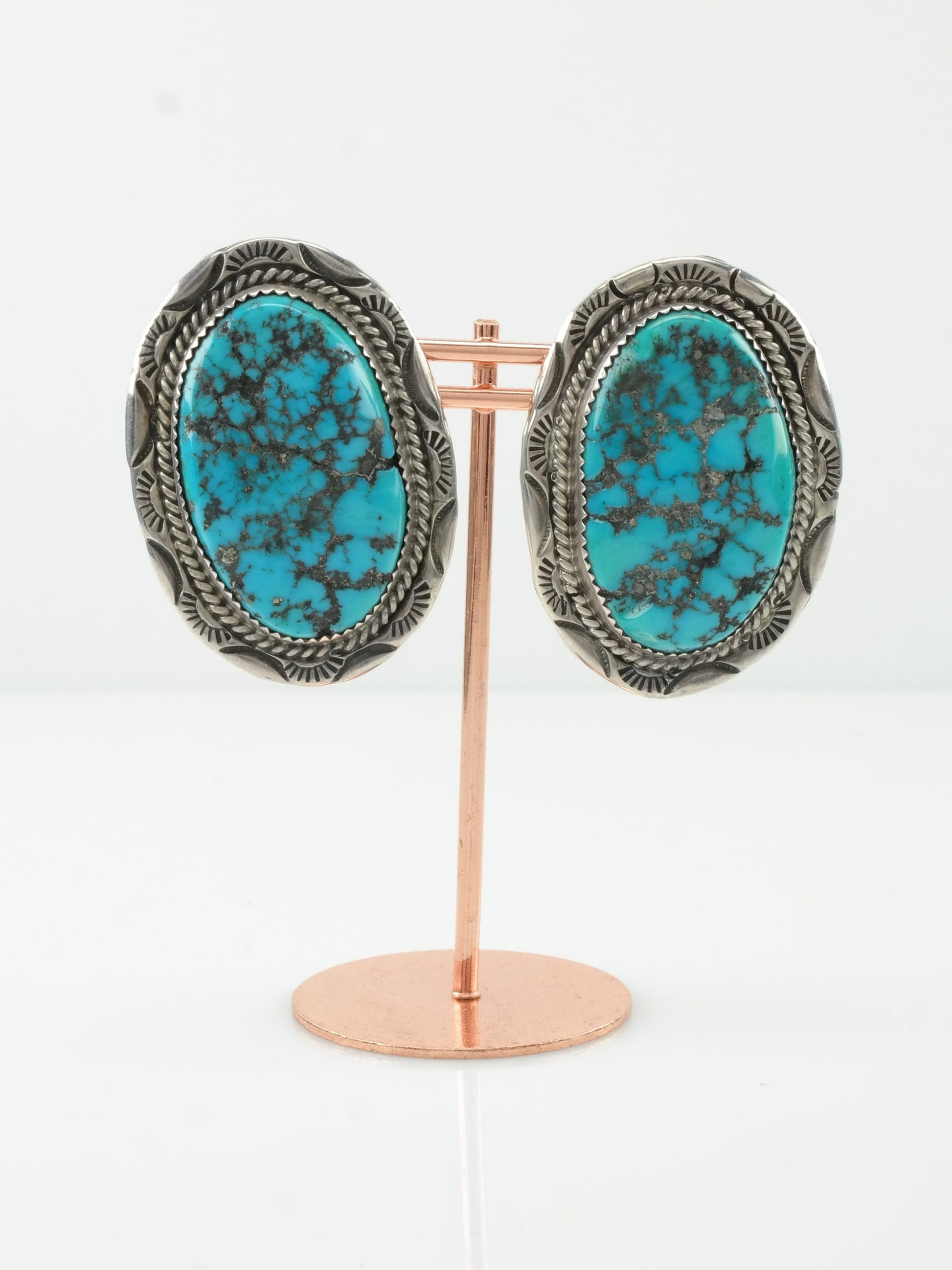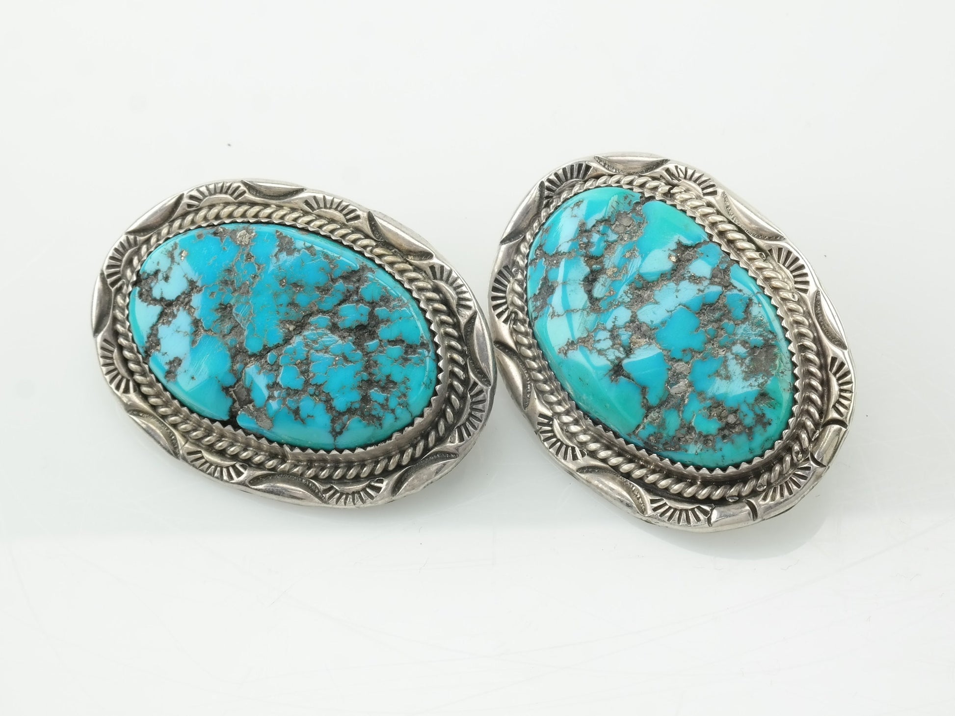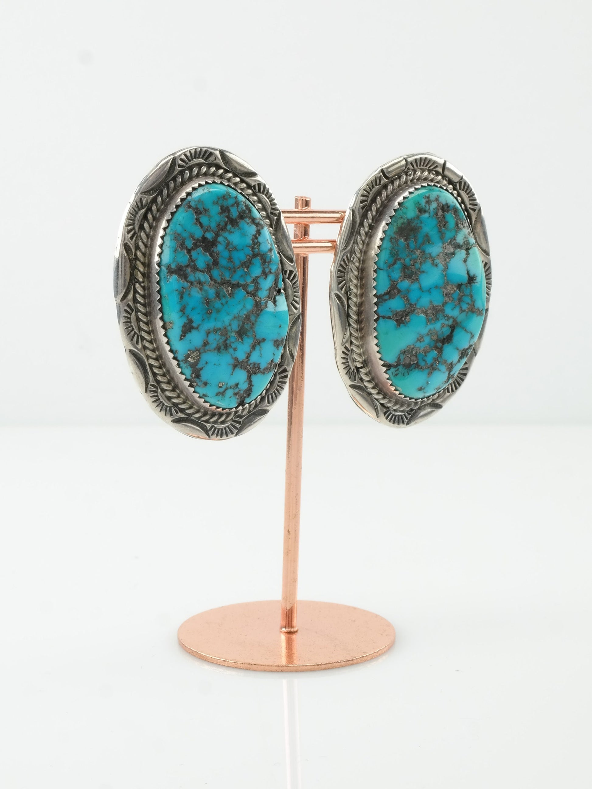 Embrace Southwestern style with these stunning vintage sterling silver earrings. Featuring large oval nuggets of natural Kingman turquoise, these earrings are a true testament to Native American artistry.