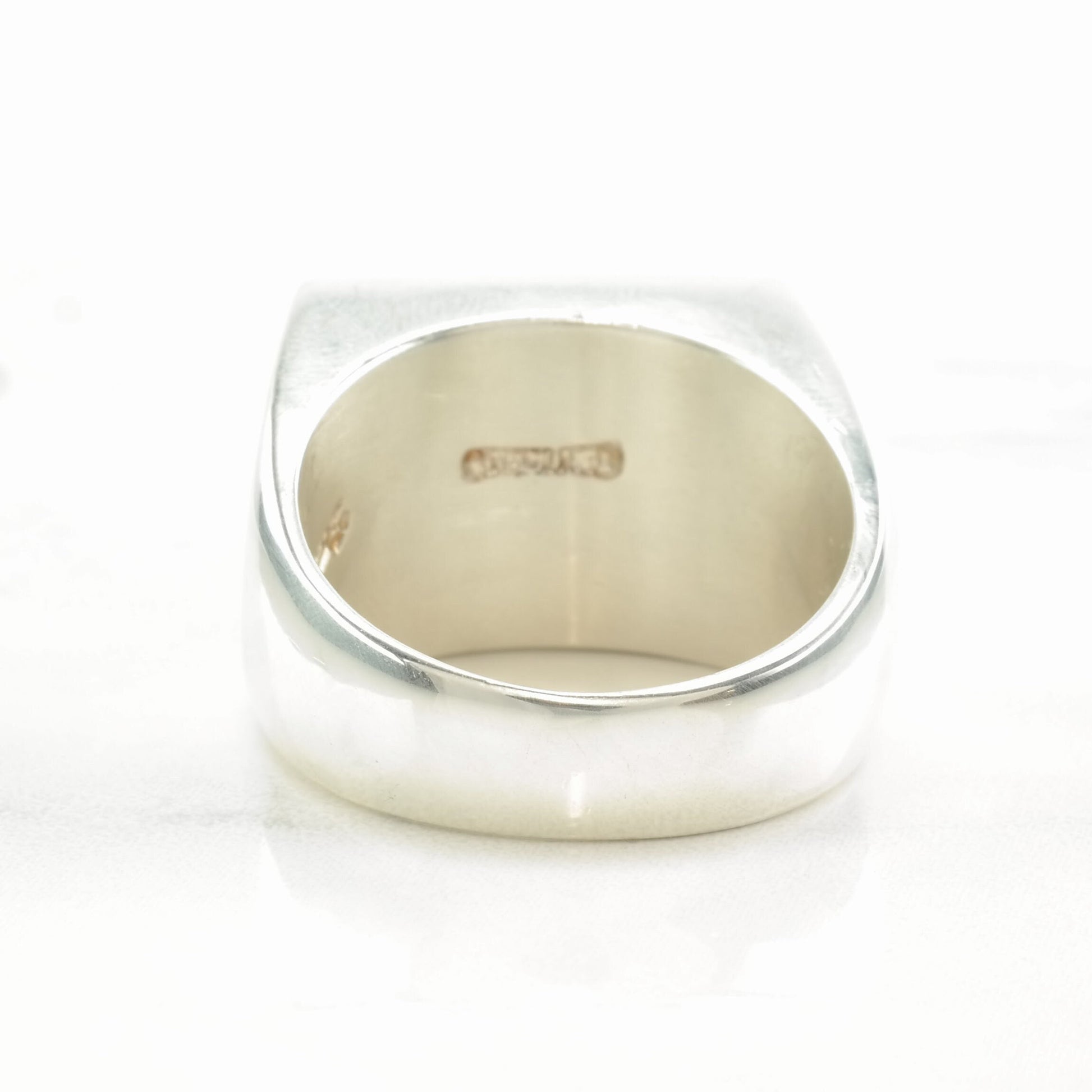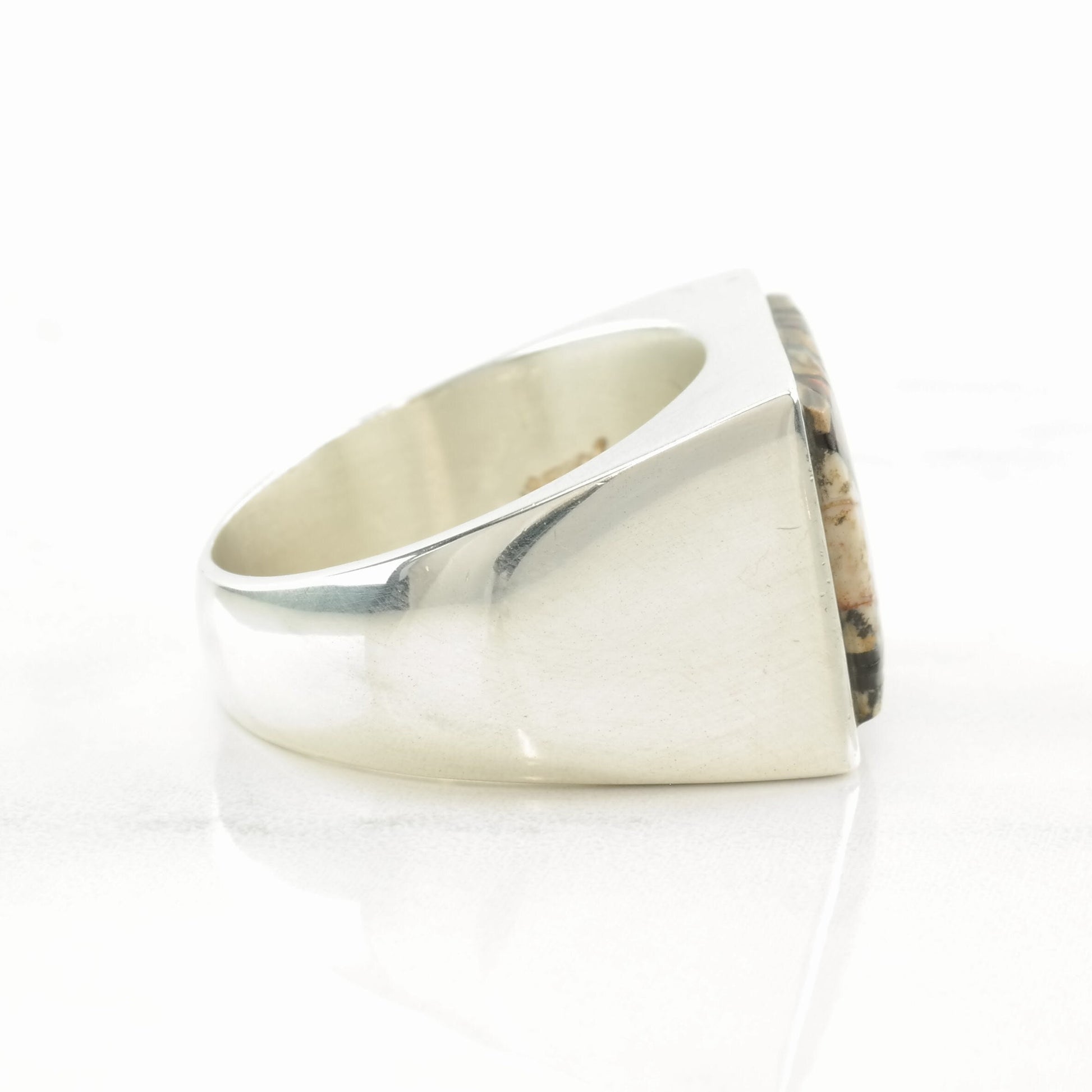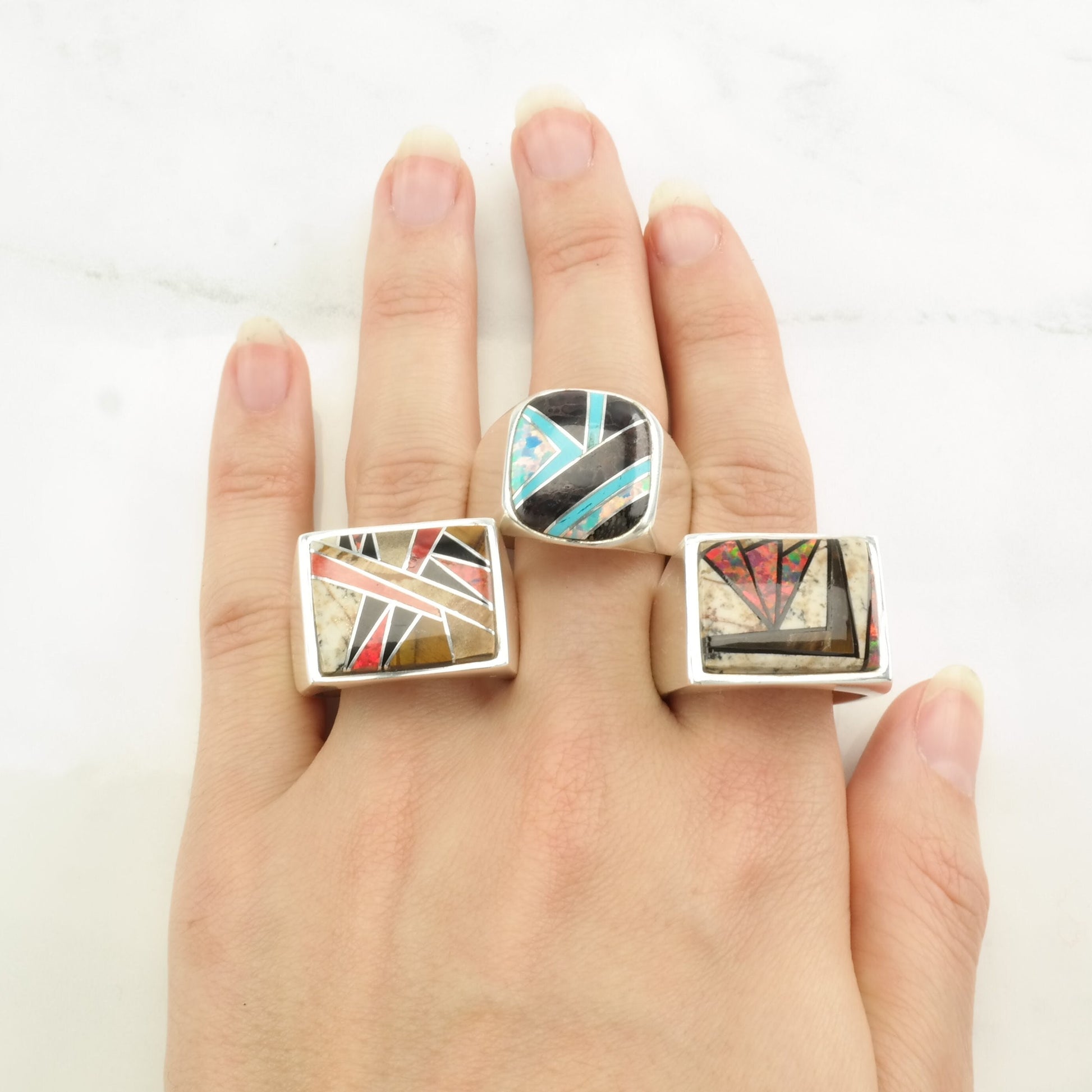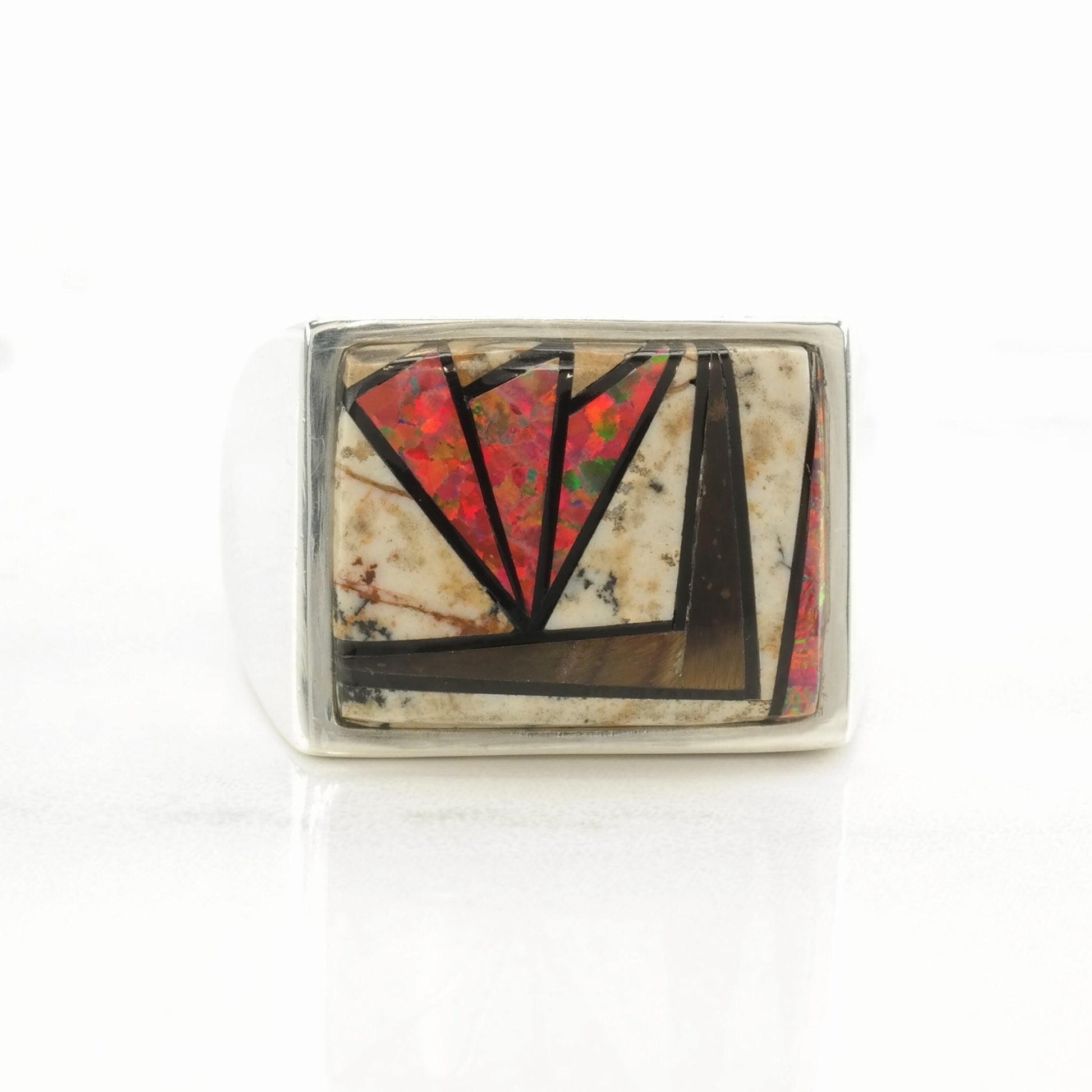 This striking vintage sterling silver ring captures the vibrant colors and textures of the American Southwest. The rectangular face features a captivating inlay of lab opal, natural gemstones, and stabilized materials, creating a mesmerizing mosaic of earthy tones and fiery opalescence. Signed by the artist "Ferris," this ring showcases the beauty of Southwestern artistry.
