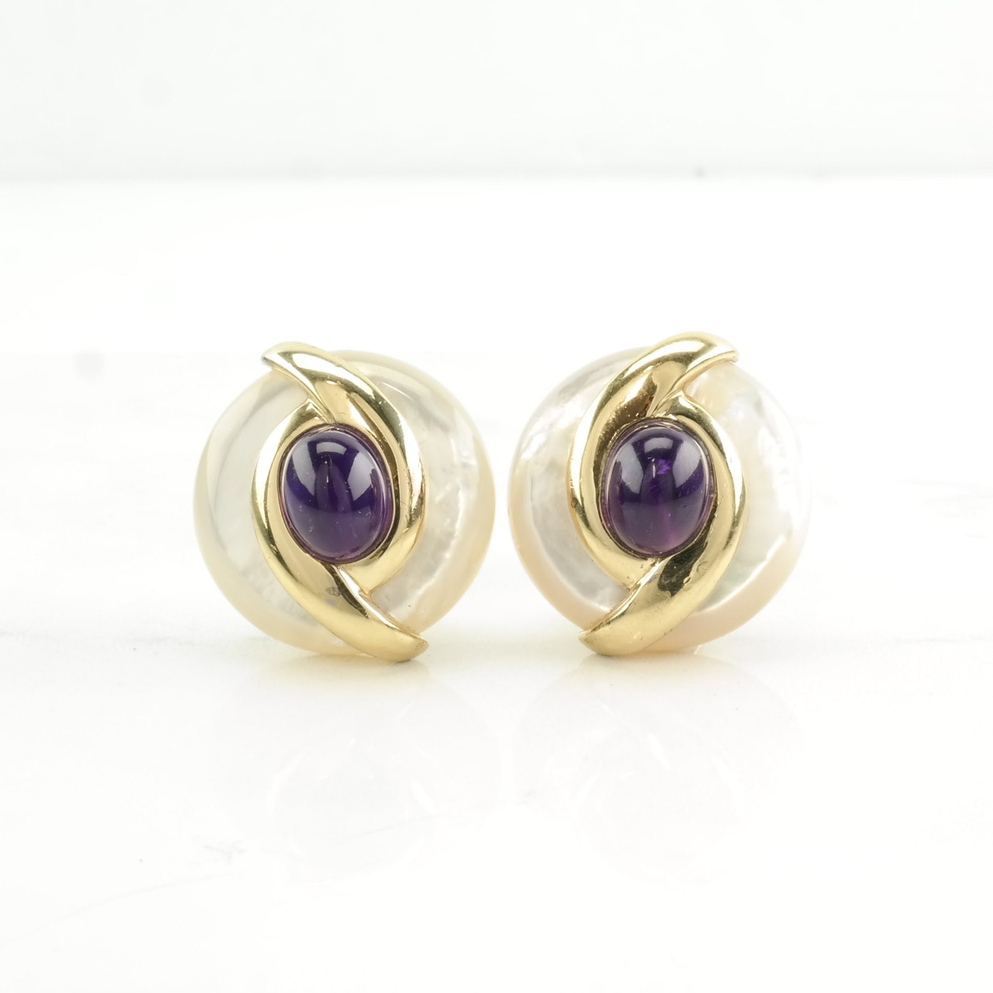 Vintage Sterling Silver Omega back Earrings Purple Amethyst, MOP Gold Toned Accents