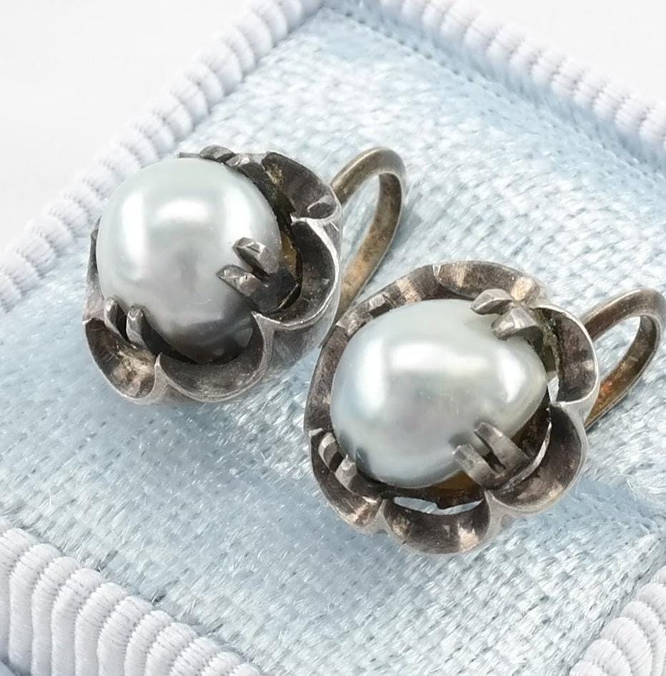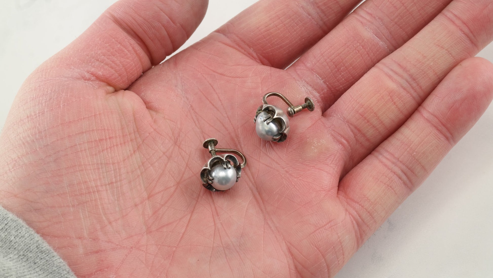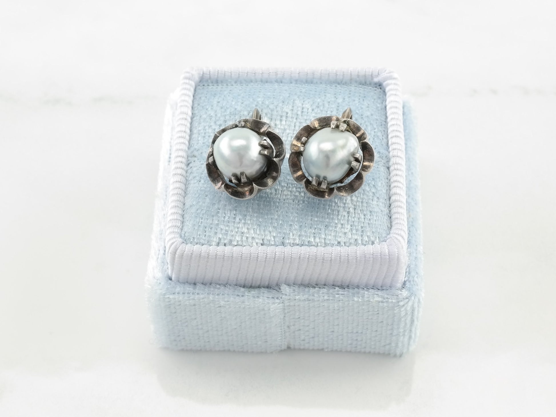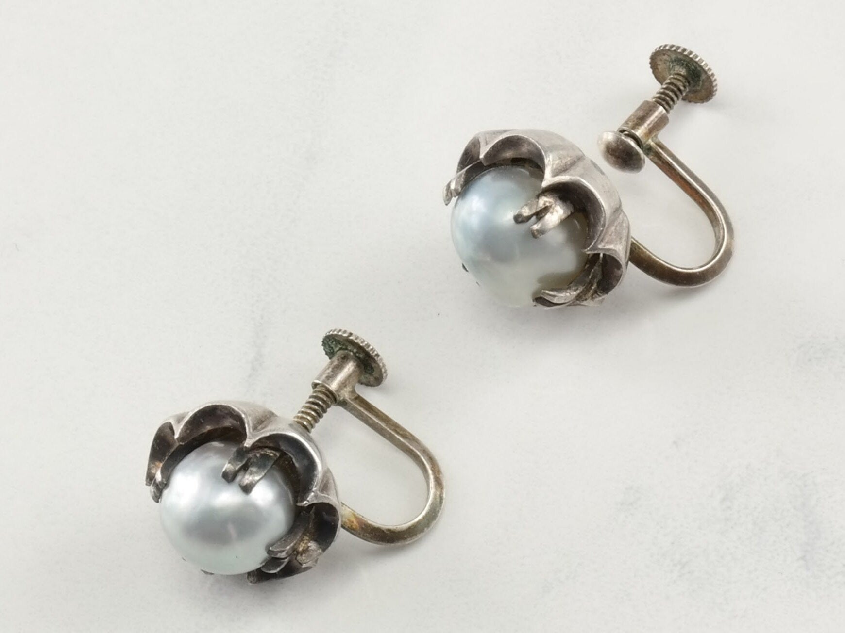 Vintage Sterling Silver Pearl Floral Earrings Screw Back