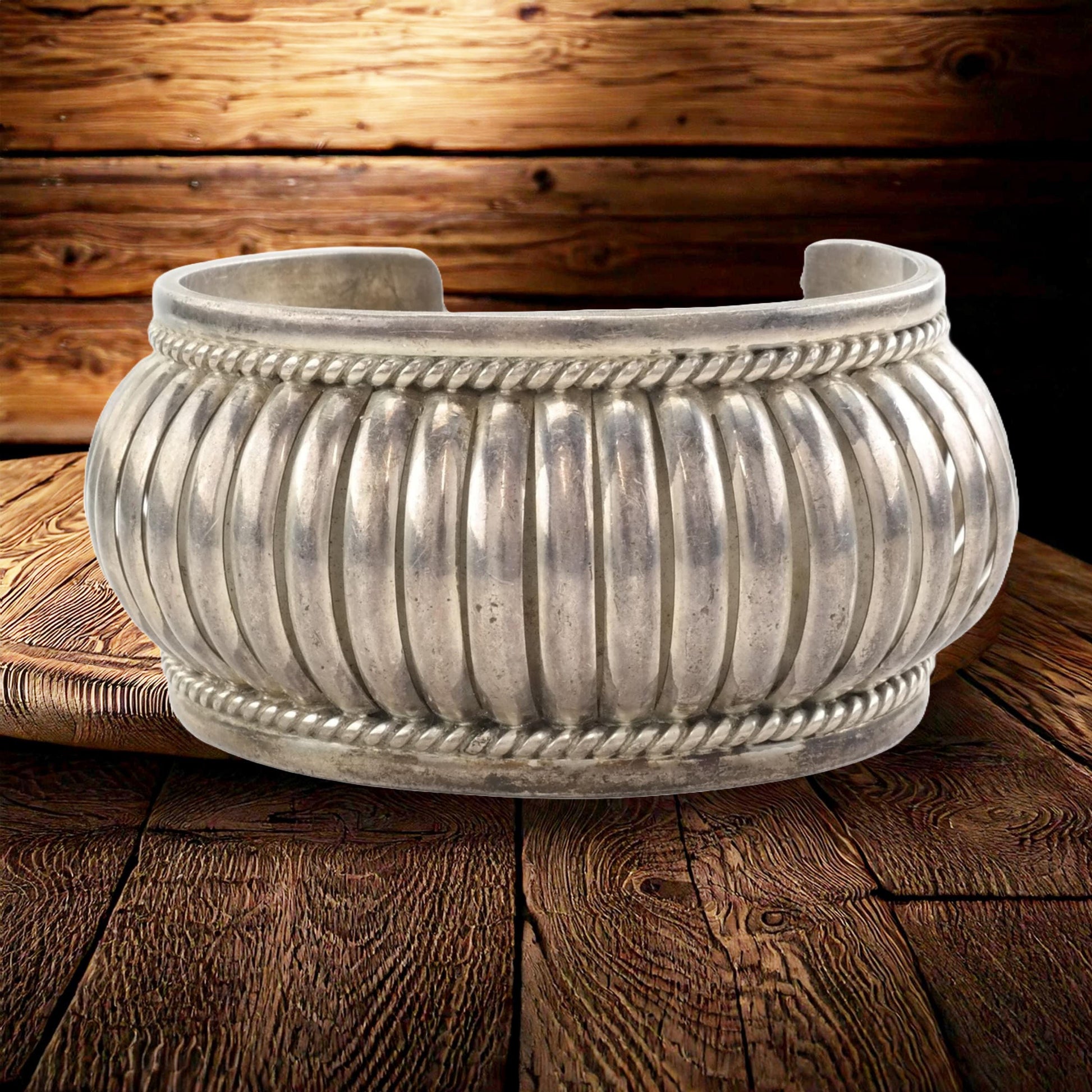 This vintage sterling silver cuff bracelet is a true statement piece. Crafted circa 1980, it features a beautiful scalloped design with a heavy patina, giving it a unique and rustic look.